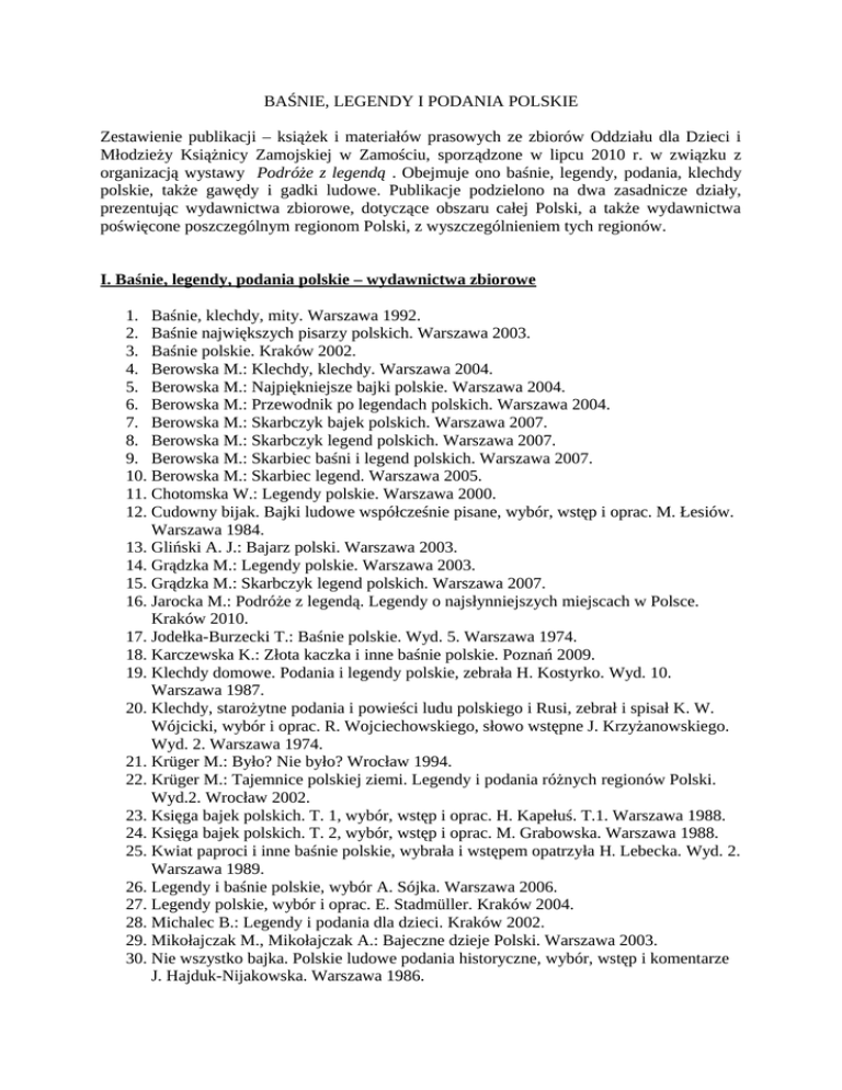BAŚNIE, LEGENDY I PODANIA POLSKIE Zestawienie publikacji – książek i materiałów prasowych ze zbiorów Oddziału dla Dzieci i Młodzieży Książnicy Zamojskiej w Zamościu, sporządzone w lipcu 2010 r. w związku z organizacją wystawy Podróże z legendą . Obejmuje ono baśnie, legendy, podania, klechdy polskie, także gawędy i gadki ludowe. Publikacje podzielono na dwa zasadnicze działy, prezentując wydawnictwa zbiorowe, dotyczące obszaru całej Polski, a także wydawnictwa poświęcone poszczególnym regionom Polski, z wyszczególnieniem tych regionów. I. Baśnie, legendy, podania polskie – wydawnictwa zbiorowe 1. Baśnie, klechdy, mity. Warszawa 1992. 2. Baśnie największych pisarzy polskich. Warszawa 2003. 3. Baśnie polskie. Kraków 2002. 4. Berowska M.: Klechdy, klechdy. Warszawa 2004. 5. Berowska M.: Najpiękniejsze bajki polskie. Warszawa 2004. 6. Berowska M.: Przewodnik po legendach polskich. Warszawa 2004. 7. Berowska M.: Skarbczyk bajek polskich. Warszawa 2007. 8. Berowska M.: Skarbczyk legend polskich. Warszawa 2007. 9. Berowska M.: Skarbiec baśni i legend polskich. Warszawa 2007. 10. Berowska M.: Skarbiec legend. Warszawa 2005. 11. Chotomska W.: Legendy polskie. Warszawa 2000. 12. Cudowny bijak. Bajki ludowe współcześnie pisane, wybór, wstęp i oprac. M. Łesiów. Warszawa 1984. 13. Gliński A. J.: Bajarz polski. Warszawa 2003. 14. Grądzka M.: Legendy polskie. Warszawa 2003. 15. Grądzka M.: Skarbczyk legend polskich. Warszawa 2007. 16. Jarocka M.: Podróże z legendą. Legendy o najsłynniejszych miejscach w Polsce. Kraków 2010. 17. Jodełka-Burzecki T.: Baśnie polskie. Wyd. 5. Warszawa 1974. 18. Karczewska K.: Złota kaczka i inne baśnie polskie. Poznań 2009. 19. Klechdy domowe. Podania i legendy polskie, zebrała H. Kostyrko. Wyd. 10. Warszawa 1987. 20. Klechdy, starożytne podania i powieści ludu polskiego i Rusi, zebrał i spisał K. W. Wójcicki, wybór i oprac. R. Wojciechowskiego, słowo wstępne J. Krzyżanowskiego. Wyd. 2. Warszawa 1974. 21. Krüger M.: Było? Nie było? Wrocław 1994. 22. Krüger M.: Tajemnice polskiej ziemi. Legendy i podania różnych regionów Polski. Wyd.2. Wrocław 2002. 23. Księga bajek polskich. T. 1, wybór, wstęp i oprac. H. Kapełuś. T.1. Warszawa 1988. 24. Księga bajek polskich. T. 2, wybór, wstęp i oprac. M. Grabowska. Warszawa 1988. 25. Kwiat paproci i inne baśnie polskie, wybrała i wstępem opatrzyła H. Lebecka. Wyd. 2. Warszawa 1989. 26. Legendy i baśnie polskie, wybór A. Sójka. Warszawa 2006. 27. Legendy polskie, wybór i oprac. E. Stadmüller. Kraków 2004. 28. Michalec B.: Legendy i podania dla dzieci. Kraków 2002. 29. Mikołajczak M., Mikołajczak A.: Bajeczne dzieje Polski. Warszawa 2003. 30. Nie wszystko bajka. Polskie ludowe podania historyczne, wybór, wstęp i komentarze J. Hajduk-Nijakowska. Warszawa 1986. 31. Nowak Z.: Diabelski strzelec. Polskie baśnie i legendy. Warszawa 1991. 32. Orłoń M., Tyszkiewicz J.: Legendy i podania polskie. Warszawa 1986. 33. Pan Twardowski i inne bajki, oprac. M. Stefańska-Matuszyn, K. Skawina. Warszawa [1996]. 34. Podania i legendy polskie, ruskie i litewskie, zebrał L. Siemieński, wybór, wstęp i oprac. K. Pamuły, słowo wstępne J. Krzyżanowskiego. Warszawa 1975. 35. Polskie baśnie i legendy, wybór G. Leszczyński. Warszawa 2006. 36. Porazińska J.: Czarodziejska księga. Baśnie, bajki, bandurki. Wyd. 4. Warszawa 1985. 37. Sałamacha P.: Baśnie polskie dla najmłodszych. Poznań 2001. 38. Sienkiewicz H.: Baśnie i legendy. Warszawa 1991. 39. Skarbczyk legend, zebrała i oprac. A. Zabłocka. Warszawa 1991. 40. Szczypka J.: Legendy polskie. Warszawa 1983. 41. Świeżawski L.: Klechda o zaczarowanym sercu. Wyd. 2. Warszawa 1981. 42. Świrszczyńska A.: Pan Twardowski i inne opowieści. Warszawa 1984. 43. Świrszczyńska A.: Paź królowej Barbary. Poznań 1987. 44. Torbus A. K.: O królu chłopów, który zastał Polskę drewnianą, a zostawił murowaną; O klejnotach Jadwigi i Krakowskiej Akademii; O dwóch mieczach spod Grunwaldu. Kraków 1987. 45. Torbus A. K.: O państwie księcia Mieszka i koronie króla Chrobrego; O hejnale z wieży mariackiej i koniku zwierzynieckim; O jaskini Łokietka w Ojcowie. Kraków 1987. 46. U złotego źródła. Baśnie polskie, wybór S. Wortman. Wyd. 7. Warszawa 1989. 47. Waglewska B.: Bajki, legendy, opowieści. Warszawa 1984. 48. Wielka księga bajek polskich, wybór tekstów Andrzej Jucewicz. Warszawa 1992. 49. Woda żywa. Baśnie pisarzy polskich, zebrała S. Wortman. Wyd. 7. Warszawa 1990. 50. Wybór podań i legend polskich, wybór i oprac. J. Rodziewicz. Wrocław 1998. 51. Wygonik-Barzyk E.: Baśnie i klechdy polskie. Kraków 2004. 52. Wygonik-Barzyk E.: Najpiękniejsze baśnie polskie. Kraków 2006. 53. Wygonik-Barzyk E.: Podania i legendy polskie. Kraków 2004. 54. Wygonik-Barzyk E.: Polskie baśnie i klechdy. Kraków 2004. 55. Zaklęty pierścień. Baśnie, podania i legendy polskie, zebrała M. Kochanowska. Warszawa 1982. 56. Złoty dzban. Baśnie, podania i legendy polskie. Warszawa 2005. 57. Żak A.: Polskie baśnie i legendy. Katowice 2004. 58. II. Baśnie, legendy, podania z poszczególnych regionów Polski: KALISKA ZIEMIA: 1. Kor-Walczak E.: Baśnie i legendy kaliskie. Wyd. 2. Poznań 1986. KRAKOWSKO-CZĘSTOCHOWSKA JURA: 2. Krüger M.: Ojcowska legenda. „Świerszczyk” 1992 nr 11 s.2-3. 3. Nowak Z.: Grota króla Łokietka. „Świerszczyk” 1992 nr 23 s. 2-4. 4. Wygonik-Barzyk E.: O Maczudze Herkulesa. Kraków [2005]. 5. Zinkow J.: Podania i legendy szlaku jurajskiego. Od Wielunia po Ogrodzieniec, Pilicę. Częstochowa 1986. 6. Żak A.: O pięknej kasztelance, rycerzach, diable Rokicie i Panu Twardowskim oraz inne legendy jurajskie. Katowice 1983. KRAKÓW: 1. Adamczewski J.: Legendy starego Krakowa. Kraków 1985. 2. Bodalska W.: Legenda o krakowskim hejnale. Warszawa 1987. 3. Janczarski C.: O smoku wawelskim. Łódź 1985. 4. Janicki A.: Krakowskie legendy. Kraków 2004. 5. Jaworczakowa 