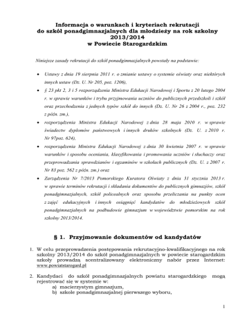 Informacja o warunkach i kryteriach rekrutacji do szkół ponadgimnazjalnych dla młodzieży na rok szkolny 2013/2014 w Powiecie Starogardzkim Niniejsze zasady rekrutacji do szkół ponadgimnazjalnych powstały na podstawie: Ustawy z dnia 19 sierpnia 2011 r. o zmianie ustawy o systemie oświaty oraz niektórych innych ustaw (Dz. U. Nr 205, poz. 1206), § 23 pkt 2, 3 i 5 rozporządzenia Ministra Edukacji Narodowej i Sportu z 20 lutego 2004 r. w sprawie warunków i trybu przyjmowania uczniów do publicznych przedszkoli i szkół oraz przechodzenia z jednych typów szkół do innych (Dz. U. Nr 26 z 2004 r., poz. 232 z późn. zm.), rozporządzenia Ministra Edukacji Narodowej z dnia 28 maja 2010 r. w sprawie świadectw dyplomów państwowych i innych druków szkolnych (Dz. U. z 2010 r. Nr 97poz. 624), rozporządzenia Ministra Edukacji Narodowej z dnia 30 kwietnia 2007 r. w sprawie warunków i sposobu oceniania, klasyfikowania i promowania uczniów i słuchaczy oraz przeprowadzania sprawdzianów i egzaminów w szkołach publicznych (Dz. U. z 2007 r. Nr 83 poz. 562 z późn. zm.) oraz Zarządzenia Nr 7/2013 Pomorskiego Kuratora Oświaty z dnia 31 stycznia 2013 r. w sprawie terminów rekrutacji i składania dokumentów do publicznych gimnazjów, szkół ponadgimnazjalnych, szkół policealnych oraz sposobu przeliczania na punkty ocen z zajęć edukacyjnych i innych osiągnięć kandydatów do młodzieżowych szkół ponadgimnazjalnych na podbudowie gimnazjum w województwie pomorskim na rok szkolny 2013/2014. § 1. Przyjmowanie dokumentów od kandydatów 1. W celu przeprowadzenia postępowania rekrutacyjno-kwalifikacyjnego na rok szkolny 2013/2014 do szkół ponadgimnazjalnych w powiecie starogardzkim szkoły prowadzą scentralizowany elektroniczny nabór przez Internet: www.powiatstarogard.pl 2. Kandydaci do szkół ponadgimnazjalnych powiatu starogardzkiego rejestrować się w systemie w: a) macierzystym gimnazjum, b) szkole ponadgimnazjalnej pierwszego wyboru, mogą 1 c) punkcie informacyjnym o naborze, tj. w Wydziale Edukacji Starostwa Powiatowego w Starogardzie Gdańskim, ul. Kościuszki 17, d) dowolnym innym miejscu, które dysponuje dostępem do Internetu (np. w domu, kawiarence internetowej). 3. W celu przeprowadzenia postępowania rekrutacyjno-kwalifikacyjnego na rok szkolny 2013/2014 do szkół ponadgimnazjalnych, z dniem 16 maja 2013r. rozpoczynają działalność: 1) Szkolne Punkty Informacyjne, mieszczące się w budynkach szkół, w których można uzyskać informacje związane z rekrutacją, a także składać podania o przyjęcie do szkoły, 2) Powiatowy Punkt Informacyjny z siedzibą w budynku Starostwa Powiatowego w Starogardzie Gd. ul. Kościuszki 17, tel. (058) 76 73 576, koordynujący rekrutację. 4. Aktualne informacje dotyczące terminów składania dokumentów, warunków przyjęć i wyników rekrutacji oraz informacje o wolnych miejscach będą zamieszczane na wyodrębnionych tablicach ogłoszeń w szkołach. 5. Kandydaci, składając podania do szkoły, posługują się trzema kopiami świadectwa ukończenia gimnazjum i trzema kopiami zaświadczenia o szczegółowych wynikach egzaminu gimnazjalnego poświadczonymi przez dyrektora gimnazjum, które kandydat ukończył. Oryginały tych dokumentów kandydat składa w terminie, o którym mowa w § 3 ust. 1 pkt. 5. 6. W okresie rekrutacji tj. od od 16 maja do 24 czerwca 2013 r. kandydaci do szkół ponadgimnazjalnych prowadzonych przez Powiat Starogardzki wybierają na stronie internetowej Systemu Elektronicznego Naboru szkoły i klasy, do których chcą być przyjęci: a) Kandydat może wybrać maksymalnie trzy szkoły, b) Kandydat może wybrać dowolną liczbę klas w każdej z wybranych trzech szkół, c) Kandydat ustala kolejność wybranych klas, klas wybrana jako pierwsza jest ta, na której kandydatowi najbardziej zależy. Ostatnia z zaznaczonych to ta, na której kandydatowi najmniej zależy. Są to tzw. preferencje kandydata. Szkoła, prowadząca klasę wybraną jako pierwszą jest traktowana jako szkoła pierwszego wyboru. 7. W systemie rekrutacji elektronicznej kandydat posługuje się kopią świadectwa ukończenia gimnazjum i kopią zaświadczenia o szczegółowych wynikach egzaminu gimnazjalnego opatrzonymi numerem "1". Na życzenie ucznia lub jego rodzica (prawnego opiekuna) dyrektor gimnazjum zobowiązany jest wydać pozostałe kopie obu ww. dokumentów opatrzone odpowiednio numerami "2" i "3", które mogą być wykorzystane w rekrutacji poza systemem elektronicznym. 8. Po wyborze szkół Kandydaci ubiegający się o przyjecie do szkół ponadgimnazjalnych, biorących udział w elektronicznym naborze , składają w terminie rekrutacji w pierwszej z wybranych szkół : 1) podanie o przyjęcie do szkoły wydrukowane z Systemu Elektronicznego Naboru podpisane przez rodziców lub prawnych opiekunów 2) poświadczoną kopię świadectwa ukończenia gimnazjum opatrzoną nr "1", 3) poświadczoną kopię zaświadczenia wynikach egzaminu gimnazjalnego opatrzoną nr "1", 2 4) zaświadczenie o uzyskaniu tytułu laureata lub finalisty olimpiad lub konkursów, o których mowa w § 2 ust 4, pkt 3, litera "b". 9. Oryginał świadectwa ukończenia gimnazjum wraz z oryginałem zaświadczenia o szczegółowych wynikach egzaminu gimnazjalnego należy złożyć w wybranej szkole, w której uczeń potwierdza wolę podjęcia nauki. 10. Do oryginałów dokumentów należy dołączyć: 1) dwie fotografie, 2) zaświadczenie lekarskie o braku przeciwwskazań zdrowotnych do kształcenia w wybranym zawodzie – dotyczy szkół ponadgimnazjalnych zawodowych w tym zasadniczej szkoły zawodowej specjalnej, 3) umowę o pracę lub zaświadczenie od pracodawcy o zamiarze zawarcia umowy o pracę w celu przygotowania zawodowego w celu nauki zawodu z dniem 1 września 2013 r. (dotyczy uczniów pracowników młodocianych) zgodnie z: rozporządzeniem MEN z dnia 15 grudnia 2010 r. w sprawie praktycznej nauki zawodu (Dz.U. 244, poz. 1626), rozporzą