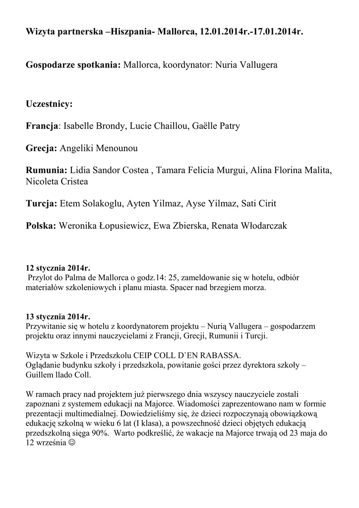 Wizyta partnerska –Hiszpania- Mallorca, 12.01.2014r.-17.01.2014r. Gospodarze spotkania: Mallorca, koordynator: Nuria Vallugera Uczestnicy: Francja: Isabelle Brondy, Lucie Chaillou, Gaёlle Patry Grecja: Angeliki Menounou Rumunia: Lidia Sandor Costea , Tamara Felicia Murgui, Alina Florina Malita, Nicoleta Cristea Turcja: Etem Solakoglu, Ayten Yilmaz, Ayse Yilmaz, Sati Cirit Polska: Weronika Łopusiewicz, Ewa Zbierska, Renata Włodarczak 12 stycznia 2014r. Przylot do Palma de Mallorca o godz.14: 25, zameldowanie się w hotelu, odbiór materiałów szkoleniowych i planu miasta. Spacer nad brzegiem morza. 13 stycznia 2014r. Przywitanie się w hotelu z koordynatorem projektu – Nurią Vallugera – gospodarzem projektu oraz innymi nauczycielami z Francji, Grecji, Rumunii i Turcji. Wizyta w Szkole i Przedszkolu CEIP COLL D`EN RABASSA. Oglądanie budynku szkoły i przedszkola, powitanie gości przez dyrektora szkoły – Guillem llado Coll. W ramach pracy nad projektem już pierwszego dnia wszyscy nauczyciele zostali zapoznani z systemem edukacji na Majorce. Wiadomości zaprezentowano nam w formie prezentacji multimedialnej. Dowiedzieliśmy się, że dzieci rozpoczynają obowiązkową edukację szkolną w wieku 6 lat (I klasa), a powszechność dzieci objętych edukacją przedszkolną sięga 90%. Warto podkreślić, że wakacje na Majorce trwają od 23 maja do 12 września ☺ Po lunchu , zaproponowano nam spacer po Palma de Mallorca. Stolica Majorki jest ośrodkiem sztuki, centrum turystycznym i rajem zakupowym., to nowoczesne miasto z bogatą tradycją – duma każdego Majorkanina. Obowiązkowym punktem programu okazało się Stare Miasto:Katedra(1230 – 1600), która uchodzi za jedną z najpiękniejszych świątyń w Hiszpanii;Pałac de I`Almudaina, który jest mieszanką stylów aragońskich i arabskich oraz zamek Bellver. 14 stycznia 2014r. Kolejny dzień w szkole to praca nad projektem, omówiliśmy terminy kolejnych wizyt nauczycieli w pozostałych krajach: Polska od 19 do 23 maja 2014r., Rumunia – październik 2014r., Turcja – styczeń 2015r., Grecja- maj 2015r. Odwoływano się do strony internetowej naszego projektu i materiałów tam zamieszczanych. Uzgodniono również jednolity sposób rejestrowania przygotowywanych dań w placówkach według oryginalnego przepisu (prezentacja, film). Omówiono wygląd słownika produktów w języku projektu oraz ojczystym i sposób jego wykonania. Po pracy nad projektem zostaliśmy zaproszeni do wykonania wspólnie z dziećmi tradycyjnej potrawy z Majorki – PANADES. Pilnie przyglądaliśmy się jak należy przyrządzić danie, formowaliśmy ciasto, pomagaliśmy nakładać farsz dzieciom. Filmowaliśmy i fotografowaliśmy etapy pracy, by utrwalić, a następnie po powrocie do kraju upiec Panades razem z dziećmi. Przyjemność naszej pracy była podwójna, bowiem już po godzinie mogliśmy zachwycać się smakiem nowej potrawy, panades podano na lunch. Po tak pracowitym dniu, nadszedł czas na spacer brzegiem morza i powrót do hotelu. 15 stycznia 2014r. Środa była dla nas dniem przeznaczonym na poznanie stolicy Palma de Mallorca oraz uroków najbliższej okolicy. Po śniadaniu wszyscy goście zebrali się w hotelowym holu. Mniej więcej o godz. 9:30 pod hotel podjechał bus z naszymi koleżankami i kolegami z mallorcańskiej szkoły. Pierwszym punktem wycieczki było zwiedzanie katedry Św. Marii „Le Seu”, która znajduję się w stolicy Palma de Mallorca i przyległego do niej muzeum sakralnego. Katedrę otaczają piękne rezydencje i budynki. Jeżeli dojdziemy do niej od strony miasta nie widać, że jest taka ogromna. Jednak, gdy oglądamy ją stojąc na brzegu morza widać jej potęgę. Katedra ma 6,6 tysięcy m2 powierzchni. Ma 121 metrów długości, 55 metrów wysokości i 44 wysokości. Nawa główna jest ozdobiona przepiękną rozetą nad ołtarzem o wielkości 90 m2 i średnicy 12 metrów. Składa się z 1236 kawałków kolorowego szkła. Prawdopodobnie jest to największa rozeta na świecie. Z pod katedry wyruszyliśmy w góry Sierra de Tramuntana. Przejście przez pasmo prowadziło starym rzymskim, kamienistym szlakiem, który w dawnych czasach służył do transportowania towarów. Obecnie jest szlakiem turystycznym, z którego roztaczają się przepiękne widoki na górskie doliny, a po wejściu na szczyt na Morze Śródziemne oraz leżące nad brzegiem wioski domy z tarasowymi poletkami. Po zejściu w dolinę do miejscowości Banyalbufar zjedliśmy lunch składający się z tradycyjnych katalońskich potraw: smażone w panierce kalmary, gęsta zupa z ryżem i kawałkami kurczaka, a na deser ciasto migdałowe. Następnie pojechaliśmy do niewielkiej hiszpańskiej miejscowości Valdemossa, znanej z udostępnionej do zwiedzania ekspozycji poświęconej Fryderykowi Chopinowi, który mieszkał w niej wraz ze swoją towarzyszka George Sand. 21 września 1998 królowa Hiszpanii Zofia i żona prezydenta RP Jolanta Kwaśniewska odsłoniły popiersie Fryderyka Chopina dłuta Zofii Wolskiej, upamiętniające pobyt kompozytora od listopada 1838 do lutego 1839. Mięliśmy także okazję zobaczyć na żywo występy miejscowego zespołu ludowego i wykonywane przez tancerzy regionalne tańce. Po dniu pełnym przeżyć i wrażeń zmęczeni, ale zadowoleni wróciliśmy około godz:18:00 do hotelu. 16 stycznia 2014 Tego dnia w planie wizyty były hospitacje i obserwacje zajęć w przedszkolu. Uczestnicy podzieleni zostali na sześć grup po 2-3 osoby. Każda grupa obserwowała zajęcia dzieci 3, 4 i 5-cio letnich, przechodząc z grupy do grupy co 45 min. Mieliśmy możliwość przyjrzenia się w jaki sposób pracują z dziećmi nasze hiszpańskie koleżanki i koledzy. Zajęcia rozpoczynają się o godz. 9:15, a kończą o godz.14:15. Nauczyciele pracują głównie Metodą Projektu – jeden temat trwa zazwyczaj miesiąc. Stopień trudności zadań do projektu uzależniony jest od grupy wiekowej i możliwości dzieci. Ciekawą rzeczą 