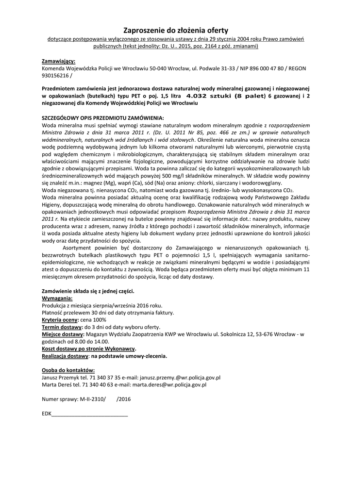 Zaproszenie do złożenia oferty dotyczące postępowania wyłączonego ze stosowania ustawy z dnia 29 stycznia 2004 roku Prawo zamówień publicznych (tekst jednolity: Dz. U.. 2015, poz. 2164 z póź. zmianami) Zamawiający: Komenda Wojewódzka Policji we Wrocławiu 50-040 Wrocław, ul. Podwale 31-33 / NIP 896 000 47 80 / REGON 930156216 / Przedmiotem zamówienia jest jednorazowa dostawa naturalnej wody mineralnej gazowanej i niegazowanej w opakowaniach (butelkach) typu PET o poj. 1,5 litra 4.032 sztuki (8 palet) 6 gazowanej i 2 niegazowanej dla Komendy Wojewódzkiej Policji we Wrocławiu SZCZEGÓŁOWY OPIS PRZEDMIOTU ZAMÓWIENIA: Woda mineralna musi spełniać wymogi stawiane naturalnym wodom mineralnym zgodnie z rozporządzeniem Ministra Zdrowia z dnia 31 marca 2011 r. (Dz. U. 2011 Nr 85, poz. 466 ze zm.) w sprawie naturalnych wódmineralnych, naturalnych wód źródlanych i wód stołowych. Określenie naturalna woda mineralna oznacza wodę podziemną wydobywaną jednym lub kilkoma otworami naturalnymi lub wierconymi, pierwotnie czystą pod względem chemicznym i mikrobiologicznym, charakteryzującą się stabilnym składem mineralnym oraz właściwościami mającymi znaczenie fizjologiczne, powodującymi korzystne oddziaływanie na zdrowie ludzi zgodnie z obowiązującymi przepisami. Woda ta powinna zaliczać się do kategorii wysokozmineralizowanych lub średniozmineralizownych wód mających powyżej 500 mg/l składników mineralnych. W składzie wody powinny się znaleźć m.in.: magnez (Mg), wapń (Ca), sód (Na) oraz aniony: chlorki, siarczany i wodorowęglany. Woda niegazowana tj. nienasycona CO2, natomiast woda gazowana tj. średnio- lub wysokonasycona CO2. Woda mineralna powinna posiadać aktualną ocenę oraz kwalifikację rodzajową wody Państwowego Zakładu Higieny, dopuszczającą wodę mineralną do obrotu handlowego. Oznakowanie naturalnych wód mineralnych w opakowaniach jednostkowych musi odpowiadać przepisom Rozporządzenia Ministra Zdrowia z dnia 31 marca 2011 r. Na etykiecie zamieszczonej na butelce powinny znajdować się informacje dot.: nazwy produktu, nazwy producenta wraz z adresem, nazwy źródła z którego pochodzi i zawartość składników mineralnych, informacje iż woda posiada aktualne atesty higieny lub dokument wydany przez jednostki uprawnione do kontroli jakości wody oraz datę przydatności do spożycia. Asortyment powinien być dostarczony do Zamawiającego w nienaruszonych opakowaniach tj. bezzwrotnych butelkach plastikowych typu PET o pojemności 1,5 l, spełniających wymagania sanitarnoepidemiologiczne, nie wchodzących w reakcje ze związkami mineralnymi będącymi w wodzie i posiadającymi atest o dopuszczeniu do kontaktu z żywnością. Woda będąca przedmiotem oferty musi być objęta minimum 11 miesięcznym okresem przydatności do spożycia, licząc od daty dostawy. Zamówienie składa się z jednej części. Wymagania: Produkcja z miesiąca sierpnia/września 2016 roku. Płatność przelewem 30 dni od daty otrzymania faktury. Kryteria oceny: cena 100% Termin dostawy: do 3 dni od daty wyboru oferty. Miejsce dostawy: Magazyn Wydziału Zaopatrzenia KWP we Wrocławiu ul. Sokolnicza 12, 53-676 Wrocław - w godzinach od 8.00 do 14.00. Koszt dostawy po stronie Wykonawcy. Realizacja dostawy: na podstawie umowy-zlecenia. Osoba do kontaktów: Janusz Przemyk tel. 71 340 37 35 e-mail: [email protected] Marta Dereś tel. 71 340 40 63 e-mail: [email protected] Numer sprawy: M-II-2310/ /2016 EDK__________________________