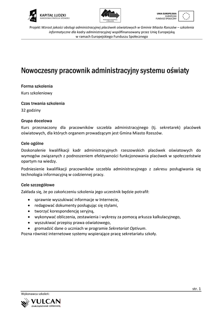 Projekt Wzrost jakości obsługi administracyjnej placówek oświatowych w Gminie Miasto Rzeszów – szkolenia informatyczne dla kadry administracyjnej współfinansowany przez Unię Europejską w ramach Europejskiego Funduszu Społecznego Nowoczesny pracownik administracyjny systemu oświaty Forma szkolenia Kurs szkoleniowy Czas trwania szkolenia 32 godziny Grupa docelowa Kurs przeznaczony dla pracowników szczebla administracyjnego (tj. sekretarek) placówek oświatowych, dla których organem prowadzącym jest Gmina Miasto Rzeszów. Cele ogólne Doskonalenie kwalifikacji kadr administracyjnych rzeszowskich placówek oświatowych do wymogów związanych z podnoszeniem efektywności funkcjonowania placówek w społeczeństwie opartym na wiedzy. Podniesienie kwalifikacji pracowników szczebla administracyjnego z zakresu posługiwania się technologia informacyjną w codziennej pracy. Cele szczegółowe Zakłada się, że po zakończeniu szkolenia jego uczestnik będzie potrafił: • sprawnie wyszukiwać informacje w Internecie, • redagować dokumenty posługując się stylami, • tworzyć korespondencję seryjną, • wykonywać obliczenia, zestawienia i wykresy za pomocą arkusza kalkulacyjnego, • wyszukiwać przepisy prawa oświatowego, • gromadzić dane o uczniach w programie Sekretariat Optivum. Pozna również internetowe systemy wspierające pracę sekretariatu szkoły. str. 1 Wykonawca szkoleń: Projekt Wzrost jakości obsługi administracyjnej placówek oświatowych w Gminie Miasto Rzeszów – szkolenia informatyczne dla kadry administracyjnej współfinansowany przez Unię Europejską w ramach Europejskiego Funduszu Społecznego Tematyka i plan szkolenia Temat Sposób realizacji Liczba godzin Aplikacja dyskusja 1 ćwiczenia przy komputerze 6 Microsoft Office Word 2007, konwerter PDF (np. PDFCreator), Adobe Reader ćwiczenia przy komputerze 1 Microsoft Office Word 2007 ćwiczenia przy komputerze 8 Microsoft Office Excel 2007 ćwiczenia przy komputerze, wykład, pokaz 3 Przeglądarka Windows Internet Explorer pokaz, wykład, dyskusja, ćwiczenia przy komputerze 4 Platforma Optivum NET, DEU ćwiczenia przy komputerze 1 Prawo Optivum DZIEŃ 1 1. Podstawowe zadania sekretariatu w placówce oświatowej 2. Redagowanie dokumentów, pism, listów a) Stosowanie stylów b) Praca z tabelami c) Formatowanie stron dokumentu d) Dodawanie nagłówka i stopki 3. e) Grupowa praca nad dokumentem f) Tworzenie i stosowanie szablonów dokumentów g) Eksport dokumentów do formatu PDF Korespondencja seryjna DZIEŃ 2 4. Opracowywanie danych liczbowych za pomocą arkusza kalkulacyjnego Excel 2007 a) Budowanie arkuszy kalkulacyjnych b) Formatowanie tabel i wykresów 5. Gromadzenie, przetwarzanie i analizowanie danych – raporty tabel i wykresów przestawnych DZIEŃ 3 6. Wyszukiwanie informacji w Internecie a) Korzystanie z wyszukiwarek i katalogów stron WWW b) Pobieranie wyszukanych informacji 7. Internetowe systemy wspierające pracę sekretariatu a) Platforma Optivum NET b) DEU (Droga Edukacyjna Ucznia) c) Nabór Optivum d) Uczniowie Optivum NET 8. Wyszukiwanie przepisów prawa oświatowego w internetowych bazach aktów prawnych DZIEŃ 4 str. 2 Wykonawca szkoleń: Projekt Wzrost jakości obsługi administracyjnej placówek oświatowych w Gminie Miasto Rzeszów – szkolenia informatyczne dla kadry administracyjnej współfinansowany przez Unię Europejską w ramach Europejskiego Funduszu Społecznego Temat 9. Gromadzenia danych o uczniach za pomocą programu Sekretariat Optivum a) Sposób realizacji ćwiczenia przy komputerze Liczba godzin Aplikacja 8 Sekretariat Optivum Zakładanie bazy danych programu poprzez import danych b) Rejestrowanie przepływów uczniów c) Klasyfikacja uczniów d) Zamykanie roku szkolnego e) Przeglądanie zestawień i wydruków sporządzanych przez program Ewaluacja • Ankieta ewaluacyjna • Test sprawdzający opanowanie materiału Wykorzystywane aplikacje • • • • • • • • • Microsoft Office Word 2007, Microsoft Office Excel 2007, Sekretariat Optivum, Prawo Optivum, Platforma Optivum NET, DEU, przeglądarka stron internetowych Windows Internet Explorer, dowolny konwerter PDF, Adobe Reader 8 str. 3 Wykonawca szkoleń: