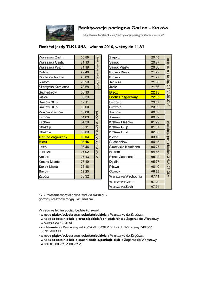 Rozkład jazdy TLK LUNA - wiosna 2016, ważny do 11.VI 20:27 Sanok Miasto 20:30 Krosno Miasto 21:22 Krosno 21:27 Jedlicze Jasło 21:38 21:56 00:10 Biecz 22:23 Kielce 00:39 Gorlice Zagórzany 22:35 Kraków Gł. p. Kraków Gł. o. 02:11 03:00 Stróże p. Stróże o. 23:07 23:32 Kraków Płaszów 03:08 Tuchów 00:08 Tarnów 04:03 Tarnów 00:39 Tuchów 04:30 Kraków Płaszów 01:29 Stróże p. 05:11 Kraków Gł. p. 01:37 Kraków Gł. o. 02:05 Kielce 03:43 Suchedniów 04:15 Skarżysko Kamienna 04:27 Radom 04:55 21:10 Warszawa Wsch. 21:19 Dęblin 22:40 Pionki Zachodnie 23:09 Radom Skarżysko Kamienna 23:29 23:58 Suchedniów sobota, niedziela, 2-3.V, 26-27.V Stróże o. 05:33 Gorlice Zagórzany 06:04 Biecz 06:16 Jasło 06:44 Jedlicze 07:02 Krosno 07:13 Pionki Zachodnie 05:12 Krosno Miasto 07:19 Dęblin 05:37 Sanok Miasto 08:16 Pilawa 06:10 Sanok Zagórz 08:20 08:32 Otwock Warszawa Wschodnia 06:32 07:11 Warszawa Centr. Warszawa Zach. 07:20 07:34 12.VI zostanie wprowadzona korekta rozkładu godziny odjazdów mogą ulec zmianie. W sezonie letnim pociąg będzie kursował: - w noce piątek/sobota oraz sobota/niedziela z Warszawy do Zagórza, w noce sobota/niedziela oraz niedziela/poniedziałek a z Zagórza do Warszawy w okresie do 19/20.VI - codziennie - z Warszawy od 23/24.VI do 30/31.VIII - i do Warszawy 24/25.VI do 31.VIII/1.IX - w noce piątek/sobota oraz sobota/niedziela z Warszawy do Zagórza, w noce sobota/niedziela oraz niedziela/poniedziałek z Zagórza do Warszawy w okresie od 2/3.IX do 2/3.X niedziela, poniedziałek, 3-4.V, 27-28.V Sanok Warszawa Centr. sobota, niedziela, 2-3.V, 26-27.V 20:15 20:55 piątek, sobota, 1-2.V, 25-26.V Zagórz Warszawa Zach.