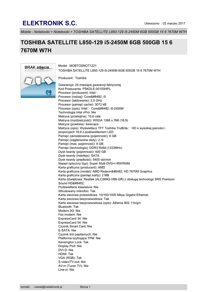 ELEKTRONIK S.C. Utworzono : 02 marzec 2017 Mobile - Notebooki > Notebooki > TOSHIBA SATELLITE L850-129 i5-2450M 6GB 500GB 15 6 7670M W7H TOSHIBA SATELLITE L850-129 i5-2450M 6GB 500GB 15 6 7670M W7H Model : MOBTOSNOT1221 TOSHIBA SATELLITE L850-129 i5-2450M 6GB 500GB 15 6 7670M W7H Producent : Toshiba Gwarancja: 24 miesiące gwarancji fabrycznej Kod Producenta: PSKDLE-00100HPL Procesor (producent): Intel� Procesor (rodzaj): Core™ i5 Procesor (taktowanie): 2,5 GHz Procesor (pamięć cache): 3072 kB Procesor (opis): Intel� Core™ i5-2450M Technologia Intel vPro: Nie Matryca (przekątna): 15,6 cale Matryca (rozdzielczość): WXGA 1366 x 768 (16:9) Matryca (powłoka): świecąca Matryca (opis): Wyświetlacz TFT Toshiba TruBrite� HD o wysokiej jasności i proporcjach 16:9 z podświetleniem LED Pamięć zainstalowana (pojemność): 6 GB Pamięć (zajęte/wolne sloty): 2 /0 Pamięć (max. pojemność): 8 GB Pamięć (technologia): DDR3 RAM (1333MHz) Dysk twardy (pojemność): 500 GB Dysk twardy (interfejs): SATA Dysk twardy (prędkość): 5400 obr/min Napęd optyczny (typ): Super Multi DVD+/-RW/RAM Karta graficzna (producent): AMD Karta graficzna (model): AMD Radeon™ HD 7670M Graphics Karta graficzna (pamięć karty): 2 MB Karta dźwiękowa: Realtek (ALC269Q-VB6-GR) z obsługą technologii SRS Premium Sound HD™ Podświetlana klawiatura: Nie Wbudowany mikrofon: Tak Karta sieciowa przewodowa: 10/100/1000 Mbps Gigabit Ethernet Karta sieciowa bezprzewodowa: Tak Karta sieciowa bezprzewodowa (opis): Atheros 802.11b/g/n Bluetooth: Tak Modem 3G: Nie Fax modem: Nie ExpressCard 34: Nie ExpressCard 54: Nie Czytnik Smart Card: Nie E-SATA: Nie Czytnik linii papilarnych: Nie Platforma szyfrująca TPM: Nie Kensington Lock: Tak Display Port: Nie DVI-D: Nie HDMI: Tak VGA (RGB): Tak S-video/TV-out: Nie AV-in (Tuner TV): Nie Line-in: Nie kontakt : - [email protected] Strona 1 ELEKTRONIK S.C. Utworzono : 02 marzec 2017 Mobile - Notebooki > Notebooki > TOSHIBA SATELLITE L850-129 i5-2450M 6GB 500GB 15 6 7670M W7H TOSHIBA SATELLITE L850-129 i5-2450M 6GB 500GB 15 6 7670M W7H Line-out: Tak Wejście mikrofonu: Tak S/PDIF: Nie RS232 (szeregowy): Nie Czytnik kart pamięci: Tak Czytnik kart pamięci (opis): Obsługujący karty SD™ o pojemności do 2 GB, miniSD™/microSD™ z adapterem do 2 GB, SDHC™ do 32 GB, SDXC™ do 64 GB i MultiMedia Card™ do 2 GB) Panel klawiszy multimedialnych: Nie Złącze replikatora portów: Nie Fire-Wire (IEEE1394): Nie USB 2.0: 1 szt. USB 3.0: 2 szt. System operacyjny: Windows 7 Home Premium 64 bit System operacyjny (wer. Językowa): polski Dodatkowe oprogramowanie: Skype; Windows Live Essentials; Ten komputer zawiera wersje programów Microsoft� Word i Excel o ograniczonej funkcjonalności z reklamami; McAfee� Internet Security (z dołączoną darmową 30-dniową subskrypcją) ; , Nero KwikMedia, Nero BackItUp i Burn Autobackup; Toshiba Eco Utility™ ; Toshiba PC Health Monitor ; Toshiba Tempro; Toshiba Recovery Media Creator; WildTangent Games Console; Toshiba Disc Creator Wbudowana kamera: Tak Wbudowana kamera (opis): kamera internetowa HD o rozdzielczości 1 megapiksela z mikrofonem Urządzenie wskazujące: Płytka dotykowa Touch-Pad z funkcją Multi-Touch z różnymi funkcjami przewijania, powiększania i uruchamiania. Akumulator (technologia): Litowo-jonowy Akumulator (czas pracy): 4,5 h Wymiary (wysokość): 33 mm Wymiary (szerokość): 380 mm Wymiary (głębokość): 242 mm Waga: 2,3 kg Gwarancja: 24 mies Gwarancja międzynarodowa: Tak Gwarancja baterii: 6 mies Opis: Obsługa audio w formacie HD; Enhanced Intel� SpeedStep� Technology; Zgodny z SM BIOS; Certyfikat ENERGY STAR 5.0Matowe i błyszczące wykończenie w kolorze ciemnego srebra ze wzorem krzyżujących się linii, czarna klawiatura Adres www producenta: Link na stronę opisu technicznego Cena : 12.811,28 zł Brutto ( 10.501,05 zł Netto) Dostępność: Produkt dostępny w naszym sklepie od 17 lipiec 2012 kontakt : - [email protected] Strona 2