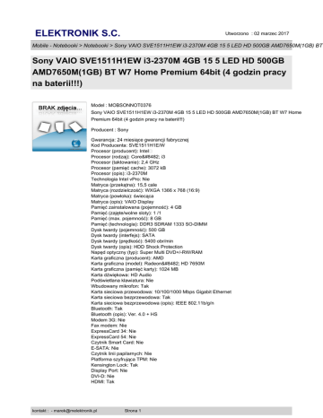 ELEKTRONIK S.C. Utworzono : 02 marzec 2017 Mobile - Notebooki > Notebooki > Sony VAIO SVE1511H1EW i3-2370M 4GB 15 5 LED HD 500GB AMD7650M(1GB) BT Sony VAIO SVE1511H1EW i3-2370M 4GB 15 5 LED HD 500GB AMD7650M(1GB) BT W7 Home Premium 64bit (4 godzin pracy na baterii!!!) Model : MOBSONNOT0376 Sony VAIO SVE1511H1EW i3-2370M 4GB 15 5 LED HD 500GB AMD7650M(1GB) BT W7 Home Premium 64bit (4 godzin pracy na baterii!!!) Producent : Sony Gwarancja: 24 miesiące gwarancji fabrycznej Kod Producenta: SVE1511H1E/W Procesor (producent): Intel� Procesor (rodzaj): Core™ i3 Procesor (taktowanie): 2,4 GHz Procesor (pamięć cache): 3072 kB Procesor (opis): i3-2370M Technologia Intel vPro: Nie Matryca (przekątna): 15,5 cale Matryca (rozdzielczość): WXGA 1366 x 768 (16:9) Matryca (powłoka): świecąca Matryca (opis): VAIO Display Pamięć zainstalowana (pojemność): 4 GB Pamięć (zajęte/wolne sloty): 1 /1 Pamięć (max. pojemność): 8 GB Pamięć (technologia): DDR3 SDRAM 1333 SO-DIMM Dysk twardy (pojemność): 500 GB Dysk twardy (interfejs): SATA Dysk twardy (prędkość): 5400 obr/min Dysk twardy (opis): HDD Shock Protection Napęd optyczny (typ): Super Multi DVD+/-RW/RAM Karta graficzna (producent): AMD Karta graficzna (model): Radeon™ HD 7650M Karta graficzna (pamięć karty): 1024 MB Karta dźwiękowa: HD Audio Podświetlana klawiatura: Nie Wbudowany mikrofon: Tak Karta sieciowa przewodowa: 10/100/1000 Mbps Gigabit Ethernet Karta sieciowa bezprzewodowa: Tak Karta sieciowa bezprzewodowa (opis): IEEE 802.11b/g/n Bluetooth: Tak Bluetooth (opis): Ver. 4.0 + HS Modem 3G: Nie Fax modem: Nie ExpressCard 34: Nie ExpressCard 54: Nie Czytnik Smart Card: Nie E-SATA: Nie Czytnik linii papilarnych: Nie Platforma szyfrująca TPM: Nie Kensington Lock: Tak Display Port: Nie DVI-D: Nie HDMI: Tak kontakt : - [email protected] Strona 1 ELEKTRONIK S.C. Utworzono : 02 marzec 2017 Mobile - Notebooki > Notebooki > Sony VAIO SVE1511H1EW i3-2370M 4GB 15 5 LED HD 500GB AMD7650M(1GB) BT Sony VAIO SVE1511H1EW i3-2370M 4GB 15 5 LED HD 500GB AMD7650M(1GB) BT W7 Home Premium 64bit (4 godzin pracy na baterii!!!) VGA (RGB): Tak S-video/TV-out: Nie AV-in (Tuner TV): Nie Line-in: Nie Line-out: Tak Wejście mikrofonu: Tak S/PDIF: Nie RS232 (szeregowy): Nie Czytnik kart pamięci: Tak Czytnik kart pamięci (opis): Memory Stick Duo slot x 1, SD memory card slot Panel klawiszy multimedialnych: Nie Złącze replikatora portów: Nie Fire-Wire (IEEE1394): Nie USB 2.0: 3 szt. USB 3.0: 1 szt. System operacyjny: Windows 7 Home Premium 64 bit System operacyjny (wer. Językowa): multilanguage Dodatkowe oprogramowanie: Office 2010 preloaded – buy Office 2010 product key for full activation, Windows Live Essentials 2011, Adobe� Reader� 10 , McAfee Internet Security 30 day subscription, McAfee Online Backup 30 day subscription, Internet Explorer� 9, VAIO Transfer Support, VAIO Update, VAIO Smart network , Remote Keyboard, Remote Play with PlayStation� 3 Wbudowana kamera: Tak Akumulator (technologia): Lithium ion battery Akumulator (czas pracy): 4 h Wymiary (wysokość): 25/35 mm Wymiary (szerokość): 372 mm Wymiary (głębokość): 353 mm Waga: 2,7 kg Gwarancja: 24 mies Gwarancja międzynarodowa: Tak Gwarancja baterii: 12 mies Wyposażenie: AC Adapter - VGP-AC19V31, Power Cord, Documentation Pack, VAIO International Repair Service Guide Opis: BIAŁY Adres www producenta: Link na stronę opisu technicznego Cena : 2.707,84 zł Brutto ( 2.219,54 zł Netto) Dostępność: Produkt dostępny w naszym sklepie od 17 lipiec 2012 kontakt : - [email protected] Strona 2