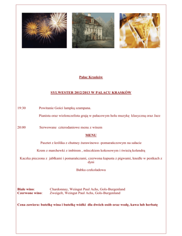Pałac Krasków SYLWESTER 2012/2013 W PAŁACU KRASKÓW 19:30 Powitanie Gości lampką szampana. Pianista oraz wiolonczelista grają w pałacowym holu muzykę klasyczną oraz Jazz 20:00 Serwowane czterodaniowe menu z winem MENU Pasztet z królika z chutney żurawinowo -pomarańczowym na sałacie Krem z marchewki z imbirem , mleczkiem kokosowym i świeżą kolendrą Kaczka pieczona z jabłkami i pomarańczami, czerwona kapusta z pigwami, knedle w pestkach z dyni Babka czekoladowa Białe wino: Czerwone wino: Chardonnay, Weingut Paul Achs, Gols-Burgenland Zweigelt, Weingut Paul Achs, Gols-Burgenland Cena zawiera: butelkę wina i butelkę wódki dla dwóch osób oraz wodę, kawa lub herbatę Muzyka taneczna gwarantująca wyśmienitą zabawę: DJ oraz Wokalistka - solowa laureatka wielu konkursów, min: I miejsce na Ogólnopolskim Festiwalu Piosenki Angielskiej, I miejsce w "Szansie na sukces", II miejsce w "Szansie na sukces" ze Stanem Borysem, I miejsce w Przeglądzie Zespołów Rockowych we Wrocławiu w 2003, II miejsce w Przeglądzie Zespołów Rockowych w Pilawie „ Złota struna” 2004, I miejsce w przeglądzie zespołów rokowych w Jaworzynie Śląskiej 2004, "Wybryk" 2001, "Karolek" 2004. Gościnnie była zapraszana do wielu telewizyjnych przedsięwzięć i programów. Dwukrotnie występowała w programie „ Pytanie na Śniadanie” , „Kawa, czy Herbata”, Koncercie w Warszawskiej Sali Kongresowej, wielu przedstawieniach muzycznych, min. we Wrocławskiej Filharmonii, Operetce, Dużej Sali Polskiego Radia, Imparcie, Firleju, Teatrze Polskim oraz Teatrze Lalek.Występowała na jednej scenie min. z Szymonem Wydra, Ich Troje, Dodą, Golec Orkiestra, Mezo, Verba, Liber i Doniu, Justyna Steczkowską, Danzelem, Kate Ryan, Partycja Markowską, Braćmi Cugowskimi czy tez Blog 27. Jej piosenka znalazła sie w roku 2007 w Empikach na płycie „My music fresh vol. 2”. 22:30 BUFET SYLWESTROWY Szynka z melonem Mozzarella z pomidorami i bazylią Befsztyk tatarski Sznycel wiedeński z sałatką ziemniaczaną Warzywa w cieście francuskim Szaszłyk z indyka z sezamem Vitello tonnato Galaretka drobiowa Koktajl z krewetek Pieczywo, dipy, sosy, masło czosnkowe Strudel z jabłkami z bitą śmietaną Owoce 24:00 Noworoczne życzenia przy ogniskach przed pałacem, grzaniec 01:00 Zupa gulaszowa 01.01.2013 10:00-13:00 Noworoczny bufet śniadaniowy Przy sprzyjających warunkach pogodowych (odpowiednia ilość śniegu) proponujemy Państwu jako dodatkową atrakcję KULIG NOWOROCZNY. Przejażdżka po parku oraz łąkach otaczających pałac zakończona ogniskiem, pieczeniem kiełbasek oraz grzanym winem, minimalna ilość osób: 15 Cena kuligu - 200 zł/os Przy większej liczbie chętnych gości, koszt proporcjonalnie maleje. Cena od osoby – nocleg, program, konsumpcja jw. Suite pałacowy 850 zł każdy następny nocleg TYLKO 400 zł Apartament dwuosobowy w Pałacu 750 zł każdy następny nocleg TYLKO 350 zł- pokój dwuosobowy 300 zł- pokój jednoosobowy Pokój dwuosobowy w Oficynie 650 zł każdy następny nocleg TYLKO 250 zł - pokój dwuosobowy 200 zł - pokój jednoosobowy Rezerwacje pod nr 0048/ 74/ 85 85 101 lub [email protected] Ostatecznym potwierdzeniem rezerwacji jest dokonanie wpłaty na poniższy nr konta do dnia 30.11.2012 r. Bank BPS o/ Wrocław PL 27 1930 1073 2210 0242 8473 0001 Swift POLUPLPR
