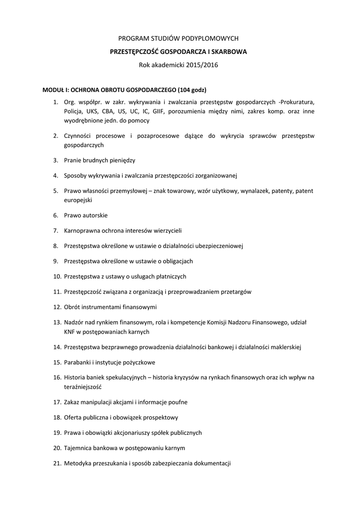 PROGRAM STUDIÓW PODYPLOMOWYCH PRZESTĘPCZOŚĆ GOSPODARCZA I SKARBOWA Rok akademicki 2015/2016 MODUŁ I: OCHRONA OBROTU GOSPODARCZEGO (104 godz) 1. Org. współpr. w zakr. wykrywania i zwalczania przestępstw gospodarczych -Prokuratura, Policja, UKS, CBA, US, UC, IC, GIIF, porozumienia między nimi, zakres komp. oraz inne wyodrębnione jedn. do pomocy 2. Czynności procesowe i pozaprocesowe dążące do wykrycia sprawców przestępstw gospodarczych 3. Pranie brudnych pieniędzy 4. Sposoby wykrywania i zwalczania przestępczości zorganizowanej 5. Prawo własności przemysłowej – znak towarowy, wzór użytkowy, wynalazek, patenty, patent europejski 6. Prawo autorskie 7. Karnoprawna ochrona interesów wierzycieli 8. Przestępstwa określone w ustawie o działalności ubezpieczeniowej 9. Przestępstwa określone w ustawie o obligacjach 10. Przestępstwa z ustawy o usługach płatniczych 11. Przestępczość związana z organizacją i przeprowadzaniem przetargów 12. Obrót instrumentami finansowymi 13. Nadzór nad rynkiem finansowym, rola i kompetencje Komisji Nadzoru Finansowego, udział KNF w postępowaniach karnych 14. Przestępstwa bezprawnego prowadzenia działalności bankowej i działalności maklerskiej 15. Parabanki i instytucje pożyczkowe 16. Historia baniek spekulacyjnych – historia kryzysów na rynkach finansowych oraz ich wpływ na teraźniejszość 17. Zakaz manipulacji akcjami i informacje poufne 18. Oferta publiczna i obowiązek prospektowy 19. Prawa i obowiązki akcjonariuszy spółek publicznych 20. Tajemnica bankowa w postępowaniu karnym 21. Metodyka przeszukania i sposób zabezpieczania dokumentacji 22. Etyka biznesu we współczesnym obrocie gospodarczym 23. Podejmowanie decyzji gospodarczych przez osoby dotknięte zaburzeniami psychicznymi 24. Odpowiedzialność karna za niezłożenie wniosku o ogłoszenie upadłości spółki 25. Odpowiedzialność karna za przestępstwa z ustawy o rachunkowości 26. Przestępstwa związane z wykorzystaniem weksli i czeków 27. Przestępstwa z ustawy o ochronie niektórych usług świadczonych drogą elektroniczną opartych lub polegających na dostępie warunkowym 28. Analiza sprawozdań finansowych 29. Obrót dokumentami w księgowości i rachunkowości 30. Właściwe zabezpieczanie dokumentacji księgowej i komputerów. Konsekwencje błędów 31. Blokada rachunku bankowego i wstrzymanie transakcji 32. Produkty oferowane przez banki pozwalające na anonimizację użytkownika 33. Przestępstwa gospodarcze - case study - właściwa kwalifikacja prawna czynu 34. Przestępczość gospodarcza w świetle ekonomicznej analizy prawa 35. Konflikty jurysdykcji przy transgranicznych przestępstwach gospodarczych MODUŁ II: KARNOPRAWNA OCHRONA PRZED CZYNAMI NIEUCZCIWEJ KONKURENCJI (16 godz) 1. Odpowiedzialność członków zarządu i osób pełniących funkcje kierownicze z tytułu naruszenia reguł konkurencji - w świetle najnowszej nowelizacji ustawy o ochronie konkurencji i konsumentów 2. Odpowiedzialność członków zarządu i osób pełniących funkcje kierownicze z tytułu naruszenia praw konsumentów 3. Odpowiedzialność za czyny nieuczciwej konk.- naruszenie tajemnicy przeds., naśladownictwo prod. wprowadzające w błąd ozn. geogr., rozpowszechnianie nieprawdziwych lub wprowadzających w błąd inf. MODUŁ III: PRZESTĘPCZOŚĆ SKARBOWA (22 godz) 1. Zasady odpowiedzialności za przestępstwa skarbowe 2. Przestępstwa skarbowe skierowane przeciwko obowiązkom podatkowym 3. Oszustwa karuzelowe 4. Poszukiwanie i dokumentowanie nadużyć skarbowych MODUŁ IV: ALTERNATYWNE ROZWIĄZANIA SPORÓW, A PRZESTĘPSTWA GOSPODARCZE (8 godz) 1. Umocowanie prawne mediacji w sprawach karnych i gospodarczych. Listy mediatorów, ośrodki mediacyjne i tryb wszczęcia postępowania mediacyjnego 2. Zastosowanie mediacji jako trybu naprawienia szkody. Zastosowanie środków kompensacyjnych 3. Proces karny, a mediacja prowadzona w oparciu o przepisy kpc. 4. Wpływ mediacji na zakończenie postępowania karnego 5. Warunkowe umorzenie sprawy, umorzenie konsensualne i inne tryby konsensualne zakończenia sprawy w oparciu o pozytywny wynik mediacji 6. Niebezpieczeństwa związane z stosowaniem mediacji, umorzeń konsensualnych i innych konsensualnych trybów zakończenia postępowania 7. Ugoda przed mediatorem jako sposób na popełnienie przestępstwa 8. Prawidłowa konstrukcja ugody i sprawozdania mediatora. Uwzględnienie treści ugody w decyzji merytorycznej kończącej sprawę