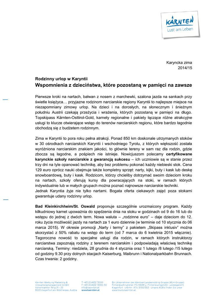 Karyncka zima 2014/15 Rodzinny urlop w Karyntii Wspomnienia z dzieciństwa, które pozostaną w pamięci na zawsze Pierwsze kroki na nartach, bałwan z nosem z marchewki, szalona jazda na sankach przy świetle księżyca… przyjazne rodzinom narciarskie regiony Karyntii to najlepsze miejsce na niezapomniany zimowy urlop. Na dzieci i na dorosłych, na słonecznym i śnieżnym południu Austrii czekają przeżycia i wrażenia, których pozostaną w pamięci na długo. Topskipass Kärnten-Osttirol-Gold, karnety regionalne i pakiety łączące różne atrakcyjne usługi to klucze otwierające wstęp do terenów narciarskich regionu, które bardzo łagodnie obchodzą się z budżetem rodzinnym. Zima w Karyntii to pora roku pełna atrakcji. Ponad 850 km doskonale utrzymanych stoków w 30 ośrodkach narciarskich Karyntii i wschodniego Tyrolu, z których większość została wyróżniona narciarskim znakiem jakości, to głównie tereny w sam raz dla rodzin, gdzie zbocza są łagodne, a pośpiech nie istnieje. Nowicjuszom polecamy certyfikowane karynckie szkoły narciarskie z gwarancją sukcesu – ich uczniowie są w stanie przez trzy dni na tyle opanować technikę, aby bez problemu pokonać każdy niebieski stok. Cena 129 euro oprócz nauki obejmuje także kompletny sprzęt: narty, kijki, buty i kask lub deskę snowboardową, buty i kask. Rodzicom, którzy chcieliby dotrzymać swoim dzieciom kroku na nartach, szkoły oferują kursy dla powracających na stoki, w ramach których indywidualnie lub w małych grupach można poznać najnowsze narciarskie techniki. Jednak Karyntia żyje nie tylko nartami. Bogata oferta ciekawych zajęć poza stokami gwarantuje udany rodzinny urlop. Bad Kleinkirchheim/St. Oswald proponuje szczególnie urozmaicony program. Każdy kilkudniowy karnet upoważnia do spędzenia dnia na stoku w godzinach od 9 do 16 lub do wstępu do jednej z dwóch term. Nowa waluta – „rodzinne euro” – daje dzieciom do 12. roku życia możliwość jazdy na nartach za 1 euro dziennie (w terminie od 10 stycznia do 06 marca 2015). W okresie promocji „Narty i termy” z pakietem „Skipass inklusiv” można skorzystać z 50% rabatu na wstęp do term (od 7 marca do 6 kwietnia 2015 włącznie). Tegoroczna nowość to specjalne usługi dla rodzin, w ramach których instruktorzy narciarstwa zapoznają rodziny z terenem narciarskim i podpowiadają właściwą technikę narciarską. Terminy: niedziela, 28 grudnia do 4 stycznia oraz 1 lutego /8 lutego /15 lutego od godziny 9.30 przy dolnych stacjach Kaiserburg, Maibrunn i Nationalparkbahn Brunnach. Czas trwania: 2 godziny. Nassfeld, jeden z dziesięciu najlepszych terenów narciarskich w Austrii, może się również pochwalić doskonałą ofertą dla rodzin. Składają się na nią m.in. nowoczesne i dostosowane do potrzeb najmłodszych kolejki linowe, trzy tereny do ćwiczeń dla dzieci, łagodne trasy zjazdowe i przyjazne ceny. I tak na przykład narty dla dzieci można wypożyczyć już za 1 euro dziennie, a w ramach promocji „SkiHits for Kids PREMIUM” dzieci do lat 9,9 wypoczywają bezpłatnie: od 05.12 do 24.12.2014 i od 14.03 do 12.04.2015 dzieci śpią w pokoju rodziców lub dziadków bez żadnych opłat (oferta obejmuje także wyżywienie) i również bezpłatnie otrzymują karnet narciarski, kurs jazdy na nartach i sprzęt (w tym kask). Dzieci, które nie ukończyły 15. roku życia za wszystkie pakiety Ski-Hit płacą tylko połowę. Ulubieńcem najmłodszych jest pingwin BOBO – maskotka i dobry duch miniklubu BOBO, gdzie maluchy w wieku od lat 3 do 5 bawią się pod okiem opiekunów. W programie dnia klubu znajdziemy między innymi wyprawy na sanki, naukę jazdy na nartach, teatrzyk kukiełkowy, a w międzyczasie posiłek. „Im mniejszy, tym taniej” – zgodnie z tą zasadą ułożono cennik narciarskiego centrum dla dzieci Kinder-Skiwelt Weissensee. Za hotel, wyciąg, szkołę narciarską, a nawet za wypożyczenie sprzętu płaci się stosownie do wzrostu użytkownika. Kto najszybciej ukończy slalom na lodzie? Kto ulepi największego bałwana? Podczas dziecięcej olimpiady na lodzie i śniegu liczy się przede wszystkim zabawa i ruch na świeżym powietrzu. Od 22 lutego do 8 marca 2015 r. dzieci, których rodzice zarezerwują pobyt w jednym z 50 obiektów partnerskich, będą mogły wziąć udział w zawodach gratis. Górę Katschberg również można ze spokojnym sumieniem nazwać rajem dla najmłodszych. Katschi’s Kinderwelt to teren narciarski dla dzieci, na którym najmłodszym narciarzom kibicują barwne postaci z komiksów. W razie potrzeby maluchy mogą się ogrzać w specjalnych pawilonach. Dodatkowo, w każdą środę w centrum Jazdy Konnej odbywa się parada maskotek. Niewielkie rozmiary terenu narciarskiego Turracher Höhe są w oczach rodzin jego najważniejszą zaletą. Ale nie jedyną, bo do spędzenia urlopu w rodzinnym gronie zachęcają specjalne zniżki przy zakupie karnetów dziennych, kursy jazdy na nartach dla dzieci i hotele z ofertą dostosowaną do potrzeb najmłodszych (np. z opieką w weekendy lub podczas ferii codziennie). Absolutnym hitem zdaniem dzieci i dorosłych jest kolejka górska Nocky Flitzer. Heidi-Alm Skipark na terenie narciarskim Falkert to idealne miejsce dla adeptów narciarstwa. Są tu bezpieczne, rozległe stoki, nie ma natomiast kolejek do wyciągów – idealne miejsce dla początkujących! Tradycyjnie popularnością wśród rodzin cieszy się region Lieser-Maltatal z terenem narciarskim Innerkrems. Jedną z jego atrakcji jest Windel-Wedel-Camp – kurs jazdy na nartach dla najmłodszych z najmłodszych – szusowania uczą się tutaj maluchy w wieku od 2. roku życia. Goście hotelu dla rodzin z małymi dziećmi otrzymują zimą do każdej rezerwacji bezpłatne bilety na wyciągi w Innerkrems. Każda środa to dzień przygody: gdy na torze bobslejowym Fire & Ice i podczas zjazdów na sankach wypieki z emocji pojawiają się nie tylko na dziecięcych policzkach, na l