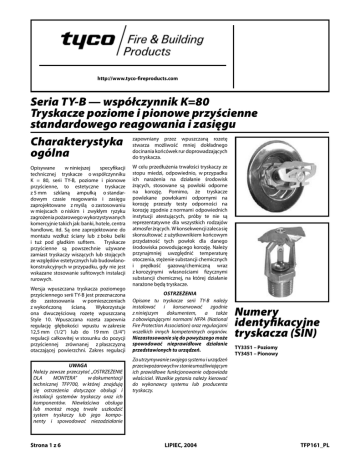Technical Services: Tel: (800) 381-9312 / Fax: (800) 791-5500 http://www.tyco-fireproducts.com Series TY-B——współczynnik 5.6 K-factorK=80 Seria TY-B Horizontal and Vertical Sidewall Sprinklers Tryskacze poziome i pionowe przyścienne Standard Response, Standard Coverage standardowego reagowania i zasięgu Charakterystyka General ogólna Description The Series TY-B,w niniejszej 5.6 K-factor, HorizonOpisywane specyfikacji taltechnicznej and Vertical tryskacze Sidewall Sprinklers deo współczynniku scribed in this sheet are standard K = 80, seriidata TY-B, poziome i pionowe response - standard coverage, tryskacze decoprzyścienne, to estetyczne rative 5 mm glass bulb type spray z 5 mm szklaną ampułką o standar sprinklers designed for use in light and dowymhazard, czasie commercial reagowaniaoccupani zasięgu ordinary zaprojektowane z myślą o zastosowaniu cies such as banks, hotels, shopping w miejscach i zwykłym ryzyku malls, etc. Theyo niskim are designed for instalzagrożenia lation along apożarowego wall or the wykorzystywanych side of a beam komercyjnie takich jak: banki, hotele, centra and just beneath a smooth ceiling. handlowe, itd. Są oneare zaprojektowane Sidewall sprinklers commonly do used instead of pendent upright montażu wzdłuż ściany luborz boku belki sprinklers due to aesthetics i tuż pod gładkim sufitem.or building Tryskacze construction przyścienne considerations, są powszechnie where używane piping across the ceiling is not desirzamiast tryskaczy wiszących lub stojących able. ze względów estetycznych lub budowlanokonstrukcyjnych w przypadku, nie jest The recessed version of thegdy Series TY-B Horizontal Sidewall Sprinkler is wskazane stosowanie sufitowych instalacji intended for use in areas with a finrurowych. ished wall. It uses a two-piece Style 10 Wersja wpuszczana tryskacza poziomego Recessed Escutcheon. The Recessed przyściennego serii TY-B1/2 jestinch przeznaczona Escutcheon provides (12,7 do of zastosowania w pomieszczeniach mm) recessed adjustment or up to Wykorzystuje 3/4z wykończoną inch (19,1 mm)ścianą. of total adjustment from flush sidewall position. The onathe dwuczęściową rozetę wpuszczaną adjustment by the Recessed Style 10. provided Wpuszczana rozeta zapewnia Escutcheon reduces the accuracy to regulację głębokości wpustu w zakresie which the fixed to the 12,5 mm (1/2”) pipe lub nipples do 19 mm (3/4”) sprinklers be cut. regulacji must całkowitej w stosunku do pozycji przyściennej zrównanej z płaszczyzną otaczającej powierzchni. Zakres regulacji UWAGA Należy zawsze przeczytać „OSTRZEŻENIE IMPORTANT DLA refer MONTERA” w dokumentacji Always to Technical Data Sheet TFP700TFP700, for the w której “INSTALLER technicznej znajdują WARNING” that provides się ostrzeżenia dotyczącecautions obsługi i with respectsystemów to handling and instalinstalacji tryskaczy oraz ich lation of sprinkler systems and comkomponentów. Niewłaściwa obsługa ponents. Improper handling inlub montaż mogą trwale and uszkodzić stallation can permanently damage system tryskaczy lub jego kompo a nenty sprinkler system or its compoi spowodować niezadziałanie nents and cause the sprinkler to fail to operate in a fire situation or cause it to operate prematurely. zapewnianyresistant przez wpuszczaną rozetę Corrosion coatings, where applicable, are utilized to extend the stwarza możliwość mniej dokładnego life of copper alloy rur sprinklers beyond docinania końcówek doprowadzających that which would otherwise be obdo tryskacza. tained when exposed to corrosive atW celu przedłużenia trwałości tryskaczy mospheres. Although corrosion resis-ze stopu miedzi, odpowiednio, w przypadku tant coated sprinklers have passed the ich narażenia na tests działanie środowisk standard corrosion of the applicable approval agencies, the testing is żrących, stosowane są powłoki odporne not of all possible corna representative korozję. Pomimo, że tryskacze rosive atmospheres. Consequently, powlekane powłokami odpornymi itna iskorozję recommended end user bena przeszły that testytheodporności consulted with respect to the suitability korozję zgodnie z normami odpowiednich ofinstytucji these coatings for any givente corroatestujących, próby nie są sive environment. The effects of ambireprezentatywne dla wszystkich rodzajów ent temperature, concentration of atmosfer żrących. W konsekwencjivelocity, zaleca się chemicals, and gas/chemical skonsultować z użytkownikiem końcowym should be considered, as a minimum, przydatność powłok dla of danego along with thetych corrosive nature the środowiska korozję.will Należy chemical to powodującego which the sprinklers be przynajmniej uwzględnić temperaturę exposed. otoczenia, stężenie substancji chemicznych i prędkość WARNINGS gazową/chemiczną wraz The Series TY-Bwłasnościami Sprinklers described z korozyjnymi fizycznymi herein must be installed and działanie mainsubstancji chemicznej, na której tained in będą compliance narażone tryskacze.with this document, as well as with the applicable OSTRZEŻENIA standards of the National Fire Protection Association, in addition the Opisane tu tryskacze serii TY-Bto należy standards authoritieszgodnie havinstalować of any i other konserwować ing jurisdiction.dokumentem, Failure to do aso may z niniejszym także impair the performance these dez obowiązującymi normami of NFPA (National vices. Fire Protection Association) oraz regulacjami The ownerinnych is responsible for maintainwszelkich kompetentnych organów. ing their fire protection system and może deNiezastosowanie się do powyższego vices in propernieprawidłowe operating condition. spowodować działanie The installing contractor or sprinkler przedstawionych tu urządzeń. manufacturer should be contacted Za utrzymywanie swojego systemu i urządzeń with any questions. przeciwpożarowych w stanie umożliwiającym ich prawidłowe funkcjonowan