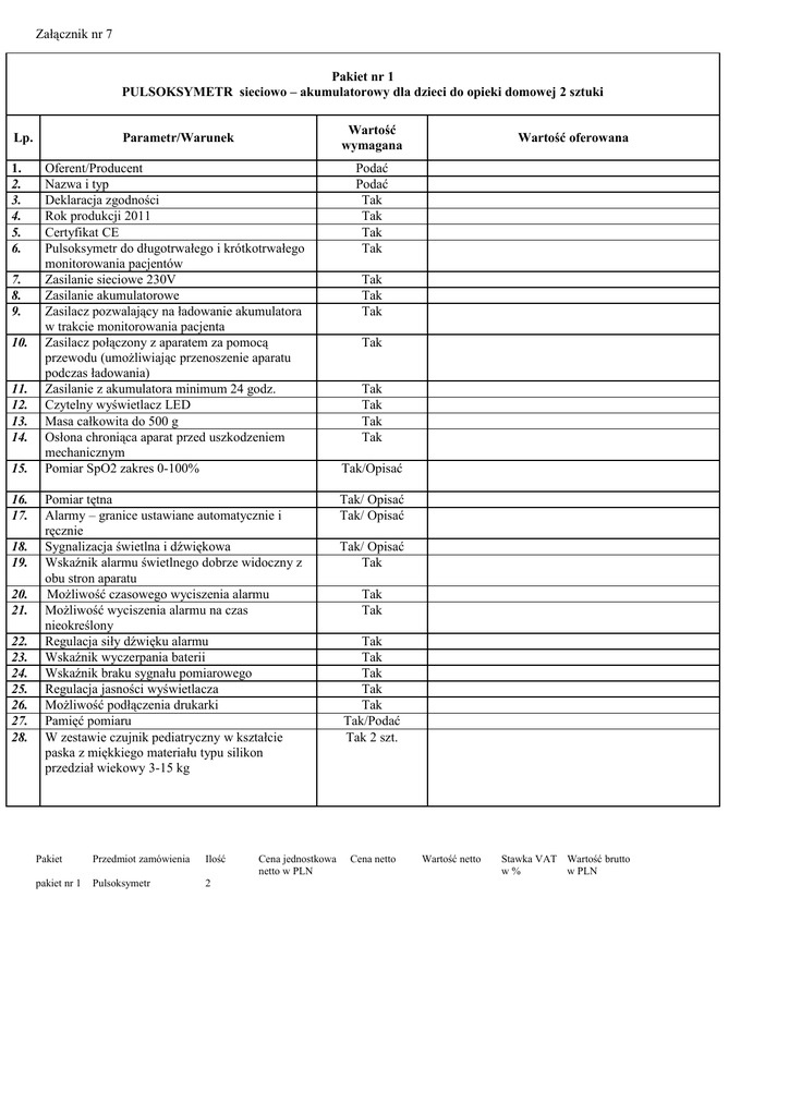 Załącznik nr 7 Pakiet nr 1 PULSOKSYMETR sieciowo – akumulatorowy dla dzieci do opieki domowej 2 sztuki Lp. 1. 2. 3. 4. 5. 6. 7. 8. 9. 10. 11. 12. 13. 14. 15. 16. 17. 18. 19. 20. 21. 22. 23. 24. 25. 26. 27. 28. Wartość wymagana Parametr/Warunek Oferent/Producent Nazwa i typ Deklaracja zgodności Rok produkcji 2011 Certyfikat CE Pulsoksymetr do długotrwałego i krótkotrwałego monitorowania pacjentów Zasilanie sieciowe 230V Zasilanie akumulatorowe Zasilacz pozwalający na ładowanie akumulatora w trakcie monitorowania pacjenta Zasilacz połączony z aparatem za pomocą przewodu (umożliwiając przenoszenie aparatu podczas ładowania) Zasilanie z akumulatora minimum 24 godz. Czytelny wyświetlacz LED Masa całkowita do 500 g Osłona chroniąca aparat przed uszkodzeniem mechanicznym Pomiar SpO2 zakres 0-100% Pomiar tętna Alarmy – granice ustawiane automatycznie i ręcznie Sygnalizacja świetlna i dźwiękowa Wskaźnik alarmu świetlnego dobrze widoczny z obu stron aparatu Możliwość czasowego wyciszenia alarmu Możliwość wyciszenia alarmu na czas nieokreślony Regulacja siły dźwięku alarmu Wskaźnik wyczerpania baterii Wskaźnik braku sygnału pomiarowego Regulacja jasności wyświetlacza Możliwość podłączenia drukarki Pamięć pomiaru W zestawie czujnik pediatryczny w kształcie paska z miękkiego materiału typu silikon przedział wiekowy 3-15 kg Pakiet Przedmiot zamówienia Ilość pakiet nr 1 Pulsoksymetr 2 Cena jednostkowa netto w PLN Wartość oferowana Podać Podać Tak Tak Tak Tak Tak Tak Tak Tak Tak Tak Tak Tak Tak/Opisać Tak/ Opisać Tak/ Opisać Tak/ Opisać Tak Tak Tak Tak Tak Tak Tak Tak Tak/Podać Tak 2 szt. Cena netto Wartość netto Stawka VAT Wartość brutto w% w PLN Pakiet nr 2 - Respirator domowy 2 sztuki Lp. Parametr/Warunek 1. 2. 3. 4. 5. 6. 7. 8. Producent/kraj Nazwa / Model i typ/rok prod. 2011 Deklaracja Zgodności Certyfikat CE lub Deklaracja Zgodności Respirator do terapii niewydolności oddechowej różnego pochodzenia, zarówno inwazyjnej jak i nieinwazyjnej, przystosowany do stosowania w domu Respirator dla dorosłych i dzieci powyżej 5 kg Własne zintegrowane zasilanie powietrzem Zasilanie w tlen z centralnego źródła sprężonego gazu, koncentratora lub butli tlenowej 9. Wartość wymagana podać podać tak tak tak tak tak tak tak Tryby wentylacji: 10. tak Wentylacja inwazyjna i nieinwazyjna 11. tak Wentylacja wspomagana ciśnieniem PSV i PSV ST (Vt TARGET) 12. 13. 14. 15. 16. 17. 18. 19. 20. 21. IPAP 5-40 EPAP 0-20 4 poziomy czasu narastania wdechu Trigger wdechowy 5 poziomów, przepływowy Możliwość wentylacji z objętością docelową Trigger wydechowy 15 do – 75% przepływu szczytowego Częstość minimalna 4-40 bpm Czas bezdechu 3-30 s Target VT 50-1400 ml Maksymalne ciśnienie tak tak tak tak tak tak tak tak tak tak (do osiągnięcia target Vt) 8-55 mbar (ograniczone od +3 do +15 przy IPAP) 22. 23. 24. 25. 26. 27. 28. 29. 30. 31. 32. Monitorowane parametry: Vti, Vte, stosunek I/T, FiO2, IPAP, EPAP, trigger Wentylacja kontrolowana ciśnieniem PCV i wspomagana wentylacja kontrolowana ciśnieniem PACV (Vt TARGET) IPAP 5-40 EPAP 0-20 Krzywe przepływu 4 poziomy Trigger wdechowy przepływowy, 5 poziomów Trigger wydechowy 15 do – 75% przepływu szczytowego Częstość minimalna 4-40 bpm Czas bezdechu 3-30s Target VT 50-1400 ml Maksymalne ciśnienie tak tak tak tak tak tak tak tak tak tak tak ( do osiągnięcia target Vt ) 8-55 mbar (ograniczone od +3 do +15 przy IPAP) 33. 34. 35. 36. 37. Monitorowanie Vti, Vte, stosunek I/T, FiO2, IPAP, EPAP oraz trigger Wentylacja kontrolowana objętościowo CV i wspomagana wentylacja kontrolowana objętością ACV Vt – objętość oddechowa 50-1400 ml EPAP 0-10 RAMP Dwie krzywe przepływu: - prostokątna tak tak tak tak tak Wartość oferowana Uwagi 38. 39. 40. 41. - opadająca Częstość minimalna 5-60 Stosunek I/T 50 do 25% Trigger I 5 poziomów Możliwość regulacji westchnienia przy Vt: 1 do 2 wielokrotności Vt tak tak tak tak 50 do 250 c/min 42. Monitorowanie tak IPAP, EPAP, Vti, Vte, I/T, FiO2 oraz trigger 43. 44. 45. 46. 47. 48. 49. 50. 51. 52. 53. 54. 55. 56. 57. 58. 59. 60. 61. 62. 63. 64. 65. 66. 67. 68. 69. 70. 71. SIMV – synchronizowana przerywana wentylacja obowiązkowa Vt – objętość oddechowa 50-1400 ml IPAP 5-40 EPAP 0-20 Stosunek I/T 50 do 25% Trigger I 5 poziomów Security rate 4-40 Czas bezdechu 3-30 s Monitorowanie I PAP, EPAP, Vti, Vte, I/T, FiO2 oraz trigger Alarmy wentylacji i pracy respiratora Alarm ciśnienia, bezdechu, Vt, częstości, FiO2, zasilania, akumulatora wewnętrznego. Stopniowanie alarmów ze względu na ważność, różniące się sygnałami dźwiękowymi i optycznymi Pamięć min. 9 alarmów Możliwość przeglądania zapamiętanych alarmów Inne wymagane parametry: Respirator z dwuramiennym przewodem oddechowym pacjenta z możliwością przystosowania w przyszłości urządzenia do pracy z przewodami jednoramiennymi. Test aparatu sprawdzający poprawność działania wykonywany automatycznie po włączeniu Wyświetlacz LCD umożliwiający wyświetlanie wszystkich parametrów wentylacji na jednej stronie Osobne ekrany dla monitorowania i ustawiania alarmów Możliwość zmieniania trybu wentylacji w trakcie wentylacji Zabezpieczenie przed przypadkową zmianą parametrów wentylacji Łatwe do czyszczenia i dezynfekowania Łatwy w obsłudze Cichy – do 30 dB przy 10 mbar Waga do 4,5 kg z akumulatorkiem Akumulator wewnętrzny, zintegrowany dający autonomię na minimum 10 godzin Zasilanie w tlen z centralnego źródła sprężonego gazu, koncentratora lub butli tlenowej Wejście źródła zasilania tlenu z tyłu respiratora AKCESORIA! Kompletny układ oddechowy pedriatyczny dwuramienny o śr. 15 mm kompatybilny z respiratorem podanym w zestawie Pakiet pakiet nr 2 Przedmiot zamówienia respirator domowy Ilość Cena jednostkowa netto w PLN 2 tak tak tak tak tak tak tak tak tak tak tak tak tak tak tak tak tak tak tak tak tak tak tak tak tak t