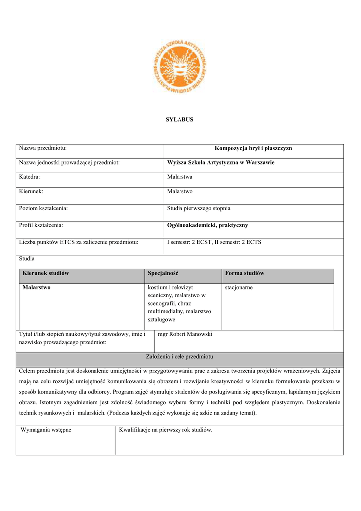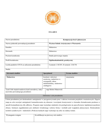 SYLABUS Nazwa przedmiotu: Kompozycja brył i płaszczyzn Nazwa jednostki prowadzącej przedmiot: Wyższa Szkoła Artystyczna w Warszawie Katedra: Malarstwa Kierunek: Malarstwo Poziom kształcenia: Studia pierwszego stopnia Profil kształcenia: Ogólnoakademicki, praktyczny Liczba punktów ETCS za zaliczenie przedmiotu: I semestr: 2 ECST, II semestr: 2 ECTS Studia Kierunek studiów Specjalność Forma studiów Malarstwo kostium i rekwizyt sceniczny, malarstwo w scenografii, obraz multimedialny, malarstwo sztalugowe stacjonarne Tytuł i/lub stopień naukowy/tytuł zawodowy, imię i nazwisko prowadzącego przedmiot: mgr Robert Manowski Założenia i cele przedmiotu Celem przedmiotu jest doskonalenie umiejętności w przygotowywaniu prac z zakresu tworzenia projektów wrażeniowych. Zajęcia mają na celu rozwijać umiejętność komunikowania się obrazem i rozwijanie kreatywności w kierunku formułowania przekazu w sposób komunikatywny dla odbiorcy. Program zajęć stymuluje studentów do posługiwania się specyficznym, lapidarnym językiem obrazu. Istotnym zagadnieniem jest zdolność świadomego wyboru formy i techniki pod względem plastycznym. Doskonalenie technik rysunkowych i malarskich. (Podczas każdych zajęć wykonuje się szkic na zadany temat). Wymagania wstępne Kwalifikacje na pierwszy rok studiów. Zamierzony efekt kształcenia Symbol efektu kształcenia na poziomie kierunku Opis efektu kształcenia na poziomie przedmiotu K_W01 Ma wiedze na temat umiejętnego świadomego doboru narzędzi i materiałów niezbędnych do przygotowania projektów wrażeniowych. K_W02 Ma wiedze na temat zagadnień teoretycznych, metodologicznych i praktycznych związanych z kompozycja brył i płaszczyzn. K_U02 Potrafi wykorzystać własną wyobraźnię i ekspresję artystyczną do realizacji projektów wrażeniowych w działaniach indywidualnych oraz zespołowych. K_U05 Potrafi przewidywać świadomie poruszać się w obszarze malarstwa, rysunku i rzeźby wraz z praktycznym wykorzystaniem wiedzy z zakresu kompozycji, perspektywy, w obrebie dwuwymiarowych i trójwymiarowych kompozycji przestrzennych. K_U16 Jest świadomy rozwoju własnej osobowości twórczej poprzez umiejętne i kreatywne wykorzystanie indywidualnych umiejętności warsztatowych. K_U18 Ma umiejętność niezależnego wykorzystania swojej intuicji i wyobraźni do konstruowania projektów o wysokich walorach artystycznych. K_K03 Rozumie potrzebę doskonalenia umiejętność komunikowania się obrazem i rozwijanie kreatywności w kierunku formułowania przekazu w sposób komunikatywny dla odbiorcy. K_K04 Jest zdolny do wykorzystania wyobraźni, intuicji i twórczej postawy samodzielnego myślenia w celu rozwiązywania problemów projektowych. 2 Weryfikacja efektu kształcenia przedstawienie po 5 projektów wrażeniowych i zestawu szkiców. Liczba godzin dydaktycznych i formy zajęć i punkty ECTS: Liczba godzin dydaktycznych (w tym): Przedmioty Forma zajęć: (W - wykład, Ć - ćwiczenia, K konwersatorium) Razem W Ć W+Ć 60 20 40 Kompozycja brył i płaszczyzn Rok I Rok II Semestr I W Ć 10 20 K K Semestr II ECTS R W Ć 2 Zo 10 20 K Rok III Semestr III ECTS R 2 Zo W K Ć ECTS Semestr IV R W Ć K ECTS Rok IV Semestr V R W Ć K ECTS Semestr VI R W Ć K ECTS Semestr VII R W Ć K ECTS R R – rygor (egzamin, - E, zaliczenie z oceną –Zo, zaliczenie - Z Treści programowe nauczania [ treść zajęć] SEMESTR I Wykład 1 - 2 Omówienie zasad funkcjonowania pracowni kompozycji oraz zadań i celów pedagogicznych. Skala ocen i zasady uzyskania zaliczenia z oceną. Wykład 3 – 4 Poszukiwanie plastycznego znaku dla emocji i stanów z wykorzystaniem kolorów zimnych i ciepłych. Określenie zasad dobrego projektu za podstawie poprawnej kompozycji. Wykład 5 Przypomnienie teorii z rysunku anatomicznego wybranych części twarzy: usta, ucho, nos, oko. Omówienie szkiców renesansowych mistrzów. Wykład 6 - 7 Dynamika i specyfika układów sylwetki badana na przykładach ikonograficznych. Kontrapost i skróty perspektywiczne. Wykład 8 Złoty podział jako zasada kompozycji alternatywna dla projektu kompozycji symetrycznej lub centralnej. Wykład 9 Przewodnik praktyczny po wybranych tendencjach i stylach malarskich z próbą naśladowania wybranych technik np. pastele, akwarela, tempera. Wykład 10 Układ abstrakcyjnych form geometrycznych inspirowanych sztuką awangardy, konstruktywistów lub twórczością Kazimierza Malewicza z okresu suprematycznego. Ćwiczenie 1 – 2 Należy narysować szkice anatomiczne układów dłoni, (co najmniej 4) szkice z różnymi układami dłoni. Rysunek z obserwacji na formacie papieru A4 w technice ołówka. Przed rysunkiem zobacz szkice Leonarda Da Vinci, Albrechta Dürerai Matthiasa Grünewalda. Omówienie zadania, konsultacje i wstępne szkice. Ćwiczenie 3- 4 Twarz i jej części w skrótach perspektywicznych. Schematyczny rysunek szkicowy z zaznaczeniem światłocienia modelującego bryłę trójwymiarową. Trzy odsłony jednej twarzy w formie potrójnego portretu narysowane z różnych stron widzenia. Rysunki powstają na podstawie zdjęcia portretowego wykonanego w pracowni. Technika wykonania to ołówek, węgiel, czarna kredka, kredka, rysunek w formacie A4 ( 3X A4). Omówienie znaczeń szkic, projekt wrażeniowy. Omówienie zadania, konsultacje i wstępne szkice. Potrzebne materiały: blok rysunkowy A3 i A4, ołówek twardy i ołówek miękki, kredka czarna. Ćwiczenie 5 - 6 Poszukiwanie plastycznego znaku dla emocji: cisza i krzyk, obojętność i nienawiść, smutek i radość. Określenie zasad dobrego projektu za podstawie poprawnej kompozycji. Potrzebne materiały: blok rysunkowy A3 i A4, kolorowe papiery A, 3 nożyczki klej. Ćwiczenie 7 – 8 Przypomnienie i utrwalenie rysunku anatomicznego poprzez szkice wybranych części twarzy: usta, ucho, nos, oko. Szkice renesansowych mistrzów. Aby wykonać szkic należy wykadrować fragment. Potrzebne materiały: blok rysunkowy A3 i A4, ołó