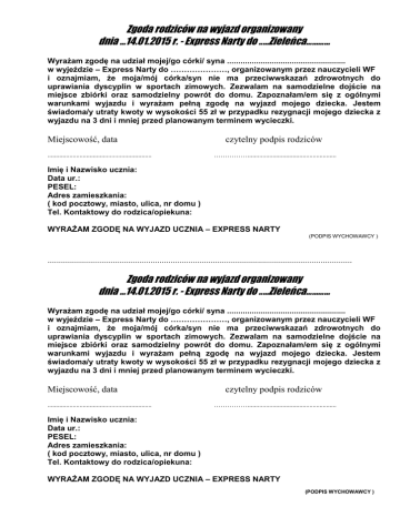 Zgoda rodziców na wyjazd organizowany dnia ...14.01.2015 r. - Express Narty do .....Zieleńca............ Wyrażam zgodę na udział mojej/go córki/ syna ..................................................... w wyjeździe – Express Narty do …………………, organizowanym przez nauczycieli WF i oznajmiam, że moja/mój córka/syn nie ma przeciwwskazań zdrowotnych do uprawiania dyscyplin w sportach zimowych. Zezwalam na samodzielne dojście na miejsce zbiórki oraz samodzielny powrót do domu. Zapoznałam/em się z ogólnymi warunkami wyjazdu i wyrażam pełną zgodę na wyjazd mojego dziecka. Jestem świadoma/y utraty kwoty w wysokości 55 zł w przypadku rezygnacji mojego dziecka z wyjazdu na 3 dni i mniej przed planowanym terminem wycieczki. Miejscowość, data .............................................................. czytelny podpis rodziców ……………..................................................... Imię i Nazwisko ucznia: Data ur.: PESEL: Adres zamieszkania: ( kod pocztowy, miasto, ulica, nr domu ) Tel. Kontaktowy do rodzica/opiekuna: WYRAŻAM ZGODĘ NA WYJAZD UCZNIA – EXPRESS NARTY (PODPIS WYCHOWAWCY ) ........................................................................................................................................ Zgoda rodziców na wyjazd organizowany dnia ...14.01.2015 r. - Express Narty do .....Zieleńca............ Wyrażam zgodę na udział mojej/go córki/ syna ..................................................... w wyjeździe – Express Narty do …………………, organizowanym przez nauczycieli WF i oznajmiam, że moja/mój córka/syn nie ma przeciwwskazań zdrowotnych do uprawiania dyscyplin w sportach zimowych. Zezwalam na samodzielne dojście na miejsce zbiórki oraz samodzielny powrót do domu. Zapoznałam/em się z ogólnymi warunkami wyjazdu i wyrażam pełną zgodę na wyjazd mojego dziecka. Jestem świadoma/y utraty kwoty w wysokości 55 zł w przypadku rezygnacji mojego dziecka z wyjazdu na 3 dni i mniej przed planowanym terminem wycieczki. Miejscowość, data .............................................................. czytelny podpis rodziców ……………..................................................... Imię i Nazwisko ucznia: Data ur.: PESEL: Adres zamieszkania: ( kod pocztowy, miasto, ulica, nr domu ) Tel. Kontaktowy do rodzica/opiekuna: WYRAŻAM ZGODĘ NA WYJAZD UCZNIA – EXPRESS NARTY (PODPIS WYCHOWAWCY )