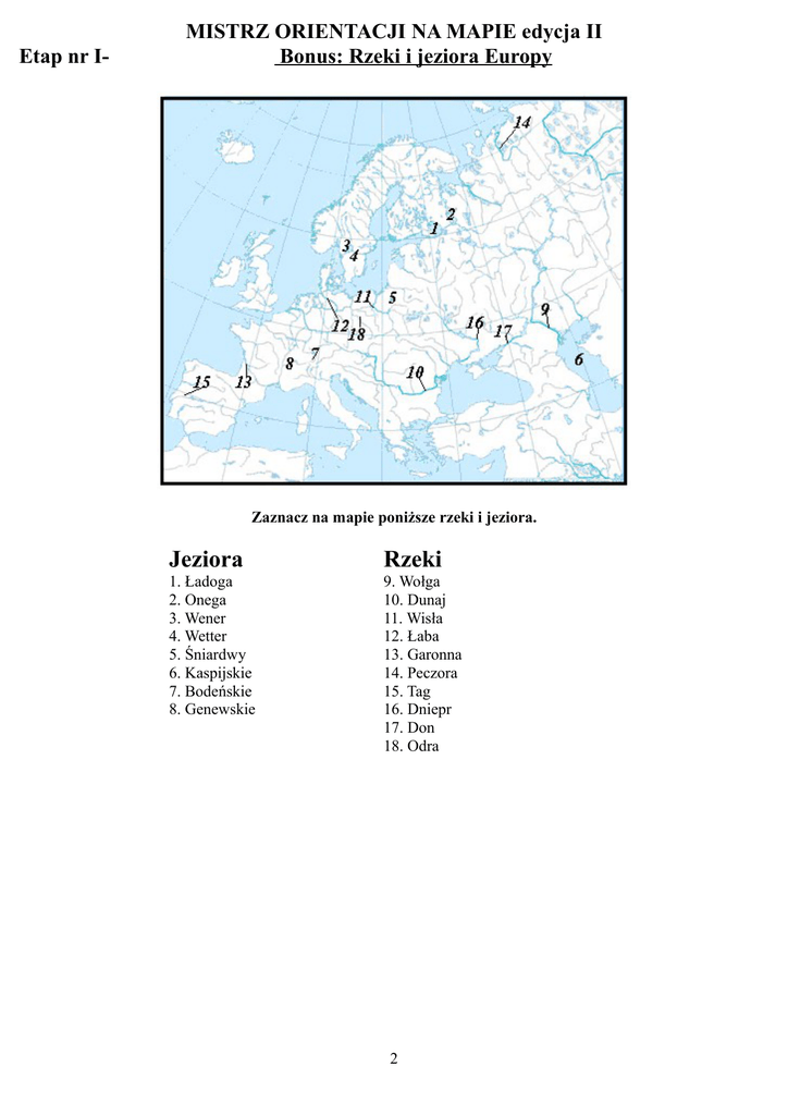 Etap nr I- MISTRZ ORIENTACJI NA MAPIE edycja II Bonus: Rzeki i jeziora Europy Zaznacz na mapie poniższe rzeki i jeziora. Jeziora Rzeki 1. Ładoga 2. Onega 3. Wener 4. Wetter 5. Śniardwy 6. Kaspijskie 7. Bodeńskie 8. Genewskie 9. Wołga 10. Dunaj 11. Wisła 12. Łaba 13. Garonna 14. Peczora 15. Tag 16. Dniepr 17. Don 18. Odra 2