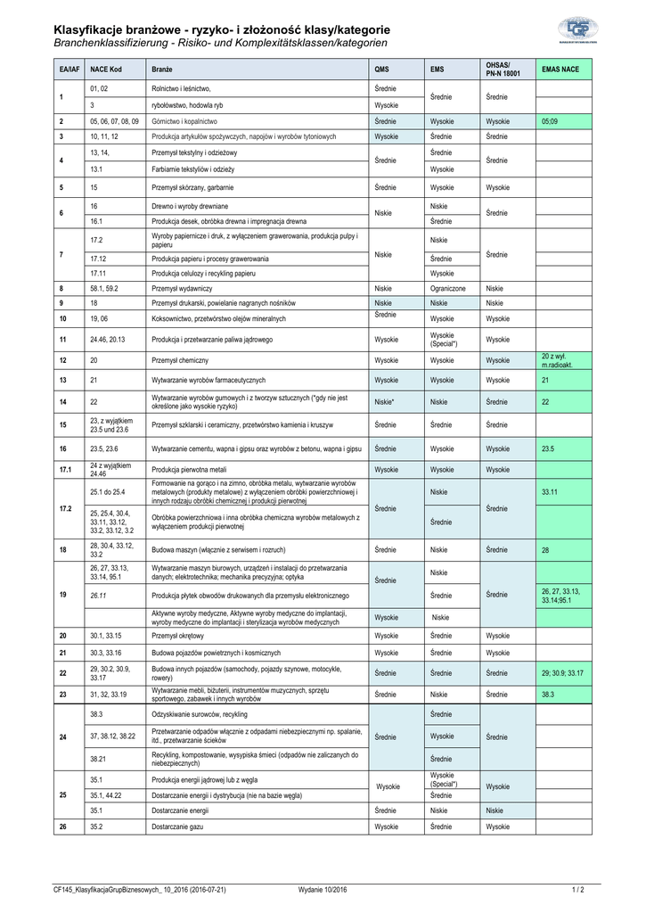 Klasyfikacje branżowe - ryzyko- i złożoność klasy/kategorie Branchenklassifizierung - Risiko- und Komplexitätsklassen/kategorien EA/IAF EMS OHSAS/ PN-N 18001 Średnie Średnie Średnie Wysokie Wysokie Wysokie Średnie Średnie NACE Kod Branże QMS 01, 02 Rolnictwo i leśnictwo, Średnie 3 rybołówstwo, hodowla ryb Wysokie 2 05, 06, 07, 08, 09 Górnictwo i kopalnictwo 3 10, 11, 12 Produkcja artykułów spożywczych, napojów i wyrobów tytoniowych 13, 14, Przemysł tekstylny i odzieżowy 13.1 Farbiarnie tekstyliów i odzieży 15 Przemysł skórzany, garbarnie 16 Drewno i wyroby drewniane 16.1 Produkcja desek, obróbka drewna i impregnacja drewna 17.2 Wyroby papiernicze i druk, z wyłączeniem grawerowania, produkcja pulpy i papieru 1 4 5 6 7 Średnie Średnie Niskie Średnie Wysokie Wysokie Niskie Średnie Wysokie Średnie Niskie Niskie Średnie Średnie Produkcja papieru i procesy grawerowania 17.11 Produkcja celulozy i recykling papieru 8 58.1, 59.2 Przemysł wydawniczy Niskie Ograniczone Niskie 9 18 Przemysł drukarski, powielanie nagranych nośników Niskie Niskie Niskie Wysokie Wysokie Wysokie 19, 06 05;09 Średnie 17.12 10 EMAS NACE Wysokie Średnie Koksownictwo, przetwórstwo olejów mineralnych 11 24.46, 20.13 Produkcja i przetwarzanie paliwa jądrowego Wysokie Wysokie (Special*) 12 20 Przemysł chemiczny Wysokie Wysokie Wysokie 20 z wył. m.radioakt. 13 21 Wytwarzanie wyrobów farmaceutycznych Wysokie Wysokie Wysokie 21 14 22 Wytwarzanie wyrobów gumowych i z tworzyw sztucznych (*gdy nie jest określone jako wysokie ryzyko) Niskie* Niskie Średnie 22 15 23, z wyjątkiem 23.5 und 23.6 Przemysł szklarski i ceramiczny, przetwórstwo kamienia i kruszyw Średnie Średnie Średnie 16 23.5, 23.6 Wytwarzanie cementu, wapna i gipsu oraz wyrobów z betonu, wapna i gipsu Średnie Wysokie Wysokie 17.1 24 z wyjątkiem 24.46 Produkcja pierwotna metali Wysokie Wysokie Wysokie 25.1 do 25.4 Formowanie na gorąco i na zimno, obróbka metalu, wytwarzanie wyrobów metalowych (produkty metalowe) z wyłączeniem obróbki powierzchniowej i innych rodzaju obróbki chemicznej i produkcji pierwotnej 17.2 18 19 Niskie Średnie 25, 25.4, 30.4, 33.11, 33.12, 33.2, 33.12, 3.2 Obróbka powierzchniowa i inna obróbka chemiczna wyrobów metalowych z wyłączeniem produkcji pierwotnej 28, 30.4, 33.12, 33.2 Budowa maszyn (włącznie z serwisem i rozruch) Średnie 26, 27, 33.13, 33.14, 95.1 Wytwarzanie maszyn biurowych, urządzeń i instalacji do przetwarzania danych; elektrotechnika; mechanika precyzyjna; optyka Średnie 26.11 Produkcja płytek obwodów drukowanych dla przemysłu elektronicznego 23.5 33.11 Średnie Średnie Niskie Średnie 28 Średnie 26, 27, 33.13, 33.14;95.1 Niskie Średnie Aktywne wyroby medyczne, Aktywne wyroby medyczne do implantacji, wyroby medyczne do implantacji i sterylizacja wyrobów medycznych Wysokie Niskie 20 30.1, 33.15 Przemysł okrętowy Wysokie Średnie Wysokie 21 30.3, 33.16 Budowa pojazdów powietrznych i kosmicznych Wysokie Średnie Wysokie 22 29, 30.2, 30.9, 33.17 Budowa innych pojazdów (samochody, pojazdy szynowe, motocykle, rowery) Średnie Średnie Średnie 29; 30.9; 33.17 23 31, 32, 33.19 Wytwarzanie mebli, biżuterii, instrumentów muzycznych, sprzętu sportowego, zabawek i innych wyrobów Średnie Niskie Średnie 38.3 38.3 Odzyskiwanie surowców, recykling 37, 38.12, 38.22 Przetwarzanie odpadów włącznie z odpadami niebezpiecznymi np. spalanie, itd., przetwarzanie ścieków 38.21 Recykling, kompostowanie, wysypiska śmieci (odpadów nie zaliczanych do niebezpiecznych) 35.1 Produkcja energii jądrowej lub z węgla 35.1, 44.22 Dostarczanie energii i dystrybucja (nie na bazie węgla) 35.1 Dostarczanie energii Średnie Niskie Niskie 35.2 Dostarczanie gazu Wysokie Średnie Wysokie 24 25 26 CF145_KlasyfikacjaGrupBiznesowych_ 10_2016 (2016-07-21) Średnie Średnie Średnie Średnie Wysokie Wydanie 10/2016 Wysokie Wysokie (Special*) Wysokie Średnie 1/2 Klasyfikacje branżowe - ryzyko- i złożoność klasy/kategorie Branchenklassifizierung - Risiko- und Komplexitätsklassen/kategorien EA/IAF NACE Kod Branże QMS EMS OHSAS/PN-N 18001 27 35.3, 36 Wodociągi, ciepłownictwo Średnie Średnie Średnie 28 41, 42, 43 Budownictwo Wysokie Wysokie Wysokie 46, 47, 95.2 Handel 46.12 Handel hurtowy i detaliczny paliw kopalnianych 29.2 45 Naprawa pojazdów samochodowych i motocykli Średnie Niskie Niskie 30 55, 56 Hotelarstwo Niskie Niskie Niskie 49, 50, 51, 52, 53 Transport i dystrybucja droga morską, lądową i powietrzną Magazynowanie; transport rurociągowy Średnie Średnie (Special*) Niskie 52 Transport i zarządzanie bez własnej floty 31.2 61 Telekomunikacja Średnie Ograniczone Niskie 32 64, 65, 66, 68, 77 Nieruchomości, wynajem nieruchomości, działalność kredytowa i ubezpieczeniowa, Wynajem ruchomości (bez personelu obsługującego) Średnie Ograniczone Ograniczone 33 61 Przetwarzanie danych, techniki informatyczne Średnie Ograniczone Niskie 70 34.1 72 Badania i rozwój Średnie Ograniczone Niskie 36 71.1 Architektoniczne i inżynierskie biura projektów 71.2 Badania laboratoryjne i techniczne 35 69, 70, 73, 74.2, 74.3, 78, 80, 81, 82 Dostarczanie usług dla przedsiębiorstw Niskie Ograniczone Ograniczone 36 84 Administracja publiczna, ochrona, ubezpieczenia społeczne Średnie Ograniczone Niskie 37 85, 88 Wychowanie i nauka bez internatów Niskie Ograniczone Średnie 38.1 86 Służba zdrowia Wysokie Średnie Wysokie 38.2 75 Weterynaria Średnie Średnie Wysokie 38.3 87, 88 Opieka Wysokie Średnie Wysokie 39 37, 38.1, 38.2, 39, 59.1, 60, 63.9, 79, 90, 91, 92, 93, 94, 96 Świadczenie innych usług publicznych i indywidualnych, Średnie Ograniczone (Specialne*) Niskie 39 37,38.1,38.2, 39 Świadczenie innych usług publicznych i indywidualnych, usługi z zakresu przetwarzania ścieków i kanalizacyjne Średnie Wysokie Wysokie 29.1 31.1 34.2 Niskie Niskie Średnie EMAS NACE 45 Niskie Niskie Średnie Ograniczone Średnie Niskie 37 38 38.1 * Następujące obszary / d