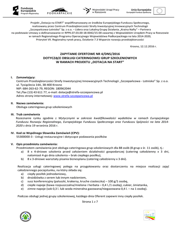Projekt „Dotacja na START” współfinansowany ze środków Europejskiego Funduszu Społecznego, realizowany przez Centrum Przedsiębiorczości Strefy Inwestycyjnej Innowacyjnych Technologii „Szczepańcowa-Lotnisko” Sp. z o.o. – Lidera oraz Lokalną Grupę Działania „Kraina Nafty” – Partnera na podstawie Umowy o dofinansowanie nr RPPK.07.03.00-18-0042/15-00 zawartej z Wojewódzkim Urzędem Pracy w Rzeszowie w ramach Regionalnego Programu Operacyjnego Województwa Podkarpackiego na lata 2014-2020, Priorytet VII. Regionalny rynek pracy, Działanie 7.3 Wsparcie rozwoju przedsiębiorczości Krosno, 12.12.2016 r. ZAPYTANIE OFERTOWE NR 4/DNS/2016 DOTYCZĄCE OBSŁUGI CATERINGOWEJ GRUP SZKOLENIOWYCH W RAMACH PROJEKTU „DOTACJA NA START” I. Zamawiający: Centrum Przedsiębiorczości Strefy Inwestycyjnej Innowacyjnych Technologii „Szczepańcowa - Lotnisko” Sp. z o.o. ul. Tysiąclecia 14A, 38-400 Krosno NIP: 684-263-62-79, REGON: 180962044 Tel./fax (13) 43 611 77, e-mail: [email protected] Adres strony internetowej: www.strefa-szczepancowa.pl II. Nazwa zamówienia: Obsługa cateringowa grup szkoleniowych III. Tryb zamówienia Rozeznanie rynku zgodnie z Wytycznymi w zakresie kwalifikowalości wydatków w ramach Europejskiego Funduszu Rozwoju Regionalnego, Europejskiego Funduszu Społecznego oraz Funduszu Spójności na lata 20142020 z dnia 19 września 2016 r. IV. Kod ze Wspólnego Słownika Zamówień (CPV): 55300000-3 - Usługi restauracyjne i dotyczące podawania posiłków V. Opis przedmiotu zamówienia: Przedmiotem zamówienia jest obsługa cateringowa grup szkoleniowych dla 88 osób (8 grup x śr. 11 osób), tj.: a) 8 x 4-dniowe szkolenia przed założeniem działalności gospodarczej (catering całodzienny x 3 dni, natomiast 4-go dnia szkolenia – brak ciepłego posiłku), b) 8 x 3-dniowe warsztaty pisania biznesplanu (catering całodzienny x 3 dni). Realizacja usługi cateringowej polega na przygotowaniu oraz dostarczeniu na miejsce realizacji zajęć całodziennego poczęstunku, na który składa się: a) ciepły posiłek jednodaniowy, b) drożdżówka z serem lub innym nadzieniem, c) susz konferencyjny (paluszki, krakersy, kruche ciasteczka) – 100 g/1 osobę, d) ciepłe napoje (kawa rozpuszczalna/mielona i herbata – 0,4 l./1 osobę), cukier, śmietanka, e) zimne napoje (sok 0,3 l. lub woda mineralna gazowana/niegazowana 0,4 l. – na 1 osobę). Podczas obsługi jednej grupy szkoleniowej, każdego dnia Oferent zapewni inny ciepły posiłek. Strona 1 z 7 Zamawiający zastrzega, że projekt jest skierowany m.in. do osób niepełnosprawnych i mogą wystąpić specyficzne potrzeby żywieniowe poszczególnych uczestników zajęć. Porcje ciepłego posiłku powinny być oddzielnie dla każdej osoby (zapakowane w jednorazowe pojemniki lub rozłożone na stołach we własnych naczyniach, zapewnione sztućce). Każdego dnia Oferent zapewni również serwetki. Oferent zobowiązany jest do uprzątnięcia każdorazowo pomieszczeń zarówno po zakończonym ciepłym posiłki, jak i po szkoleniu, tj. niepozostawiania na terenie obiektu jednorazowych/wielorazowych opakowań, naczyń, sztućców, itp. Oferent jest zobowiązany do świadczenia usług cateringowych wyłącznie z produktów spełniających normy jakości produktów spożywczych, przestrzegania przepisów prawnych w zakresie przechowania i przygotowania artykułów spożywczych (m.in. Ustawy z dnia 25 sierpnia 2006 r. o bezpieczeństwie żywności i żywienia, Dz. U. z 2006 r., nr 171, poz. 1225 ze zm.), zapewnienia posiłków wysokiej jakości, zarówno co do wartości odżywczej (pełnowartościowych), gramatury (odpowiadających racji pokarmowej dla dorosłego człowieka), jak i estetyki (estetycznie podanych). Zamawiający zastrzega możliwość realizacji minimum dwóch grup szkoleniowych jednocześnie. Oferent zatrudni do realizacji przedmiotu zamówienia osoby, będące w trudnej sytuacji na rynku pracy, tj. osoby bezrobotne lub młodociane w celu przygotowania zawodowego, osoby niepełnosprawne, osoby bezdomne realizujące indywidualny program wychodzenia z bezdomności, osoby uzależnione od alkoholu po zakończeniu psychoterapii w zakładzie lecznictwa odwykowego, osoby uzależnione od narkotyków lub innych środków odurzających po zakończeniu programu terapeutycznego w zakładzie opieki zdrowotnej, osoby chore psychicznie, osoby zwalniane z zakładów karnych, uchodźców realizujących indywidualny program integracji (zgodnie z art. 29 ust. 4 Ustawy z dnia 29 stycznia 2004 r. Prawo Zamówień Publicznych, Dz. 2004, Nr 19, poz. 177 z późn. zm.). VI. Przewidywany termin realizacji zamówienia: 1. Planowany termin rozpoczęcia realizacji zamówienia – 27 grudnia 2016 r. 2. Planowany termin zakończenia realizacji zamówienia – maksymalnie maj 2017 r. 3. Szkolenia będą realizowane przez Zamawiającego z podziałem na 4 nabory rekrutacji od poniedziałku do niedzieli włącznie w godzinach 8.00-20.00. 4. Szczegółowe terminy realizacji zamówienia Zamawiający uzgodni z Oferentem po podpisaniu umowy. 5. Zamawiający zastrzega możliwość zmiany terminu realizacji zamówienia. VII. Miejsce realizacji zamówienia: Krosno, ewentualnie inne miejscowości na obszarze realizacji projektu (Krosno oraz powiaty: bieszczadzki, brzozowski, dębicki, jasielski, krośnieński, leski, sanocki, strzyżowski). VIII. Warunki udziału w postępowaniu: 1. Do składania ofert zapraszamy wyłącznie Oferentów spełniających łącznie następujące warunki: a) Nie są powiązani z Zamawiającym osobowo lub kapitałowo. Przez powiązania kapitałowe lub osobowe rozumie się wzajemne powiązania między Oferentem a Zamawiającym lub osobami upoważnionymi do zaciągania zobowiązań w imieniu Zamawiającego lub osobami wykonującymi w imieniu Zamawiającego Strona 2 z 7 czynności związane z przygotowaniem i przeprowadzeniem procedury wyboru Oferenta, polegające w szczególności na: - uczestniczeniu w spółce jako