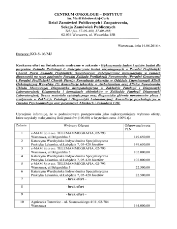 CENTRUM ONKOLOGII – INSTYTUT im. Marii Skłodowskiej-Curie Dział Zamówień Publicznych i Zaopatrzenia, Sekcja Zamówień Publicznych Tel./ fax. 57-09-480, 57-09-488; 02-034 Warszawa, ul. Wawelska 15B ----------------------------------------------------------------------------------------------------------------- Warszawa, dnia 14.06.2016 r. Dotyczy: KO-8-16/MJ Konkursu ofert na Świadczenia medyczne w zakresie - Wykonywanie badań i opisów badań dla pacjentów Zakładu Radiologii I; Zabezpieczenie badań skryningowych w Poradni Profilaktyki Chorób Piersi Zakładu Profilaktyki Nowotworów; Zabezpieczenie mammografii w ramach diagnostyki na rzecz pacjentów Poradni Zakładu Profilaktyki Nowotworów (Poradni Genetycznej i Poradni Profilaktyki Chorób Piersi); Konsultacje lekarskie w Oddziale Chemioterapii Klinik Onkologicznej Wawelska 15; Konsultacje lekarskie w Ambulatorium oraz Klinice Nowotworów Układu Moczowego; Diagnostyka histopatologiczna w Zakładzie Patologii i Diagnostyki Laboratoryjnej; Diagnostyka i konsultacje chłoniaków w Zakładzie Patologii Diagnostyki Laboratoryjnej; Ocena materiału cytologicznego oraz diagnostyka głównie nowotworów płuca i śródpiersia w Zakładzie Patologii i Diagnostyki Laboratoryjnej; Konsultacje psychologiczne w Poradni Psychoonkologii oraz pozostałych Klinikach i Zakładach COI. Uprzejmie informuję, że w podmiotowym postępowaniu jako najkorzystniejsze wybrano oferty, które uzyskały maksymalną ilość punktów (100,00) w kryterium cena -100% tj.: Zadanie 1 2 3 4 5 6 7 Wybrany Oferent e-MAM Sp.z o.o. TELEMAMMOGRAFIA, 02-793 Warszawa, ul.Belgardzka 5 Katarzyna Wardzyńska Indywidualna Specjalistyczna Praktyka Lekarska, ul.Łabędzia 7, 05-420 Józefów e-MAM Sp.z o.o. TELEMAMMOGRAFIA, 02-793 Warszawa, ul.Belgardzka 5 Katarzyna Wardzyńska Indywidualna Specjalistyczna Praktyka Lekarska, ul.Łabędzia 7, 05-420 Józefów e-MAM Sp.z o.o. TELEMAMMOGRAFIA, 02-793 Warszawa, ul.Belgardzka 5 Katarzyna Wardzyńska Indywidualna Specjalistyczna Praktyka Lekarska, ul.Łabędzia 7, 05-420 Józefów - brak ofert – 8 - brak ofert – 9 - brak ofert – 10 Agnieszka Turowicz – ul. Sosnowskiego 4/11, 02-784 Warszawa Oferowana kwota PLN 149.650,00 149.650,00 102.000,00 102.000,00 22.500,00 22.500,00 144.000,00 11 12 13 Beata Gierej - Specjalistyczna Praktyka Lekarska, ul.Jana Kędzierskiego 6/22, 01-493 Warszawa Włodzimierz Olszewski, ul. Św. Maksymiliana Kolbego 2A, 02-781 Warszawa Renata Mizerska, ul.Białostocka 9 lok.18, 03-741 Warszawa 62.000,00 105.330,00 48.128,00 W zadaniach: - nr 7 tj. „Konsultacje lekarskie w Oddziale Chemioterapii Klinik Onkologicznej Wawelska 15”; - nr 8 tj. „Konsultacje lekarskie w Ambulatorium oraz Klinice Nowotworów Układu Moczowego”; - nr 9 tj. „Konsultacje lekarskie w Ambulatorium oraz Klinice Nowotworów Układu Moczowego”; nie zostały złożone ofert, w związku z czym Zamawiający unieważnia konkurs ofert w części dotyczący zadań o numerach 7,8 i 9. Zawarcie umów dla zadań nr 1-6 oraz 10-13 nastąpi w siedzibie Zamawiającego, w terminie jak najkrótszym. Zastępca Dyrektora ds. Zarządzania i Finansów Centrum Onkologii – Instytut im. Marii Skłodowskiej – Curie mgr Sławomir Gadomski