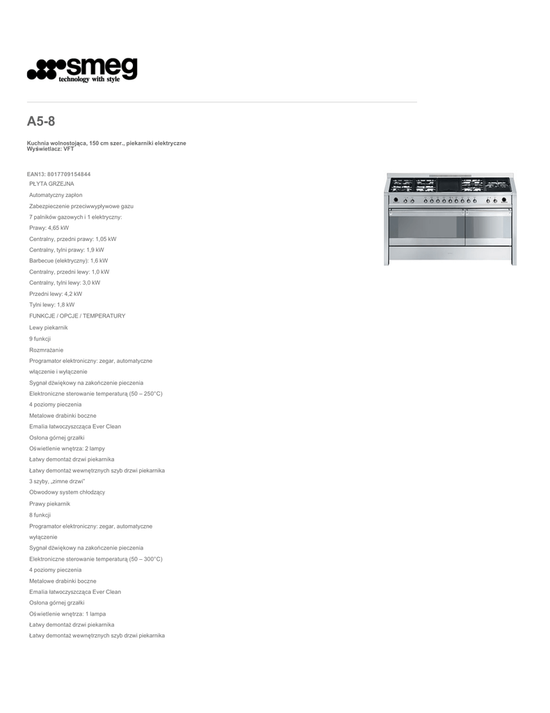A5-8 Kuchnia wolnostojąca, 150 cm szer., piekarniki elektryczne Wyświetlacz: VFT EAN13: 8017709154844 PŁYTA GRZEJNA Automatyczny zapłon Zabezpieczenie przeciwwypływowe gazu 7 palników gazowych i 1 elektryczny: Prawy: 4,65 kW Centralny, przedni prawy: 1,05 kW Centralny, tylni prawy: 1,9 kW Barbecue (elektryczny): 1,6 kW Centralny, przedni lewy: 1,0 kW Centralny, tylni lewy: 3,0 kW Przedni lewy: 4,2 kW Tylni lewy: 1,8 kW FUNKCJE / OPCJE / TEMPERATURY Lewy piekarnik 9 funkcji Rozmrażanie Programator elektroniczny: zegar, automatyczne włączenie i wyłączenie Sygnał dźwiękowy na zakończenie pieczenia Elektroniczne sterowanie temperaturą (50 – 250°C) 4 poziomy pieczenia Metalowe drabinki boczne Emalia łatwoczyszcząca Ever Clean Osłona górnej grzałki Oświetlenie wnętrza: 2 lampy Łatwy demontaż drzwi piekarnika Łatwy demontaż wewnętrznych szyb drzwi piekarnika 3 szyby, „zimne drzwi” Obwodowy system chłodzący Prawy piekarnik 8 funkcji Programator elektroniczny: zegar, automatyczne wyłączenie Sygnał dźwiękowy na zakończenie pieczenia Elektroniczne sterowanie temperaturą (50 – 300°C) 4 poziomy pieczenia Metalowe drabinki boczne Emalia łatwoczyszcząca Ever Clean Osłona górnej grzałki Oświetlenie wnętrza: 1 lampa Łatwy demontaż drzwi piekarnika Łatwy demontaż wewnętrznych szyb drzwi piekarnika 3 szyby, „zimne drzwi” Obwodowy system chłodzący WYPOSAŻENIE STANDARDOWE Ruszty żewliwne: 4 Barbecue: 1 Dysze do gazu G30 Głęboka blacha (40 mm): 1 - prawy piekarnik Blacha do pieczenia (maxi): 2 - lewy piekarnik Ruszt: 2 - lewy piekarnik / 1 - prawy piekarnik Panele katalityczne: 3 - lewy piekarnik / 3 - prawy piekarnik Rożen: 1 - lewy piekarnik Akcesoria „Pizza”: 1 - prawy piekarnik SPECYFIKACJA TECHNICZNA Moc przyłączeniowa: 7,7 kW Moc grilla: 2,8 kW Napięcie: 220-240 V Zabezpieczenie: 34 A Częstotliwość: 50/60 Hz Functions Piekarnik główny Piekarnik dodatkowy Opcje KIT1A5-5 - Płyta przeciwtłuszczowa TPKX - Nakładka tepanyaki Smeg Polska Sp. z o.o. ul. Cybernetyki 9 02-677 Warszawa Tel. +48 22 276 14 00 A5-8 kuchnia wolnostojąca Opera 150 cm stal nierdzewna typ kuchni: gazowo-elektryczne typ piekarniki: Elektryczne klasa energochłonności A Piekarnik główny Klasa A: Klasa A piekarnika zapewnia niskie zużycie energii. MAXI OBJĘTOŚĆ: Komora kuchni wolnostojącej 70 l (brutto is 90 l) CHŁODNE DRZWI: Większość piekarników firmy SMEG posiada “chłodne drzwi”. Dzięki połączeniu systemu obwodowego chłodzenia i wewnętrznym szybom odbijającym ciepło, temperatura zewnętrznej powierzchni drzwi jest utrzymywana poniżej 50 ° C. Dodatkowo system ten chroni meble będące w kontakcie z piekarnikiem przed przegrzewaniem. POZIOMY PIEKARNIKA: Kuchnie wolnostojące posiadają 4 poziomy pieczenia, co pozwala na pieczenie kilku potraw jednocześnie. OSŁONA GÓRNEJ GRZAŁKI: Rozwiązanie to chroni górną część piekarnika przed zanieczyszczeniem. Element chroniący jest łatwy w demontażu i może być myty w zmywarce. POTRÓJNIE OSZKLONE DRZWI: Zewnętrzna powierzchnia nawet podczas długiego pieczenia pozostaje zimna, co zapewnia maksymalne bezpieczeństwo użytkowania. Natomiast dwie wewnętrzne szyby odbijają ciepło, co ma znaczenie dla efektywności używanej energii. DEMONTOWALNE SZKŁO WEWNĘTRZNE: W większości piekarników firmy SMEG szkło wewnątrz drzwi jest łatwe w demontażu, co również znacznie ułatwia utrzymanie w czystości urządzenia. JEDNOLITE SZKŁO WEWNĘTRZNE: W większości piekarników firmy SMEG zainstalowane w drzwiach szkło wewnętrzne posiada wyjątkowo gładką powierzchnię, bez żadnych wkrętów, co znacznie ułatwia utrzymanie w czystości urządzenia. EMALIA ŁATWOCZYSZCZĄCA EVER CLEAN: Emalia, którą jest pokryte wnętrze piekarników. Jest niezwykle łatwa w czyszczeniu, ze względu na znikomą interakcję z tłuszczami i odporność na różne kwasy. STATYCZNY SYSTEM CHŁODZENIA: Innowacyjny STATYCZNY system chłodzenia pomaga chronić meble od nadmiernej temperatury podczas pracy urządzenia. GRZAŁKA GÓRNA I DOLNA: Włączenie tych 2 grzałek stosuje się w pieczeniu tradycyjnym, odpowiednim do przygotowanie potraw wymagających delikatnego podgrzewania, jak np. pieczenie ciasta. Piekarnik powinien zostać wstępnie nagrzany do wymaganej temperatury, a naczynie ustawione po środku. Jest to metoda , która najlepiej sprawdza się w przypadku większych, pojedynczych wypieków. WENTYLATOR, GRZAŁKA GÓRNA I DOLNA: Grzałki w połączeniu z wentylatorem zapewniają równomierną temperaturę w całej komorze. Jest to metoda dająca podobne efekty do pieczenia tradycyjnego. Mniej wydajna od użycia wentylatora i 3 grzalek. Najlepsza do wypieku ciast. GRZAŁKA GRILLA: Funkcja uzywana do szybkiego podgrzewania. Aby uzyskać najlepsze rezultaty należy małe potrawy umieścić na górnej półce, a potrawy większe - na dolnej (np. mięso, lub kiełbasę). Najlepsze efekty uzyskuje się przy zamkniętych drzwiczkach, chyba że przepis podpowiada co innego. WENTYLATOR I GRZAŁKA GRILLA: Pieczenie przy uzyciu tej funkcji musi przebiegać przy zamkniętych drzwiczkach. Wentylator łagodzi silne grzanie grilla, jednocześnie zapewniając doskonałe grillowanie bez potrzeby odwracania pieczonej potrawy. Otrzymujemy potrawę doskonale przypieczoną, a zarazem soczystą. Najlepsze efekty zapewnia pieczenie na dwóch górnych półkach. Dolna część piekarnika może być w tym czasie wykorzystana do podgrzania innych potraw. WENTYLATOR, GRZAŁKA DOLNA: Dodanie dolnej grzałki do wymuszonego obiegu podnosi temperaturę w dolnej części potrawy, zapewniając jej skuteczniejsze pieczenie środka bez przypiekania powierzchni. WENTYLATOR, GRZAŁKA PIERŚCIENIOWA I DOLNA: Dodanie grzałki dolnej powoduje dostarczenie dodatkowego ciepła do spodu potrawy niezbędnego do jej podgrzania. WENTYLATOR, GRZAŁKA PIERŚCIENIOWA: Grzałka w połączeniu z wentylatorem zapewniają równomiern