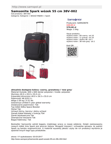 http://www.samspol.pl Samsonite Spark wózek 55 cm 38V-002 kod produktu: 38V-002 kategoria: Kategorie > BAGAŻ MIĘKKI > Spark Producent: SAMSONITE 649,00 zł 570,00 zł Waga: 2.5kg Opcje produktu: wybierz kolor:: 09 czarny szt.10 wybierz kolor:: 11 granat szt.10 wybierz kolor:: skalny 08 szt.1 wybierz kolor:: 38 new grey szt.1 Kod QR: aktualnie dostępne kolory: czarny, granatowy i 'new grey' Materiał Outside: 600 x 600 denier polyester / Inside: polyester Wymiary 40.0 x 20.0 x 55.0 cm Expanded dimension 40.0 x 26.5 x 55.0 cm Pojemność 48.5/55.5 L Waga 2.50 kg | 5.51 lbs Gwarancja Limited 5 year global warranty Zwiększanie pojemności: Tak Typ kółek Kółka Space Booster Stelaż Tak Uchwyt Górny, boczny i dolny uchwyt Zamek Kabel blokady z funkcją TSA Zamki błyskawiczne Tak Zewnętrzne kieszenie Tak Bagaż Kabinowy: Tak Bestseller Samsonite wśród bagażu miękkiego wraca w nowej odsłonie. Dzięki zastosowaniu nowych kółek linia Spark jest jeszcze lżejsza. Mnogość kieszeni i schowków sprawia, że walizki Spark są bardzo ergonomiczne. A materiał wysokiej jakości użyty do ich produkcji wyróżnia je spośród innych tego typu produktów. strona: 1/1 wydrukowano: 02-03-2017 http://www.samspol.pl/samsonite-spark-wozek-55-cm-38v-002.html
