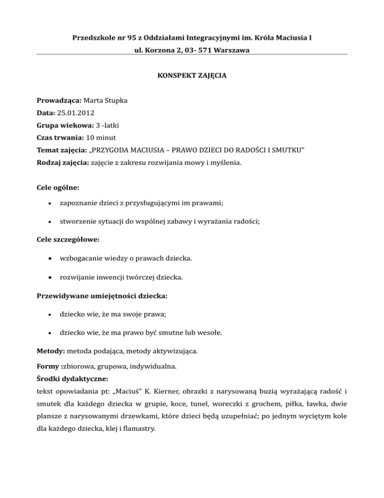Przedszkole nr 95 z Oddziałami Integracyjnymi im. Króla Maciusia I ul. Korzona 2, 03- 571 Warszawa KONSPEKT ZAJĘCIA Prowadząca: Marta Stupka Data: 25.01.2012 Grupa wiekowa: 3 -latki Czas trwania: 10 minut Temat zajęcia: „PRZYGODA MACIUSIA – PRAWO DZIECI DO RADOŚCI I SMUTKU” Rodzaj zajęcia: zajęcie z zakresu rozwijania mowy i myślenia. Cele ogólne: zapoznanie dzieci z przysługującymi im prawami; stworzenie sytuacji do wspólnej zabawy i wyrażania radości; Cele szczegółowe: wzbogacanie wiedzy o prawach dziecka. rozwijanie inwencji twórczej dziecka. Przewidywane umiejętności dziecka: dziecko wie, że ma swoje prawa; dziecko wie, że ma prawo być smutne lub wesołe. Metody: metoda podająca, metody aktywizująca. Formy :zbiorowa, grupowa, indywidualna. Środki dydaktyczne: tekst opowiadania pt: „Maciuś” K. Kierner, obrazki z narysowaną buzią wyrażającą radość i smutek dla każdego dziecka w grupie, koce, tunel, woreczki z grochem, piłka, ławka, dwie plansze z narysowanymi drzewkami, które dzieci będą uzupełniać; po jednym wyciętym kole dla każdego dziecka, klej i flamastry. PRZEBIEG ZAJĘĆ CZĘŚĆ WSTĘPNA 1. Zabawa integracyjna na dobry i miły początek dnia przy piosence „ Czy jesteś z nami”. Czy …(imię) jest dziś z nami? Tak, jestem razem z wami. O, …(imię) jest dziś z nami, Witany ją (go) brawami! Dzieci stoją w kręgu. Pyta osoba prowadząca, odpowiada osoba wywołana. Wszyscy witają ją brawami. Przesyłają buziaki. Śpiewają piosenkę kilka razy, wywołując inne dzieci. Na zakończenie zmiana tekstu: Czy wszyscy są dziś z nami? Tak, jesteśmy razem z wami! O, wszyscy są dziś z nami, Witamy się brawami. 2. Rozmowa na temat prawa dziecka do radości i smutku. Nauczycielka wprowadzając dzieci w treść zajęcia mówi, że każde dziecko ma prawo być radosne, wesołe, a czasami smutne i ma prawo to wyrażać poprzez śmiech, okrzyki radości, przez zabawę lub przez płacz i niechęć do zabawy. W każdej sytuacji dziecko ma prawo zwrócić się ze swoimi emocjami do nauczycielki i być przez nią wysłuchane. 3. Dzieci otrzymują obrazki z buzią uśmiechniętą i smutną do wyrażania emocji podczas słuchania opowiadania czytanego przez nauczycielkę. CZĘŚĆ GŁÓWNA: 1. Słuchanie opowiadania pt: „ Maciuś ”. Nauczyciel - przeczytam wam teraz krótkie opowiadanie. Chciałabym, abyście w momencie, gdy będę zadawała pytania, podnosili do góry buzie wyrażające smutek lub radość, które waszym zdaniem przeżywają bohaterowie opowiadania. Maciuś przyszedł do przedszkola z mamą. Wszedł do klasy i już miał zostać i bawić się z dziećmi, ale postanowił jeszcze raz mamę pocałować i pożegnać się. Mocno przytulił się do mamy i zrobiło mu się smutno, że mama z nim nie zostanie. (Jak czuł się Maciuś?, Podnieście proszę rysunek twarzy wyrażający jego uczucia). Po krótkiej chwili Maciuś pożegnał się z mamą i podszedł do bawiących się kolegów, którzy budowali zamek z klocków. Maciuś zaczął bawić się z nimi. Razem zbudowali ogromną wieżę zamkową. Maciuś bardzo się cieszył, że wieża jest taka wysoka. Proszę pani, proszę zobaczyć jaką wielką wieżę zbudowaliśmy -krzyczał z radości na cały głos. (Pokażcie teraz rysunek twarzy wyrażający uczucia Maciusia, a następnie rysunek twarzy odpowiadający temu, jak czułby się każdy z was). Maciuś zmęczył się trochę zabawą i usiadł z boku. Siedział sam i myślał, że chciałby być z mamą, zaczął płakać. Pani nauczycielka podeszła do niego i zapytała go, dlaczego płacze? Chcę do mamy- powiedział Maciuś. (Podnieście rysunek twarzy wyrażający uczucie Maciusia, a następnie rysunek twarzy odpowiadający temu jak czułby się każdy z was). Pani przytuliła Maciusia i powiedziała, że mama po niego przyjdzie. Koledzy Maciusia bardzo chcieli się z nim bawić. Maciek wiedział już, że niedługo zobaczy się z mamą. Koledzy zbudowali ulice dla samochodów i można było się dobrze bawić. Maciek wziął samochód i jeżdżąc nim po ulicy bardzo się cieszył. Rozmowa na temat opowiadania kierowana pytaniami: Przykłady pytań: Z kim przyszedł do przedszkola Maciuś? Z kim bawił się Maciuś? Co dzieci zbudowały? Dlaczego Maciuś płakał? Co zrobiła pani? Jak więc widzicie, w różnych sytuacjach przeżywamy różne uczucia i każdy z was ma prawo być wesoły, radosny, uśmiechnięty, a czasami smutny. Ja, chciałabym, aby dzieci były jak najczęściej wesołe, dlatego teraz zapraszam was do zabawy. Zabawa ruchowa „Podróż do krainy dobrego humoru”. Nauczyciel mówi dzieciom, że do krainy dobrego humoru można dotrzeć pokonując tor przeszkód. Będzie to: przejście przez tunel, ślizganie się na kocach, skoki po kamieniach, turlanie piłki i przejście po ławeczce. 6. Zabawa „Drzewo radości i smutku” – Dzieci otrzymują wycięte koło i flamaster. Nauczyciel prosi, aby dzieci narysowały, co teraz czują radość czy smutek. Dzieci po kolei podchodzą i przyczepiają swoje koła do odpowiedniego drzewka. ZAKOŃCZENIE- PODSUMOWANIE 1. Podsumowanie zajęć. 2. Zabawa ruchowo- naśladowcza „ Naśladujemy ruchy”.Dzieci wraz z nauczycielem stoją w kole. Zabawę rozpoczyna nauczyciel, wykonując określony ruch, a pozostałe osoby go naśladują (machają ręką, przesyłają buziaki). Potem ruch wykonuje dziecko stojące z prawej strony nauczyciela. 3. Podziękowanie dzieciom za wspólną zabawę.Dzieci głośnym okrzykiem -Hurrawyrażają jak bardzo podobała im się wspólna zabawa.