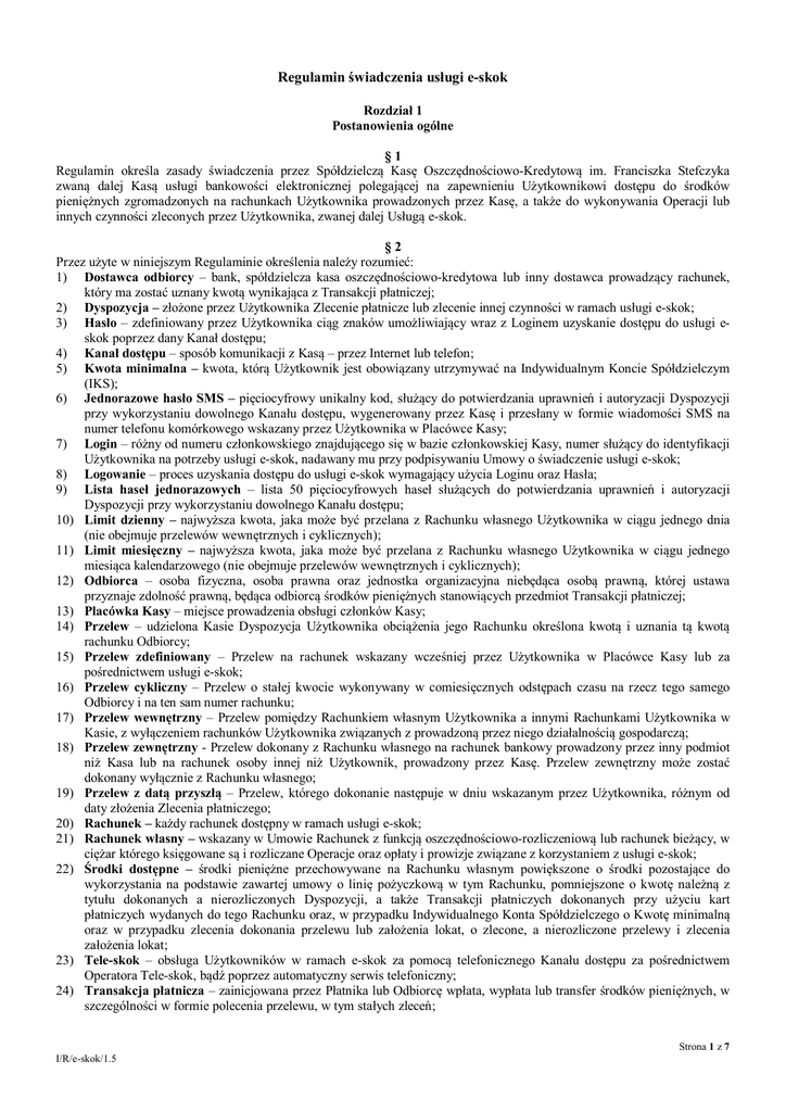 Regulamin świadczenia usługi e-skok Rozdział 1 Postanowienia ogólne §1 Regulamin określa zasady świadczenia przez Spółdzielczą Kasę Oszczędnościowo-Kredytową im. Franciszka Stefczyka zwaną dalej Kasą usługi bankowości elektronicznej polegającej na zapewnieniu Użytkownikowi dostępu do środków pieniężnych zgromadzonych na rachunkach Użytkownika prowadzonych przez Kasę, a także do wykonywania Operacji lub innych czynności zleconych przez Użytkownika, zwanej dalej Usługą e-skok. §2 Przez użyte w niniejszym Regulaminie określenia należy rozumieć: 1) Dostawca odbiorcy – bank, spółdzielcza kasa oszczędnościowo-kredytowa lub inny dostawca prowadzący rachunek, który ma zostać uznany kwotą wynikająca z Transakcji płatniczej; 2) Dyspozycja – złożone przez Użytkownika Zlecenie płatnicze lub zlecenie innej czynności w ramach usługi e-skok; 3) Hasło – zdefiniowany przez Użytkownika ciąg znaków umożliwiający wraz z Loginem uzyskanie dostępu do usługi eskok poprzez dany Kanał dostępu; 4) Kanał dostępu – sposób komunikacji z Kasą – przez Internet lub telefon; 5) Kwota minimalna – kwota, którą Użytkownik jest obowiązany utrzymywać na Indywidualnym Koncie Spółdzielczym (IKS); 6) Jednorazowe hasło SMS – pięciocyfrowy unikalny kod, służący do potwierdzania uprawnień i autoryzacji Dyspozycji przy wykorzystaniu dowolnego Kanału dostępu, wygenerowany przez Kasę i przesłany w formie wiadomości SMS na numer telefonu komórkowego wskazany przez Użytkownika w Placówce Kasy; 7) Login – różny od numeru członkowskiego znajdującego się w bazie członkowskiej Kasy, numer służący do identyfikacji Użytkownika na potrzeby usługi e-skok, nadawany mu przy podpisywaniu Umowy o świadczenie usługi e-skok; 8) Logowanie – proces uzyskania dostępu do usługi e-skok wymagający użycia Loginu oraz Hasła; 9) Lista haseł jednorazowych – lista 50 pięciocyfrowych haseł służących do potwierdzania uprawnień i autoryzacji Dyspozycji przy wykorzystaniu dowolnego Kanału dostępu; 10) Limit dzienny – najwyższa kwota, jaka może być przelana z Rachunku własnego Użytkownika w ciągu jednego dnia (nie obejmuje przelewów wewnętrznych i cyklicznych); 11) Limit miesięczny – najwyższa kwota, jaka może być przelana z Rachunku własnego Użytkownika w ciągu jednego miesiąca kalendarzowego (nie obejmuje przelewów wewnętrznych i cyklicznych); 12) Odbiorca – osoba fizyczna, osoba prawna oraz jednostka organizacyjna niebędąca osobą prawną, której ustawa przyznaje zdolność prawną, będąca odbiorcą środków pieniężnych stanowiących przedmiot Transakcji płatniczej; 13) Placówka Kasy – miejsce prowadzenia obsługi członków Kasy; 14) Przelew – udzielona Kasie Dyspozycja Użytkownika obciążenia jego Rachunku określona kwotą i uznania tą kwotą rachunku Odbiorcy; 15) Przelew zdefiniowany – Przelew na rachunek wskazany wcześniej przez Użytkownika w Placówce Kasy lub za pośrednictwem usługi e-skok; 16) Przelew cykliczny – Przelew o stałej kwocie wykonywany w comiesięcznych odstępach czasu na rzecz tego samego Odbiorcy i na ten sam numer rachunku; 17) Przelew wewnętrzny – Przelew pomiędzy Rachunkiem własnym Użytkownika a innymi Rachunkami Użytkownika w Kasie, z wyłączeniem rachunków Użytkownika związanych z prowadzoną przez niego działalnością gospodarczą; 18) Przelew zewnętrzny - Przelew dokonany z Rachunku własnego na rachunek bankowy prowadzony przez inny podmiot niż Kasa lub na rachunek osoby innej niż Użytkownik, prowadzony przez Kasę. Przelew zewnętrzny może zostać dokonany wyłącznie z Rachunku własnego; 19) Przelew z datą przyszłą – Przelew, którego dokonanie następuje w dniu wskazanym przez Użytkownika, różnym od daty złożenia Zlecenia płatniczego; 20) Rachunek – każdy rachunek dostępny w ramach usługi e-skok; 21) Rachunek własny – wskazany w Umowie Rachunek z funkcją oszczędnościowo-rozliczeniową lub rachunek bieżący, w ciężar którego księgowane są i rozliczane Operacje oraz opłaty i prowizje związane z korzystaniem z usługi e-skok; 22) Środki dostępne – środki pieniężne przechowywane na Rachunku własnym powiększone o środki pozostające do wykorzystania na podstawie zawartej umowy o linię pożyczkową w tym Rachunku, pomniejszone o kwotę należną z tytułu dokonanych a nierozliczonych Dyspozycji, a także Transakcji płatniczych dokonanych przy użyciu kart płatniczych wydanych do tego Rachunku oraz, w przypadku Indywidualnego Konta Spółdzielczego o Kwotę minimalną oraz w przypadku zlecenia dokonania przelewu lub założenia lokat, o zlecone, a nierozliczone przelewy i zlecenia założenia lokat; 23) Tele-skok – obsługa Użytkowników w ramach e-skok za pomocą telefonicznego Kanału dostępu za pośrednictwem Operatora Tele-skok, bądź poprzez automatyczny serwis telefoniczny; 24) Transakcja płatnicza – zainicjowana przez Płatnika lub Odbiorcę wpłata, wypłata lub transfer środków pieniężnych, w szczególności w formie polecenia przelewu, w tym stałych zleceń; Strona 1 z 7 I/R/e-skok/1.5 25) Umowa – umowa o świadczenie usługi e-skok; 26) Użytkownik – członek Kasy w tym przedsiębiorca, z wyłączeniem podmiotów, o których mowa w art. 10 ust. 2 ustawy z dnia 5 listopada 2009 r. o spółdzielczych kasach oszczędnościowo – kredytowych Dz. U. 2012, poz. 855), który na podstawie Umowy jest uprawniony do składania Dyspozycji. W przypadku spółki cywilnej wspólnicy w umowie wskazują osobę, którą upoważniają do składania Dyspozycji w ich imieniu; 27) Godzina graniczna – określony przez Kasę nieprzekraczalny, przypadający pod koniec dnia roboczego moment, po którym otrzymane Zlecenie płatnicze uznaje się za otrzymane pierwszego dnia roboczego po tym dniu; 28) Zlecenie płatnicze – oświadczenie Płatnika lub Odbiorcy skierowane do jego dostawcy z