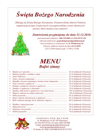 Święta Bożego Narodzenia Zbliżają się Święta Bożego Narodzenia. Postanowiliśmy ułatwić Państwu organizację przyjęć świątecznych i przygotowaliśmy zestaw domowych potraw, które można u nas zamówić. Zamówienia przyjmujemy do dnia 21.12.2016: pod numerami telefonów: 606-330-000 lub (22) 855-07-01, adresem mailowym: [email protected] oraz na miejscu w restauracji, na ul. Wiolinowej 14. Potrawy odbierać można do dnia 24.12.2016 (24.12.2016 między godz. 11:00 a 13:00) MENU Bufet zimny • • • • • • • • • • • • • Śledzie na 3 sposoby ....................................................................... Śledź po polsku z cebulką w oleju ................................................... Tatar śledziowy ............................................................................... Tatar z łososia wędzonego .............................................................. Roladki z łososia wędzonego z kozim serem i kaparami ................. Filet z łososia w galarecie .............................................................. Rolada z sandacza i łososia w galarecie ........................................ Sandacz w galarecie z chrzanem .................................................... Sandacz (lub łosoś) w galarecie z owocami morza ......................... Węgorz wędzony na sałatce jajecznej ............................................. Ryba po grecku ................................................................................ Karp z musem chrzanowym w galarecie ......................................... Ryby wędzone (pstrąg, łosoś, makrela, węgorz) ............................. 45 zł /półmisek (10 porcji) 35 zł /półmisek (10 porcji) 45 zł /półmisek (10 porcji) 95 zł /półmisek (10 porcji) 65 zł /półmisek (10 porcji) 70 zł /półmisek (10 porcji) 75 zł /półmisek (10 porcji) 70 zł /półmisek (10 porcji) 105 zł /półmisek (10 porcji) 120 zł /półmisek (10 porcji) 65 zł /półmisek (10 porcji) 65 zł /półmisek (10 porcji) 80 zł /półmisek (10 porcji) • • • • Wędliny i mięsa pieczone ................................................................ Mięsa pieczyste ............................................................................... Schab po warszawsku ..................................................................... Wybór pasztetów ............................................................................ 56 zł /półmisek (10 porcji) 70 zł /półmisek (10 porcji) 65 zł /półmisek (10 porcji) 70 zł /półmisek (10 porcji) GOSPODA POD MŁYNEM ul. Wiolinowa 14, 02-785 Warszawa tel. (22) 855-07-01, tel. kom. 606-330-000 e-mail: [email protected] www.gospodapodmlynem.pl Nr konta: 03 1020 1169 0000 8102 0175 9752 • • • • Indyk na musie z tuńczyka ............................................................... Rolada z kurczaka z pistacjami ....................................................... Galaretki z kurczaka (tymbaliki) ..................................................... Pierś z kaczki na musie żurawinowym .......................................... 68 zł /półmisek (10 porcji) 68 zł /półmisek (10 porcji) 45 zł /półmisek (10 porcji) 80 zł /półmisek (10 porcji) • • • • • Jajka faszerowane pieczarkami .................................................... Jajka faszerowane z łososiem wędzonym ........................................ Jajka faszerowane tuńczykiem i kaparami ...................................... Jajka faszerowane z anchois ........................................................... Jajka faszerowane ze śledziem ........................................................ 48 zł /półmisek (10 porcji) 55 zł /półmisek (10 porcji) 48 zł /półmisek (10 porcji) 48 zł /półmisek (10 porcji) 45 zł /półmisek (10 porcji) • • • • • • Sałatka jarzynowa ........................................................................... Sałatka ziemniaczana ...................................................................... Sałatka śledziowa z jajkiem ............................................................. Sałatka po hawajsku z kurczakiem .................................................. Sałatka warstwowa z kurczakiem .................................................... Sałata z wędzonym pstrągiem ......................................................... 37 zł /miska (10 porcji) 34 zł /miska (10 porcji) 37 zł /miska (10 porcji) 37 zł /miska (10 porcji) 45 zł /miska (10 porcji) 49 zł /miska (10 porcji) • Konfutura z cebuli ........................................................................... 2,50 zł /1 porcja Bufet gorący • • • Barszczyk czerwony z pasztecikiem z kapustą i grzybami ............................... 10 zł /1 porcja Zupa borowikowa ............................................................................................ 10 zł /1 porcja Rosół z makaronem .......................................................................................... 8 zł /1 porcja • • • • • • • Sandacz w sosie porowo-winnym .................................................................... Łosoś w sosie koperkowym .............................................................................. Dorsz w sosie cytrynowym ............................................................................... Karp smażony .................................................................................................. Kaczka z pieca na pieczonych jabłkach z sosem żurawinowym ...................... Pieczona noga z gęsi ........................................................................................ Roladki z kurczaka z suszonymi pomidorami i serem dor blue w sosie tymiankowym ................................................................................................... Pierś z kurczaka faszerowana grill. warzywami w sosie pomidorowym ......... Duszon