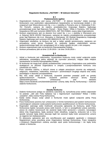 Regulamin Konkursu „FACTORY – W dobrym kierunku” 1. 2. 3. 4. 5. 1. 2. 3. 4. 1. 2. 3. 4. 5. §1 Postanowienia ogólne Organizatorem Konkursu pod nazwą „FACTORY – W dobrym kierunku” (dalej zwanego Konkursem) oraz podmiotem odpowiedzialnym bezpośrednio za koordynację działań z nim związanych jest Wizerunkowo.com Sp. z o.o. z siedzibą w Poznaniu przy ul. Żydowskiej 9 (61761 Poznań), wpisana do rejestru przedsiębiorców Krajowego Rejestru Sądowego prowadzonego przez Sąd Rejonowy Poznań – Nowe Miasto i Wilda w Poznaniu, VIII Wydział Gospodarczy KRS pod numerem 0000475251, NIP 7831704664, zwana dalej Organizatorem. Konkurs organizowany jest na zlecenie Irus Luboń Sp. z o.o. z siedzibą w Warszawie przy ul. Żelaznej 28/30 (00-832 Warszawa), wpisanej do rejestru przedsiębiorców prowadzonego przez Sąd Rejonowy dla m.st. Warszawy w Warszawie, XII Wydział Gospodarczy Krajowego Rejestru Sądowego pod numerem KRS 0000324135, NIP 522-29-15-300. Organizator oświadcza, że Konkurs nie jest w żaden sposób sponsorowany, popierany ani prowadzony przez serwis Facebook (tj. podmioty będące właścicielami serwisu społecznościowego bądź nim zarządzające) ani w żaden sposób nie jest z nim związany. Konkurs organizowany jest na terytorium Rzeczpospolitej Polskiej. Konkurs prowadzony jest od dnia 12.09.2016 r. do dnia 19.09.2016 r. §2 Uczestnictwo w Konkursie Udział w Konkursie jest dobrowolny. Uczestnikiem Konkursu może zostać wyłącznie osoba pełnoletnia, posiadająca pełną zdolność do czynności prawnych, mająca stałe miejsce zamieszkania na terenie Rzeczpospolitej Polskiej. W Konkursie nie mogą brać udziału przedstawiciele i pracownicy Organizatora oraz podmiotów działających na zlecenie Organizatora w związku z przeprowadzeniem Konkursu oraz członkowie ich rodzin. Przez członków rodziny, o których mowa w ustępie powyższym rozumie się wstępnych, zstępnych, rodzeństwo, małżonków, krewnych i powinowatych drugiego stopnia oraz osoby pozostające w stosunku przysposobienia. Aby móc wziąć udział w Konkursie, Uczestnik powinien posiadać profil na portalu społecznościowym Facebook. Uczestnik powinien otworzyć stronę Poznań (@dziendobrypoznan) umieszczoną pod adresem https://www.facebook.com/dziendobrypoznan/ (zwaną dalej Stroną Konkursową) i wykonać Zadanie Konkursowe. §3 Zasady Konkursu Zadanie Konkursowe polega na udzieleniu autorskiej (tj. wymyślonej przez siebie) odpowiedzi na pytanie: „Jaki jest Twój najlepszy łup z tegorocznych wyprzedaży? Wskaż i krótko uzasadnij”, dalej zwanej Pracą Konkursową. Każda osoba chcąca wziąć udział w Konkursie może zgłosić wyłącznie jedną Pracę Konkursową. Prace Konkursowe powinny być umieszczane w formie komentarza pod postem konkursowym (zawierającym wskazane wyżej pytanie konkursowe) opublikowanym na Stronie Konkursowej. Organizator zastrzega sobie możliwość odrzucenia zgłoszenia do Konkursu, jeżeli Praca Konkursowa będzie naruszała prawa osób trzecich, w tym w szczególności prawa autorskie, prawa do znaków towarowych lub zawierać będą treści sprzeczne z prawem, naruszające dobre imię Organizatora, będą zawierać treści obraźliwe, wulgarne, erotyczne lub w inny sposób naruszać będą dobre obyczaje bądź też zawierać będą treści powszechnie uznane za naganne lub niedopuszczalne. Po dokonaniu zgłoszenia jest ono weryfikowane pod względem zgodności z niniejszym Regulaminem przez powołaną przez Organizatora Komisję Konkursową. Prace niezgodne z niniejszym Regulaminem zostaną usunięte spod posta konkursowego i nie będą brały udziału w Konkursie. 6. Zgłoszone Prace Konkursowe są poddane ocenie Komisji Konkursowej, która oceniając kreatywność i oryginalność prac dokona wyboru 50 najlepszych Prac Konkursowych, przyznając jej autorom Nagrody. 7. Prace mogą być zgłaszane w terminie najpóźniej do dnia 19.09.2016 r. do godz. 23:59. 8. Wyniki Konkursu zostaną ogłoszone przez Organizatora na Stronie Konkursowej w dniu 26.09.2016 r. 1. 2. 3. 4. 5. 6. 7. 8. 9. 10. 11. §4 Nagrody Nagrodami (zwane dalej Nagrodami) w Konkursie są: 50 x książka „W dobrym kierunku” (wydawca: FACTORY). Każdy Uczestnik może otrzymać wyłącznie jedną nagrodę. O przyznaniu nagrody Uczestnik zostanie poinformowany przez Organizatora w terminie 7 dni od upływu terminu, o którym mowa w § 3 ust. 7. za pośrednictwem portalu społecznościowego Facebook poprzez umieszczenie jednoznacznego komentarza pod postem konkursowym na Stronie Konkursowej. Po wyłonieniu Laureatów winni się oni skontaktować do dnia 03.10.2016 r. z Administratorami fanpage’a https://www.facebook.com/dziendobrypoznan/ poprzez prywatną wiadomość na Facebooku. Uczestnicy, którzy skontaktują się z Administratorami fanpage’a https://www.facebook.com/dziendobrypoznan/ w sposób określony w ust. 3, zostaną poproszeni o przekazanie w terminie 5 dni od dnia otrzymania prośby swoich danych osobowych (imię, nazwisko, data urodzenia). Miejscem odbioru nagród będzie centrum handlowym FACTORY Poznań (Luboń, ul. Dębiecka 1) w godz. Poniedziałku do piątku : 09.00-17:30, w Biurze Centrum FACTORY Poznań Uczestnik będzie uprawniony do odbioru nagrody osobiście w terminie 14 dni od dnia przekazania Organizatorowi danych wskazanych w § 4 ust. 4., (do 17.10.2016) po okazaniu w miejscu odbioru nagrody dokumentu potwierdzającego tożsamość Uczestnika, wypełnieniu formularza potwierdzającego wyrażenie zgody na przetwarzanie danych osobowych Zwycięzcy Konkursu, zawierającego dane osobowe Zwycięzcy oraz złożeniu oświadczenia potwierdzającego że jest autorem Pracy Konkursowej. Wzory dokumentów dostępne będą w miejscu odbioru nagród. Jeżeli nagradzany Uczestnik nie spełnia warunków, o których mowa w § 4 ust. 4 oraz ust. 5, nagroda nie jest wydawana i pozostaje własnością Organizatora. W przypadku, w którym Uczestnik okaże się o