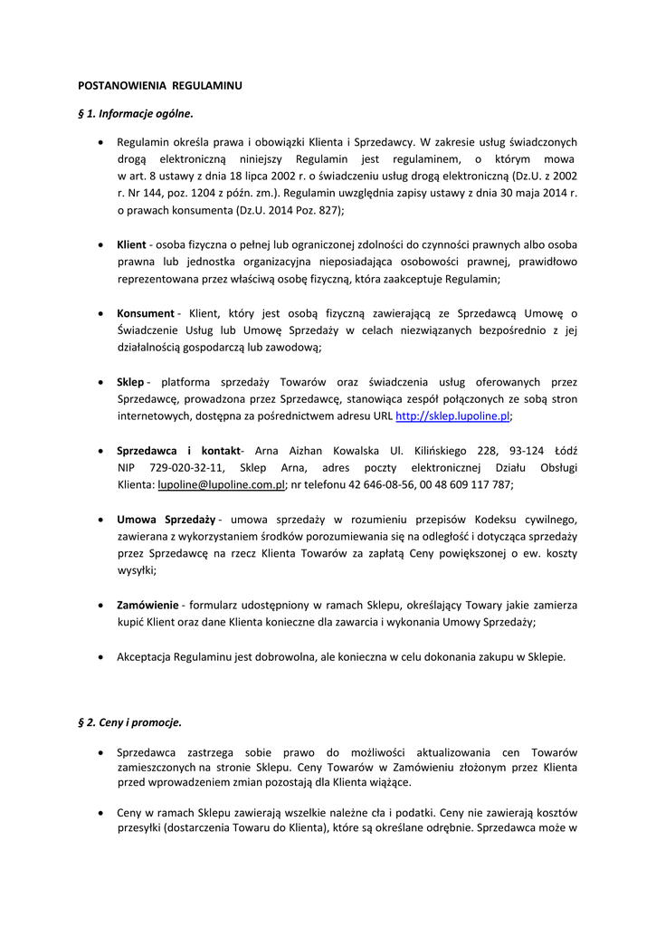 POSTANOWIENIA REGULAMINU § 1. Informacje ogólne. Regulamin określa prawa i obowiązki Klienta i Sprzedawcy. W zakresie usług świadczonych drogą elektroniczną niniejszy Regulamin jest regulaminem, o którym mowa w art. 8 ustawy z dnia 18 lipca 2002 r. o świadczeniu usług drogą elektroniczną (Dz.U. z 2002 r. Nr 144, poz. 1204 z późn. zm.). Regulamin uwzględnia zapisy ustawy z dnia 30 maja 2014 r. o prawach konsumenta (Dz.U. 2014 Poz. 827); Klient - osoba fizyczna o pełnej lub ograniczonej zdolności do czynności prawnych albo osoba prawna lub jednostka organizacyjna nieposiadająca osobowości prawnej, prawidłowo reprezentowana przez właściwą osobę fizyczną, która zaakceptuje Regulamin; Konsument - Klient, który jest osobą fizyczną zawierającą ze Sprzedawcą Umowę o Świadczenie Usług lub Umowę Sprzedaży w celach niezwiązanych bezpośrednio z jej działalnością gospodarczą lub zawodową; Sklep - platforma sprzedaży Towarów oraz świadczenia usług oferowanych przez Sprzedawcę, prowadzona przez Sprzedawcę, stanowiąca zespół połączonych ze sobą stron internetowych, dostępna za pośrednictwem adresu URL http://sklep.lupoline.pl; Sprzedawca i kontakt- Arna Aizhan Kowalska Ul. Kilińskiego 228, 93-124 Łódź NIP 729-020-32-11, Sklep Arna, adres poczty elektronicznej Działu Obsługi Klienta: [email protected]; nr telefonu 42 646-08-56, 00 48 609 117 787; Umowa Sprzedaży - umowa sprzedaży w rozumieniu przepisów Kodeksu cywilnego, zawierana z wykorzystaniem środków porozumiewania się na odległość i dotycząca sprzedaży przez Sprzedawcę na rzecz Klienta Towarów za zapłatą Ceny powiększonej o ew. koszty wysyłki; Zamówienie - formularz udostępniony w ramach Sklepu, określający Towary jakie zamierza kupić Klient oraz dane Klienta konieczne dla zawarcia i wykonania Umowy Sprzedaży; Akceptacja Regulaminu jest dobrowolna, ale konieczna w celu dokonania zakupu w Sklepie. § 2. Ceny i promocje. Sprzedawca zastrzega sobie prawo do możliwości aktualizowania cen Towarów zamieszczonych na stronie Sklepu. Ceny Towarów w Zamówieniu złożonym przez Klienta przed wprowadzeniem zmian pozostają dla Klienta wiążące. Ceny w ramach Sklepu zawierają wszelkie należne cła i podatki. Ceny nie zawierają kosztów przesyłki (dostarczenia Towaru do Klienta), które są określane odrębnie. Sprzedawca może w szczególności w wybranym przez siebie okresie, w warunkach Promocji, określić próg minimalnej wartości Zamówienia, dla której przesyłka (dostawa) Towaru jest darmowa lub cena dostawy jest okresowo obniżona. Całkowita suma do zapłaty (obejmująca Cenę oraz w zależności od warunków Promocji także koszty dostawy) przez Klienta może zostać pomniejszona o określony rabat procentowy lub kwotowy poprzez wykorzystanie Kodu rabatowego. Sprzedawca określi zasady przyznawania i wykorzystania Kodów rabatowych w ramach odrębnych warunków Promocji. Promocje obowiązujące w Sklepie nie podlegają łączeniu, o ile postanowienia Promocji wyraźnie nie stanowią inaczej. Promocje mogą obejmować ograniczoną liczbę Towarów. § 3 Formy płatności. Dokonując zakupów w sklepie internetowym sklep.lupoline.pl płatności można dokonać: - przelewem na konto , za pomocą karty płatniczej , przy wykorzystaniu systemu płatności elektronicznych akceptowanego w danym momencie przez Sprzedawcę i prezentowanego na stronie Sklepu -koszty przesyłek wynoszą: Poczta Polska - 11 PLN , UPS - 13,99 PLN, In Post – 8 zł - przy odbiorze przesyłki (płatność za pobraniem) -koszty przesyłek wynoszą: Poczta Polska - 13 PLN, UPS - 19,99 PLN, - gotówką - przy odbiorze osobistym Aby skorzystać z płatności przelewem w tytule przelewu należy wpisać numer zamówienia. Nr konta dla klientów DETALICZNYCH 11 1050 1461 1000 0023 0892 1283 Arna Aizhan Kowalska ul. Kilińskiego 228 93-124 Łódź Płatność kartą kartą kredytową (karty typu Visa i Mastercard) realizowany za pośrednictwem firmy eCard. Autoryzacja odbywa się w trybie on-line. W momencie złożenia zamówienia system przekierowuje na strony firmy eCard, gdzie należy wpisać dane karty. Są one wykorzystywane jednorazowo, nie są przechowywane ani na serwerze firmy eCard ani w naszym sklepie. Uwaga: Po pomyślnej autoryzacji należy wrócić na stronę sklepu. W przeciwnym razie nie poznamy wyniku transakcji i nie będziemy mogli zrealizować Twojego zamówienia. Nie jest możliwe łączenie różnych metod płatności przy opłaceniu jednego Zamówienia. Termin płatności za zamówione Towary, wynosi 7 dni od dnia zawarcia Umowy Sprzedaży. Nieuiszczenie płatności, jest warunkiem rozwiązującym Umowę Sprzedaży. Jeżeli Klient dokonał płatności kartą płatniczą, przy wykorzystaniu systemu płatności elektronicznych lub przelewem, zwrot należności (na przykład z tytułu anulowania złożonego Zamówienia lub odstąpienia od umowy) następuje na kartę płatniczą lub na rachunek bankowy, z którego nastąpiła pierwotna płatność. Jeżeli Klient dokonał płatności przy odbiorze Zamówienia (płatność za pobraniem), Sprzedawca za pośrednictwem formularza zwrotu poprosi Klienta o podanie numeru rachunku bankowego w celu dokonania zwrotu należności, jeżeli Klient wyrazi zgodę na ten sposób zwrotu płatności. Klient może również wyrazić zgodę na dokonanie zwrotu przy użyciu innych środków płatniczych, niż użytych w początkowej transakcji, które nie będzie wiązało się dla niego z poniesieniem kosztów. § 4 Dostawa. Termin realizacji zamówienia wynosi od 1 do 7 dni roboczych. Jeśli zdarzy się, że któryś z artykułów będzie chwilowo niedostępny, Sprzedawca poinformuje o tym fakcie Klienta mailowo lub telefonicznie. W trakcie składania zamówienia Klient dokonuje wyboru formy doręczenia przesyłki spośród wysyłek za pośrednictwem: -Poczty Polskiej (kurier 48 lub odbiór w punkcie) - kurier UPS - paczkomaty InPost - o