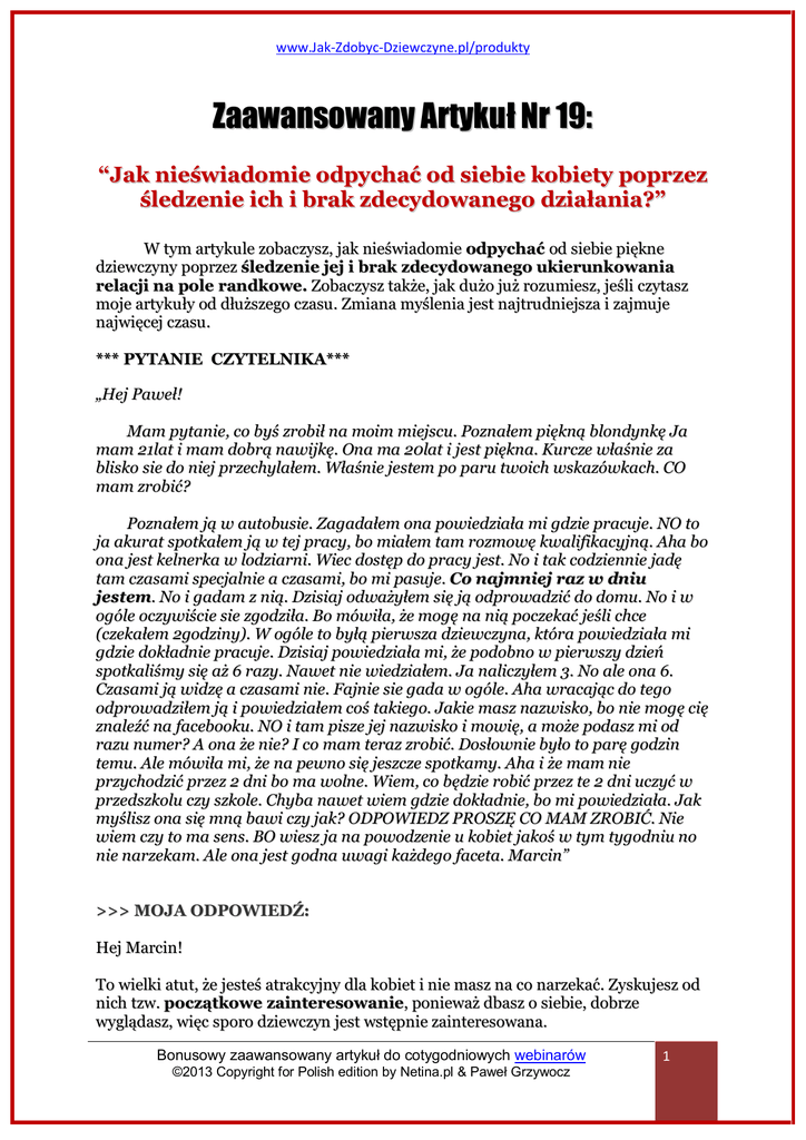 www.Jak-Zdobyc-Dziewczyne.pl/produkty Zaawansowany Artykuł Nr 19: “Jak nieświadomie odpychać od siebie kobiety poprzez śledzenie ich i brak zdecydowanego działania?” W tym artykule zobaczysz, jak nieświadomie odpychać od siebie piękne dziewczyny poprzez śledzenie jej i brak zdecydowanego ukierunkowania relacji na pole randkowe. Zobaczysz także, jak dużo już rozumiesz, jeśli czytasz moje artykuły od dłuższego czasu. Zmiana myślenia jest najtrudniejsza i zajmuje najwięcej czasu. *** PYTANIE CZYTELNIKA*** „Hej Paweł! Mam pytanie, co byś zrobił na moim miejscu. Poznałem piękną blondynkę Ja mam 21lat i mam dobrą nawijkę. Ona ma 20lat i jest piękna. Kurcze właśnie za blisko sie do niej przechylałem. Właśnie jestem po paru twoich wskazówkach. CO mam zrobić? Poznałem ją w autobusie. Zagadałem ona powiedziała mi gdzie pracuje. NO to ja akurat spotkałem ją w tej pracy, bo miałem tam rozmowę kwalifikacyjną. Aha bo ona jest kelnerka w lodziarni. Wiec dostęp do pracy jest. No i tak codziennie jadę tam czasami specjalnie a czasami, bo mi pasuje. Co najmniej raz w dniu jestem. No i gadam z nią. Dzisiaj odważyłem się ją odprowadzić do domu. No i w ogóle oczywiście sie zgodziła. Bo mówiła, że mogę na nią poczekać jeśli chce (czekałem 2godziny). W ogóle to byłą pierwsza dziewczyna, która powiedziała mi gdzie dokładnie pracuje. Dzisiaj powiedziała mi, że podobno w pierwszy dzień spotkaliśmy się aż 6 razy. Nawet nie wiedziałem. Ja naliczyłem 3. No ale ona 6. Czasami ją widzę a czasami nie. Fajnie sie gada w ogóle. Aha wracając do tego odprowadziłem ją i powiedziałem coś takiego. Jakie masz nazwisko, bo nie mogę cię znaleźć na facebooku. NO i tam pisze jej nazwisko i mowię, a może podasz mi od razu numer? A ona że nie? I co mam teraz zrobić. Dosłownie było to parę godzin temu. Ale mówiła mi, że na pewno się jeszcze spotkamy. Aha i że mam nie przychodzić przez 2 dni bo ma wolne. Wiem, co będzie robić przez te 2 dni uczyć w przedszkolu czy szkole. Chyba nawet wiem gdzie dokładnie, bo mi powiedziała. Jak myślisz ona się mną bawi czy jak? ODPOWIEDZ PROSZĘ CO MAM ZROBIĆ. Nie wiem czy to ma sens. BO wiesz ja na powodzenie u kobiet jakoś w tym tygodniu no nie narzekam. Ale ona jest godna uwagi każdego faceta. Marcin” >>> MOJA ODPOWIEDŹ: Hej Marcin! To wielki atut, że jesteś atrakcyjny dla kobiet i nie masz na co narzekać. Zyskujesz od nich tzw. początkowe zainteresowanie, ponieważ dbasz o siebie, dobrze wyglądasz, więc sporo dziewczyn jest wstępnie zainteresowana. Bonusowy zaawansowany artykuł do cotygodniowych webinarów ©2013 Copyright for Polish edition by Netina.pl & Paweł Grzywocz 1 www.Jak-Zdobyc-Dziewczyne.pl/produkty Pytanie, czy potrafisz to zainteresowanie utrzymać i zwiększyć do takiego poziomu, w którym dziewczyna goni za Tobą, tęskni, pragnie i chce Cię odkrywać, poznawać i spędzać z Tobą czas. Mógłbyś dodać do swojej osobowości i sposobów zachowania takie elementy, które sprawią, że będziesz dla kobiet tajemnicą i wyzwaniem, przez co będziesz dla kobiet 10 razy bardziej atrakcyjny. Warunek jest tylko jeden. Musisz odsunąć swoje męskie ego na bok oraz poskromić swoje przekonanie o swojej świetności i spojrzeć na to wszystko z boku. Następnie zastanowić się: "Czy mogę robić coś jeszcze lepiej? Czy jest to możliwe, że czegoś nie wiem? Czy może robię coś źle, skoro jedna, druga i trzecia dziewczyna mnie olewa i nie chce ze się mną więcej spotkać?" Jeśli jesteś w stanie się czegoś nauczyć i to zaaplikować do swojego życia, to przy takich warunkach i początkowm zainteresowaniu pięknych kobiet możesz być dla nich naprawdę rzadko spotykanym facetem, którego one pragną. Dlaczego jest to taka waŜne? Ponieważ z pięknymi kobietami trzeba postępować inaczej niż z tymi mniej popularnymi i mniej podrywanymi przez wielu facetów. Trzeba się odróżnić, być dla nich wyzwaniem i pozwolić im się zastanawiać, czy naprawdę Ci się podobają. Działa to dlatego, ponieważ każdy facet od razu pokazuje im, że jest na nie napalony i bardzo mu się podobają. One to widzą na każdym kroku od około 15 roku życia i są tym znudzone. Spójrzmy teraz, jakim Ty jesteś wyzwaniem dla tej pięknej blondynki. Po pierwsze przychodzisz i widujesz ją codziennie w jej pracy (śledzenie) oraz czekałeś na nią przez 2 godziny jak jakiś sęp, który czeka na swoją ofiarę. „Głodny pies lub wilk nigdy nie dostaje jeść” – jest takie powiedzenie z j. ang: „A hungry dog never gets fed”. Pokazujesz swoim zachowaniem totalną desperację i nawet o tym nie wiesz. To jest najbardziej bolesne i mam nadzieję, że z pomocą moich materiałów szybko się tego pozbędziesz i przestaniesz nieświadomie odpychać piękne kobiety. Przychodząc do niej codziennie pokazałeś jej, że nie masz żadnych innych opcji ani ciekawego życia, bo zamiast poznawać też inne dziewczyny, to Ty codziennie jeździsz do tej jednej w nadziei, że ją spotkasz. To, że ona powiedziała Ci, gdzie pracuje kompletnie nic nie znaczy, bo liczy się to, czy ona poda Ci swój numer telefonu, czy przyjdzie na spotkanie na osobności oraz czy po kilku spotkaniach pozwoli się pocałować w usta. Bonusowy zaawansowany artykuł do cotygodniowych webinarów ©2013 Copyright for Polish edition by Netina.pl & Paweł Grzywocz 2 www.Jak-Zdobyc-Dziewczyne.pl/produkty To są pierwsze trzy kroki, które ujawniają prawdziwe zainteresowanie dziewczyny, a w Twojej sytuacji ona powiedziała Ci, gdzie pracuje, bo może chciała zrobić sobie z Ciebie kolejnego „fana”, który chodzi za nią i ją wielbi. Ładne dziewczyny lubią mieć takich orbiterów, ale to nie znaczy, że czują do nich jakikolwiek pociąg. One lubią uwagę i potwierdzanie swojej atrakcyjności poprzez takich adoratorów, ale nie jest to typ faceta, którego one pragnę i nigdy nie będą o 