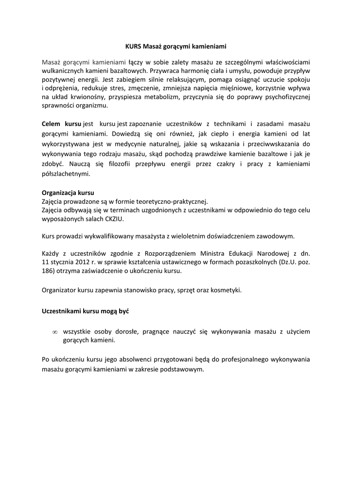 KURS Masaż gorącymi kamieniami Masaż gorącymi kamieniami łączy w sobie zalety masażu ze szczególnymi właściwościami wulkanicznych kamieni bazaltowych. Przywraca harmonię ciała i umysłu, powoduje przypływ pozytywnej energii. Jest zabiegiem silnie relaksującym, pomaga osiągnąć uczucie spokoju i odprężenia, redukuje stres, zmęczenie, zmniejsza napięcia mięśniowe, korzystnie wpływa na układ krwionośny, przyspiesza metabolizm, przyczynia się do poprawy psychofizycznej sprawności organizmu. Celem kursu jest kursu jest zapoznanie uczestników z technikami i zasadami masażu gorącymi kamieniami. Dowiedzą się oni również, jak ciepło i energia kamieni od lat wykorzystywana jest w medycynie naturalnej, jakie są wskazania i przeciwwskazania do wykonywania tego rodzaju masażu, skąd pochodzą prawdziwe kamienie bazaltowe i jak je zdobyć. Nauczą się filozofii przepływu energii przez czakry i pracy z kamieniami półszlachetnymi. Organizacja kursu Zajęcia prowadzone są w formie teoretyczno-praktycznej. Zajęcia odbywają się w terminach uzgodnionych z uczestnikami w odpowiednio do tego celu wyposażonych salach CKZIU. Kurs prowadzi wykwalifikowany masażysta z wieloletnim doświadczeniem zawodowym. Każdy z uczestników zgodnie z Rozporządzeniem Ministra Edukacji Narodowej z dn. 11 stycznia 2012 r. w sprawie kształcenia ustawicznego w formach pozaszkolnych (Dz.U. poz. 186) otrzyma zaświadczenie o ukończeniu kursu. Organizator kursu zapewnia stanowisko pracy, sprzęt oraz kosmetyki. Uczestnikami kursu mogą być • wszystkie osoby dorosłe, pragnące nauczyć się wykonywania masażu z użyciem gorących kamieni. Po ukończeniu kursu jego absolwenci przygotowani będą do profesjonalnego wykonywania masażu gorącymi kamieniami w zakresie podstawowym.