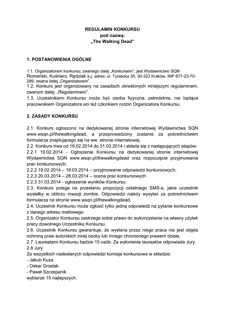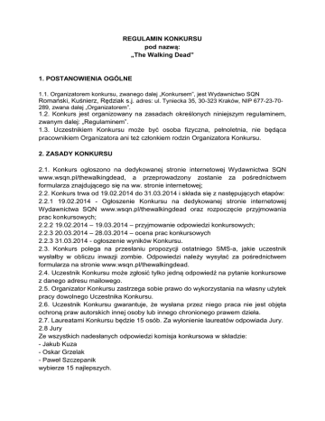 REGULAMIN KONKURSU pod nazwą: „The Walking Dead” 1. POSTANOWIENIA OGÓLNE 1.1. Organizatorem konkursu, zwanego dalej „Konkursem”, jest Wydawnictwo SQN Romański, Kuśnierz, Rędziak s.j. adres: ul. Tyniecka 35, 30-323 Kraków, NIP 677-23-70289, zwana dalej „Organizatorem”. 1.2. Konkurs jest organizowany na zasadach określonych niniejszym regulaminem, zwanym dalej: „Regulaminem”. 1.3. Uczestnikiem Konkursu może być osoba fizyczna, pełnoletnia, nie będąca pracownikiem Organizatora ani też członkiem rodzin Organizatora Konkursu. 2. ZASADY KONKURSU 2.1. Konkurs ogłoszono na dedykowanej stronie internetowej Wydawnictwa SQN www.wsqn.pl/thewalkingdead, a przeprowadzony zostanie za pośrednictwem formularza znajdującego się na ww. stronie internetowej; 2.2. Konkurs trwa od 19.02.2014 do 31.03.2014 i składa się z następujących etapów: 2.2.1 19.02.2014 - Ogłoszenie Konkursu na dedykowanej stronie internetowej Wydawnictwa SQN www.wsqn.pl/thewalkingdead oraz rozpoczęcie przyjmowania prac konkursowych; 2.2.2 19.02.2014 – 19.03.2014 – przyjmowanie odpowiedzi konkursowych; 2.2.3 20.03.2014 – 28.03.2014 – ocena prac konkursowych 2.2.3 31.03.2014 - ogłoszenie wyników Konkursu. 2.3. Konkurs polega na przesłaniu propozycji ostatniego SMS-a, jakie uczestnik wysłałby w obliczu inwazji zombie. Odpowiedzi należy wysyłać za pośrednictwem formularza na stronie www.wsqn.pl/thewalkingdead. 2.4. Uczestnik Konkursu może zgłosić tylko jedną odpowiedź na pytanie konkursowe z danego adresu mailowego. 2.5. Organizator Konkursu zastrzega sobie prawo do wykorzystania na własny użytek pracy dowolnego Uczestnika Konkursu. 2.6. Uczestnik Konkursu gwarantuje, że wysłana przez niego praca nie jest objęta ochroną praw autorskich innej osoby lub innego chronionego prawem dzieła. 2.7. Laureatami Konkursu będzie 15 osób. Za wyłonienie laureatów odpowiada Jury. 2.8 Jury Ze wszystkich nadesłanych odpowiedzi komisja konkursowa w składzie: - Jakub Kuza - Oskar Grzelak - Paweł Szczepanik wybierze 15 najlepszych. 2.9. Organizator Konkursu zastrzega sobie prawo nie dopuszczenia do Konkursu bądź wykluczenia z Konkursu na każdym jego etapie prac, które będą sprzeczne z prawem lub zasadami współżycia społecznego, niniejszym Regulaminem lub narusza słuszne prawa osób trzecich. 2.10. Przystąpienie do Konkursu upoważnia Organizatora do umieszczenia prac na stronach Organizatora oraz na fanpage’u na stronie www.facebook.pl bez podawania danych osobowych uczestników Konkursu. 2.11. Uczestnicy podający nieprawdziwe bądź nieprawidłowe informacje o sobie nie otrzymają nagrody. 3. PRZYZNANIE NAGRÓD 3.1. Laureaci Konkursu, którzy wyłonieni zostaną przez Jury otrzymają następujące pakiety nagród: - figurka Michonne + koszulka The Walking Dead + Narodziny Gubernatora (wyd. II) + kod rabatowy do wykorzystania w platformie woblink.com - figurka Glenn + koszulka The Walking Dead + Narodziny Gubernatora (wyd. II) + kod rabatowy do wykorzystania w platformie woblink.com - figurka Zombie + koszulka The Walking Dead + Narodziny Gubernatora (wyd. II) + kod rabatowy do wykorzystania w platformie woblink.com 3.2. Laureaci Konkursu zostaną powiadomieni o wygranej na stronie www.wsqn.pl/thewalkingdead oraz drogą mailową. 3.3. Po potwierdzeniu chęci przyjęcia nagrody, nagroda zostanie przesłana pocztą do zwycięzcy na adres korespondencyjny podany podczas potwierdzenia. Wysyłka nagród obejmuje wyłącznie teren Rzeczpospolitej Polskiej. 3.4. W przypadku niedostarczenia danych adresowych przez laureata w terminie 14 dni od dnia poinformowania o wygranej, prawo do nagrody wygasa. 3.5. Nagrody nie podlegają zamianie na ich równowartość pieniężną. 3.6. Prawo do nagrody nie może być scedowane na inną osobę. 3.7. Wydanie nagród nastąpi zgodnie z obowiązującymi przepisami podatkowymi. W przypadkach określonych w art. 30 ust. 1 pkt. 2 ustawy z dnia 26 lipca 1991 r. o podatku dochodowym od osób fizycznych (Dz. U. z 2000 r., Nr 14 poz. 176 z późn. zm.) Organizator przed wydaniem nagrody, pobierze zgodnie z ustawą o podatku dochodowym od osób fizycznych 10% zryczałtowany podatek od wartości wydanych nagród. 3.8. Uczestnikowi konkursu przysługuje tylko jedna nagroda. 3.9. Jakiekolwiek roszczenia uczestników Konkursu z tytułu nieotrzymania nagród, które nie zostały im przyznane, są wyłączone. 4. POSTANOWIENIA KOŃCOWE 4.1. Nad prawidłowością przebiegu Konkursu czuwać będzie Komisja Konkursowa, do której zadań należeć będzie nadzór nad przestrzeganiem Regulaminu. Od decyzji Komisji nie przysługuje odwołanie. 4.2. Regulamin jest jedynym dokumentem określającym zasady Konkursu. 4.3. Reklamacje dotyczące przebiegu i organizacji Konkursu mogą być składane przez uczestników Konkursu w terminie 30 dni od dnia ogłoszenia finalistów – zdobywców nagród głównych. Reklamacje rozpatrują Organizatorzy w terminie 14 dni od dnia otrzymania reklamacji. O rozpatrzeniu reklamacji uczestnik ją składający zostaje zawiadomiony na adres poczty elektronicznej podany w zgłoszeniu. Warunkiem dochodzenia roszczeń na drodze sądowej jest wyczerpanie drogi reklamacji. 4.4. Wszelkie roszczenia rozpoznaje sąd powszechny właściwy według obowiązujących przepisów. 4.5. Wszelkie doręczenia dla Organizatorów powinny być dokonywane pod adres: ul. Tyniecka 35/2, 30-323 Kraków. 4.6. Laureaci Konkursu akceptują nieodpłatne i bezterminowe przeniesienie na rzecz Organizatora Konkursu majątkowych i zależnych praw autorskich do nadesłanych prac, które zwyciężą w konkursie – w rozumieniu ustawy z dnia 4 lutego 1994r. o prawie autorskim i prawach pokrewnych (Dz.U. z 2006 r. nr 90 poz. 631 z późniejszymi zmianami) – na wszystkich polach eksploatacji, tj. a. utrwalanie, kopiowanie, wprowadzenie do pamięci komputerów i serwerów sieci komputerowych, Internetu, b. wystawianie lub publiczną prezentację (na ekranie), w tym po