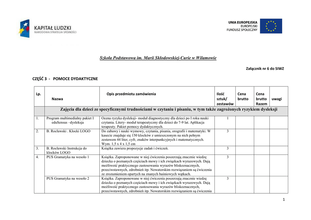 Szkoła Podstawowa im. Marii Skłodowskiej-Curie w Wilamowie Załącznik nr 6 do SIWZ CZĘŚĆ 3 - POMOCE DYDAKTYCZNE Lp. Opis przedmiotu zamówienia Nazwa Ilość Cena sztuk/ brutto zestawów Cena brutto Razem uwagi Zajęcia dla dzieci ze specyficznymi trudnościami w czytaniu i pisaniu, w tym także zagrożonych ryzykiem dysleksji 1. Program multimedialny pakiet I eduSensus –dysleksja 2. B. Rocławski . Klocki LOGO 3. B. Rocławski Instrukcja do klocków LOGO PUS Gramatyka na wesoło 1 4. PUS Gramatyka na wesoło 2 Ocena ryzyka dysleksji- moduł diagnostyczny dla dzieci po I roku nauki czytania. Litery- moduł terapeutyczny dla dzieci do 7-9 lat. Aplikacja terapeuty. Pakiet pomocy dydaktycznych. Do zabawy i nauki wymowy, czytania, pisania, orografii i matematyki. W kasecie znajduje się 150 klocków z umieszczonym na nich pełnym zestawem 44 liter, cyfr, znaków interpunkcyjnych i matematycznych. Wym. 1,5 x 4 x 1,5 cm Książka zawiera propozycje zadań i ćwiczeń. 1 Książka. Zaproponowane w niej ćwiczenia poszerzają znacznie wiedzę dziecka o poznanych częściach mowy i ich związkach wyrazowych. Dają możliwość praktycznego zastosowania wyrazów bliskoznacznych, przeciwstawnych, zdrobnień itp. Nowatorskim rozwiązaniem są ćwiczenia ze zrozumieniem opartych na znanych baśniowych wątkach. Książka. Zaproponowane w niej ćwiczenia poszerzają znacznie wiedzę dziecka o poznanych częściach mowy i ich związkach wyrazowych. Dają możliwość praktycznego zastosowania wyrazów bliskoznacznych, przeciwstawnych, zdrobnień itp. Nowatorskim rozwiązaniem są ćwiczenia 3 3 3 3 1 5. PUS Ortografia ch-h PUS Ortografia ó-u PUS Ortografia Rz-ż PUS Ortografia zmiękczenia 6. 7. 8. M. Bogdanowicz Od piosenki do literki M. Bogdanowicz Metoda Dobrego Startu- Od wierszyka do literki zeszyt 1 M. Bogdanowicz Metoda Dobrego Startu- Od wierszyka do literki zeszyt 2 PUS Zgadywanki - Wiosna PUS Zgadywanki - Lato PUS Zgadywanki – Jesień PUS Zgadywanki - Zima 9. Jagoda Cieszyńska- seria logopedyczna- Kocham czytać. Pakiet 18 zeszytów 10. E. Wujczyk Ciche czytanie ze zrozumieniem kl. II E. Wujczyk Ciche czytanie ze zrozumieniem kl. III Harmonia 4- elementowe 11. ze zrozumieniem opartych na znanych baśniowych wątkach. Książka z serii pomagającej dziecku zgłębić zasady ortografii języka polskiego, przybliża podstawowe reguły orograficzne Książka z serii pomagającej dziecku zgłębić zasady ortografii języka polskiego, przybliża podstawowe reguły orograficzne Książka z serii pomagającej dziecku zgłębić zasady ortografii języka polskiego, przybliża podstawowe reguły orograficzne Książka zawiera ćwiczenie pogłębiające i utrwalające znajomość pisowni wyrazów ze spółgłoskami miękkimi. Książka- w komplecie podręcznik format A4,116 str., płyta CD teczka z ćwiczeniami. Zeszyt 1 zawiera materiał potrzebny do wprowadzenia 24 liter małych i wielkich , format A4 60 str. 3 3 3 3 3 3 Zeszyt 2 zawiera materiał potrzebny do wprowadzenia 24 liter małych i wielkich , format A4 56 str. 3 Książka. Zawarte w niej treści realizują wiele istotnych w nauczaniu początkowym celów dydaktycznych: czytanie ze zrozumieniem, poznawanie zjawisk przyrodniczych, otocznia bliskiego dziecku itp. Książka. Zawarte w niej treści realizują wiele istotnych w nauczaniu początkowym celów dydaktycznych: czytanie ze zrozumieniem, poznawanie zjawisk przyrodniczych, otocznia bliskiego dziecku itp. Książka. Zawarte w niej treści realizują wiele istotnych w nauczaniu początkowym celów dydaktycznych: czytanie ze zrozumieniem, poznawanie zjawisk przyrodniczych, otocznia bliskiego dziecku itp. Książka. Zawarte w niej treści realizują wiele istotnych w nauczaniu początkowym celów dydaktycznych: czytanie ze zrozumieniem, poznawanie zjawisk przyrodniczych, otocznia bliskiego dziecku itp. Seria logopedyczna przeznaczona do wczesnej nauki czytania oraz dla dzieci zagrożonych dysleksją, z wadami wymowy. Zawiera: poradnik dla nauczycieli i dzieci, kolorowankę, pakiet 18 zeszytów Książka- Zbiór ćwiczeń w formie 52 kart sprawdzających rozumienie czytanego tekstu. Format A4, 52 str. Książka- Zbiór ćwiczeń w formie 16 kart sprawdzających rozumienie czytanego tekstu. Format A4, 50 str. Teczka z 21 historyjkami obrazkowymi i kieszonkami do ich układana, 3 3 3 3 1 3 3 2 2 12. 13. 14. 15. 16. 17. 18. 19. 20. 21. historyjki obrazkowe Harmonia 6- elementowe historyjki obrazkowe Harmonia 8- elementowe historyjki obrazkowe Zestaw- Przeplatanka ze wzorami- oferta NOVUM Literki- zestaw do przewlekania – oferta NOVUM Zestaw edukacyjny- Wesołe abecadło Duży ruchomy alfabet1 Gra edukacyjna- EduSensus. Czytam i piszę( 6-10 lat)interaktywna nauka języka polskiego. 8 kształtów- przeplatanki Adamigo- Gra puzzlowaPoznaję literki Mozaika z młotkiem- oferta NOWUM PUS Łatwe ćwiczenia do nauki czytania 1,2,3,4 PUS Przymiotnik ,Rzeczownik cz.1, Rzeczownik cz.2 22. Pakiet multimedialny EduSensus –Logopedia – pakiet podstawowy 23. Gra dydaktyczna- Sylaby w dominie Gra edukacyjna- Trudne słowa 1 24. Gra edukacyjna- Trudne słowa 2 format A4, 21 str. Teczka z 21 historyjkami obrazkowymi i kieszonkami do ich układana, format A4, 21 str. Teczka z 21 historyjkami obrazkowymi i kieszonkami do ich układana, format A4, 21 str. Przewlekanka doskonali sprawność manualną, koordynację wzrokoworuchową. W zestawie: podstawka- 20,5x23,50 cm, szydełko, 4 kolorowe sznureczki Drewniane pudełko z literkami sznurkami. Wym. Pudełka 32,5x29x2,5 cm 2 2 3 3 Zestaw edukacyjny zawiera: 70 kwadratowych, dwustronnych kart o wymiarach 4,5x4,5cm, 70 prostokątnych kart o wymiarach7,5x2 cm, 4 notesiki Drewniane pudełko z przegródkami pełne liter. 39x63 cm Gra edukacyjna do nauki liter i ortografii opartej na zabawie, przyswajania nowych umiejętności. Idealny program do pracy indywidualnej 3 Zestaw- 8 dziurkowanych kształtów zwierząt, pojazdów do przewlekania wraz z 8 sznurecz