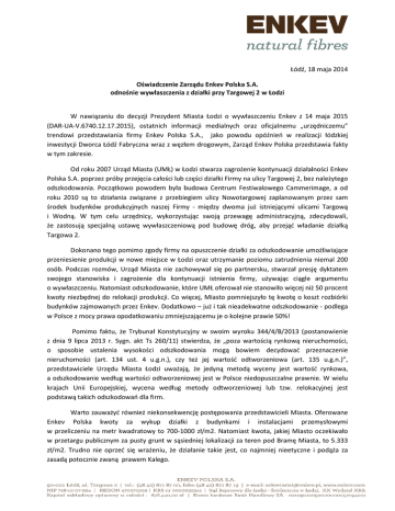 Łódź, 18 maja 2014 Oświadczenie Zarządu Enkev Polska S.A. odnośnie wywłaszczenia z działki przy Targowej 2 w Łodzi W nawiązaniu do decyzji Prezydent Miasta Łodzi o wywłaszczeniu Enkev z 14 maja 2015 (DAR-UA-V.6740.12.17.2015), ostatnich informacji medialnych oraz oficjalnemu „urzędniczemu” trendowi przedstawiania firmy Enkev Polska S.A., jako powodu opóźnień w realizacji łódzkiej inwestycji Dworca Łódź Fabryczna wraz z węzłem drogowym, Zarząd Enkev Polska przedstawia fakty w tym zakresie. Od roku 2007 Urząd Miasta (UMŁ) w Łodzi stwarza zagrożenie kontynuacji działalności Enkev Polska S.A. poprzez próby przejęcia całości lub części działki Firmy na ulicy Targowej 2, bez należytego odszkodowania. Początkowo powodem była budowa Centrum Festiwalowego Cammerimage, a od roku 2010 są to działania związane z przebiegiem ulicy Nowotargowej zaplanowanym przez sam środek budynków produkcyjnych naszej Firmy - między dwoma już istniejącymi ulicami Targową i Wodną. W tym celu urzędnicy, wykorzystując swoją przewagę administracyjną, zdecydowali, że zastosują specjalną ustawę wywłaszczeniową pod budowę dróg, aby przejąć władanie działką Targowa 2. Dokonano tego pomimo zgody firmy na opuszczenie działki za odszkodowanie umożliwiające przeniesienie produkcji w nowe miejsce w Łodzi oraz utrzymanie poziomu zatrudnienia niemal 200 osób. Podczas rozmów, Urząd Miasta nie zachowywał się po partnersku, stwarzał presję dyktatem swojego stanowiska i zagrożenie dla kontynuacji istnienia firmy, używając ciągle argumentu o wywłaszczeniu. Natomiast odszkodowanie, które UMŁ oferował nie stanowiło więcej niż 50 procent kwoty niezbędnej do relokacji produkcji. Co więcej, Miasto pomniejszyło tę kwotę o koszt rozbiórki budynków zajmowanych przez Enkev. Dodatkowo – już i tak nieadekwatne odszkodowanie - podlega w Polsce z mocy prawa opodatkowaniu zmniejszającemu je o kolejne prawie 50%! Pomimo faktu, że Trybunał Konstytucyjny w swoim wyroku 344/4/B/2013 (postanowienie z dnia 9 lipca 2013 r. Sygn. akt Ts 260/11) stwierdza, że „poza wartością rynkową nieruchomości, o sposobie ustalenia wysokości odszkodowania mogą bowiem decydować przeznaczenie nieruchomości (art. 134 ust. 4 u.g.n.), czy też jej wartość odtworzeniowa (art. 135 u.g.n.)”, przedstawiciele Urzędu Miasta Łodzi uważają, że jedyną metodą wyceny jest wartość rynkowa, a odszkodowanie według wartości odtworzeniowej jest w Polsce niedopuszczalne prawnie. W wielu krajach Unii Europejskiej, wycena według metody odtworzeniowej lub tzw. relokacyjnej jest podstawą takich odszkodowań dla firm. Warto zauważyć również niekonsekwencję postępowania przedstawicieli Miasta. Oferowane Enkev Polska kwoty za wykup działki z budynkami i instalacjami przemysłowymi w przeliczeniu na metr kwadratowy to 700-1000 zł/m2. Natomiast kwota, jakiej Miasto oczekiwało w przetargu publicznym za pusty grunt w sąsiedniej lokalizacji za teren pod Bramę Miasta, to 5.333 zł/m2. Trudno nie oprzeć się wrażeniu, że działanie takie jest, co najmniej nieetyczne i podąża za zasadą potocznie zwaną prawem Kalego. Jest ogólnie uznanym faktem, że stworzenie jednego miejsca pracy w Polsce w przemyśle wymaga inwestycji rzędu od 700 tys. do 2 mln zł. Przenoszenie produkcji i zatrudnienia dla 200 osób w nowe miejsce prawie nie różni się od utworzenia nowego zakładu. Z takim wyzwaniem jest skonfrontowana nasza Spółka i w żaden sposób nie da się tego odnieść do oferowanego odszkodowania za grunt pomniejszonym o koszty rozbiórki budynków. Urzędnicze rozumienie, że do przeniesienia firmy wystarczy nieruchomość zastępcza nie wytrzymuje tej próby faktów i czasu. W takich okolicznościach, inwestorzy i władze Enkev Polska od lat walczą o przetrwanie i dokładają wszelkich starań, aby utrzymać działalność firmy i zatrudnienie. W tym celu zaciągnięto kredyt w 2014 r. i dokonano zakupu nowej nieruchomości z zamiarem przeniesienia tam działalności z ulicy Targowej 2. Działania te są w toku. Czas dwóch lat jest niezbędny dla utrzymania produkcji i stopniowego przenoszenia ciągów produkcyjnych. Oznacza to niestety, że oprócz zakupu nieruchomości, wysokich kosztów adaptacji budynków, Enkev ponosi bardzo duże koszty utrzymania dwóch nieruchomości - obecnej na Targowej 2 i nowo zakupionej Traktorowej 139. Dodatkowo, Urząd Miasta zwiększył opłatę za użytkowanie wieczyste o około 400%. Jednocześnie wydawanymi decyzjami dotyczącymi 1/3 działki (obszar pod planowaną drogę) Urząd zablokował prawo własności Firmy w zakresie całej działki. Wszczęte postępowanie ZRiD odbiera bowiem Spółce prawo wykorzystania całej posiadanej działki pod hipotekę, zastaw lub inne formy zabezpieczenia. Nie wiadomo również, kiedy, w jakiej wysokości i czy kiedykolwiek zostanie wypłacone Firmie odszkodowanie za przejętą 1/3 część działki. Z praktyki opisanej w raporcie NIK z września 2014 r. wynika, że wywłaszczone podmioty czekają na odszkodowanie nawet do 10 lat. Wszystkie te aspekty oraz inwazyjne działanie urzędników generują wysokie dodatkowe koszty oraz istotne pogorszenie konkurencyjności cen wyrobów Enkev Polska na rynkach sprzedaży. Stwarza to ciągłe zagrożenie dla kontynuacji funkcjonowania firmy oraz grozi zwolnieniami grupowymi niemal 200 osobowej załogi oraz u kooperantów. W ocenie Zarządu Enkev Polska, jest to jawne pogwałcenie zasad współżycia społecznego wobec Firmy funkcjonującej w Łodzi od ponad 50 lat. Nie brane są pod uwagę własność prywatna, prawa wynikająca z Europejskiej Karty Praw Człowieka oraz kontrybucja naszej Firmy w gospodarkę Łodzi i regionu. Enkev Polska S.A. to jedna z największych firm włókienniczych w województwie, bardzo duży eksporter oraz dobrze oceniany pracodawca (tytuły: Pracodawca Roku, Solidny Pracodawca itp). To właśnie firmy takie jak