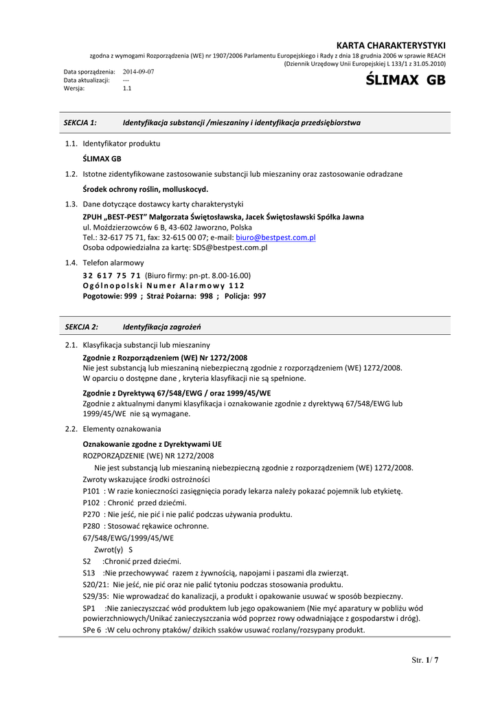 KARTA CHARAKTERYSTYKI zgodna z wymogami Rozporządzenia (WE) nr 1907/2006 Parlamentu Europejskiego i Rady z dnia 18 grudnia 2006 w sprawie REACH (Dziennik Urzędowy Unii Europejskiej L 133/1 z 31.05.2010) Data sporządzenia: 2014-09-07 Data aktualizacji: --Wersja: 1.1 ŚLIMAX GB SEKCJA 1: Identyfikacja substancji /mieszaniny i identyfikacja przedsiębiorstwa 1.1. Identyfikator produktu ŚLIMAX GB 1.2. Istotne zidentyfikowane zastosowanie substancji lub mieszaniny oraz zastosowanie odradzane Środek ochrony roślin, molluskocyd. 1.3. Dane dotyczące dostawcy karty charakterystyki ZPUH „BEST-PEST” Małgorzata Świętosławska, Jacek Świętosławski Spółka Jawna ul. Moździerzowców 6 B, 43-602 Jaworzno, Polska Tel.: 32-617 75 71, fax: 32-615 00 07; e-mail: [email protected] Osoba odpowiedzialna za kartę: [email protected] 1.4. Telefon alarmowy 3 2 6 1 7 7 5 7 1 (Biuro firmy: pn-pt. 8.00-16.00) Ogólnopolski Numer Alarmowy 112 Pogotowie: 999 ; Straż Pożarna: 998 ; Policja: 997 SEKCJA 2: Identyfikacja zagrożeń 2.1. Klasyfikacja substancji lub mieszaniny Zgodnie z Rozporządzeniem (WE) Nr 1272/2008 Nie jest substancją lub mieszaniną niebezpieczną zgodnie z rozporządzeniem (WE) 1272/2008. W oparciu o dostępne dane , kryteria klasyfikacji nie są spełnione. Zgodnie z Dyrektywą 67/548/EWG / oraz 1999/45/WE Zgodnie z aktualnymi danymi klasyfikacja i oznakowanie zgodnie z dyrektywą 67/548/EWG lub 1999/45/WE nie są wymagane. 2.2. Elementy oznakowania Oznakowanie zgodne z Dyrektywami UE ROZPORZĄDZENIE (WE) NR 1272/2008 Nie jest substancją lub mieszaniną niebezpieczną zgodnie z rozporządzeniem (WE) 1272/2008. Zwroty wskazujące środki ostrożności P101 : W razie konieczności zasięgnięcia porady lekarza należy pokazać pojemnik lub etykietę. P102 : Chronić przed dziećmi. P270 : Nie jeść, nie pić i nie palić podczas używania produktu. P280 : Stosować rękawice ochronne. 67/548/EWG/1999/45/WE Zwrot(y) S S2 :Chronić przed dziećmi. S13 :Nie przechowywać razem z żywnością, napojami i paszami dla zwierząt. S20/21: Nie jeść, nie pić oraz nie palić tytoniu podczas stosowania produktu. S29/35: Nie wprowadzać do kanalizacji, a produkt i opakowanie usuwać w sposób bezpieczny. SP1 :Nie zanieczyszczać wód produktem lub jego opakowaniem (Nie myć aparatury w pobliżu wód powierzchniowych/Unikać zanieczyszczania wód poprzez rowy odwadniające z gospodarstw i dróg). SPe 6 :W celu ochrony ptaków/ dzikich ssaków usuwać rozlany/rozsypany produkt. Str. 1/ 7 KARTA CHARAKTERYSTYKI zgodna z wymogami Rozporządzenia (WE) nr 1907/2006 Parlamentu Europejskiego i Rady z dnia 18 grudnia 2006 w sprawie REACH (Dziennik Urzędowy Unii Europejskiej L 133/1 z 31.05.2010) Data sporządzenia: 2014-09-07 Data aktualizacji: --Wersja: 1.1 ŚLIMAX GB 2.3. Inne zagrożenia: Porady ogólne : Brak dostępnych informacji SEKCJA 3: Skład/informacja o składnikach 3.2. Mieszaniny metaldehyd 2,4,6,8-tetrametylo-1,3,5,7-tetroksokan; Zawartość: Nr WE: Nr CAS: Annex I ok. 3 % 203-600-2 108-62-3 (37273-91-9, 9002-91-9) 605-005-00-7 Klasyfikacja: Rozporządzenie (WE) Nr 1272/2008: Flam. Sol. 2 ; H228, Acute Tox.3 H301 Dyrektywa 67/548/EWG / oraz 1999/45/WE: F, Xn, R11, R22 Pełny tekst zwrotów H przytoczonych w tej sekcji znajduje się w Sekcji 16. Pełny tekst zwrotów R przytoczonych w tej sekcji umieszczono w Sekcji 16. SEKCJA 4: Środki pierwszej pomocy 4.1. Opis środków pierwszej pomocy Wdychanie Nie są wymagane specjalne środki ostrożności. Kontakt przez skórę Zanieczyszczoną skórę natychmiast przemyć dużą ilością wody z mydłem. W przypadku podrażnienia skóry lub reakcji alergicznych udać się do lekarza. Kontakt z oczami Niezwłocznie przemyć oczy dużą ilością wody. Jeśli podrażnienie oczu utrzymuje się, skonsultować się ze specjalistą. Połknięcie W razie przypadkowego połknięcia uzyskać niezwłocznie opiekę medyczną. Przemyć usta wodą i następnie wypić dużą ilość wody. Nie wywoływać wymiotów bez konsultacji z lekarzem. Nieprzytomnej osobie nigdy nie podawać nic doustnie. 4.2. Najważniejsze ostre i opóźnione objawy oraz skutki narażenia Objawy : brak dostępnej informacji. 4.3. Wskazania dotyczące wszelkiej natychmiastowej pomocy lekarskiej i szczególnego postępowania z poszkodowanym Informacja dotycząca pierwszej pomocy dla lekarzy: brak dostępnej informacji Antidotum: brak dostępnej informacji. SEKCJA 5: Postępowanie w przypadku pożaru 5.1. Środki gaśnicze Właściwe środki gaśnicze : suchy proszek, woda, piana 5.2. Szczególe zagrożenia związane z substancją lub mieszaniną Specyficzne zagrożenia w czasie zwalczania pożaru: nagrzewanie lub narażanie na płomień może powodować wydzielanie się toksycznego gazu. Str. 2/ 7 KARTA CHARAKTERYSTYKI zgodna z wymogami Rozporządzenia (WE) nr 1907/2006 Parlamentu Europejskiego i Rady z dnia 18 grudnia 2006 w sprawie REACH (Dziennik Urzędowy Unii Europejskiej L 133/1 z 31.05.2010) Data sporządzenia: 2014-09-07 Data aktualizacji: --Wersja: 1.1 ŚLIMAX GB 5.3. Informacje dla straży pożarnej Specjalistyczny sprzęt ochronny dla strażaków: użyć środków ochrony osobistej. Dalsze informacje: Dla chłodzenia nieotwartych pojemników stosować rozpylony strumień wody. SEKCJA 6: Postępowanie w przypadku niezamierzonego uwolnienia do środowiska 6.1. Indywidualne środki ostrożności, wyposażenie ochronne i procedury w sytuacjach awaryjnych Indywidualne środki ostrożności: Unikać tworzenia się pyłu. Użyć środków ochrony osobistej. 6.2. Środki ostrożności w zakresie ochrony środowiska: Środki ostrożności w zakresie ochrony środowiska: Nie dopuścić do przedostania się produktu do kanalizacji. 6.3. Metody i materiały zapobiegające rozprzestrzenianiu się skażenia i służące do usuwania skażenia Metody oczyszczania: Zebrać próżniowo rozsypany materiał i zebrać w odpowiednim pojemniku do usunięcia. 6.4. Odniesienia do innych sekcj