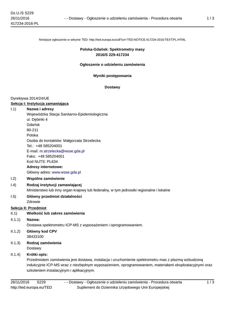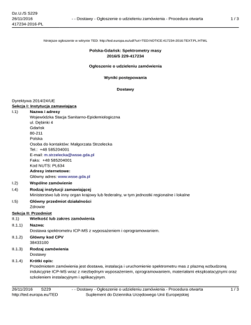 Dz.U./S S229 26/11/2016 417234-2016-PL - - Dostawy - Ogłoszenie o udzieleniu zamówienia - Procedura otwarta 1/3 Niniejsze ogłoszenie w witrynie TED: http://ted.europa.eu/udl?uri=TED:NOTICE:417234-2016:TEXT:PL:HTML Polska-Gdańsk: Spektrometry masy 2016/S 229-417234 Ogłoszenie o udzieleniu zamówienia Wyniki postępowania Dostawy Dyrektywa 2014/24/UE Sekcja I: Instytucja zamawiająca I.1) Nazwa i adresy Wojewódzka Stacja Sanitarno-Epidemiologiczna ul. Dębinki 4 Gdańsk 80-211 Polska Osoba do kontaktów: Małgorzata Strzelecka Tel.: +48 585204001 E-mail: [email protected] Faks: +48 585204001 Kod NUTS: PL634 Adresy internetowe: Główny adres: www.wsse.gda.pl I.2) Wspólne zamówienie I.4) Rodzaj instytucji zamawiającej Ministerstwo lub inny organ krajowy lub federalny, w tym jednostki regionalne i lokalne I.5) Główny przedmiot działalności Zdrowie Sekcja II: Przedmiot II.1) Wielkość lub zakres zamówienia II.1.1) Nazwa: Dostawa spektrometru ICP-MS z wyposażeniem i oprogramowaniem. II.1.2) Główny kod CPV 38433100 II.1.3) Rodzaj zamówienia Dostawy II.1.4) Krótki opis: Przedmiotem zamówienia jest dostawa, instalacja i uruchomienie spektrometru mas z plazmą wzbudzoną indukcyjnie ICP-MS wraz z niezbędnym wyposażeniem, oprogramowaniem, materiałami eksploatacyjnymi oraz szkoleniem instalacyjnym i aplikacyjnym. 26/11/2016 S229 http://ted.europa.eu/TED - - Dostawy - Ogłoszenie o udzieleniu zamówienia - Procedura otwarta Suplement do Dziennika Urzędowego Unii Europejskiej 1/3 Dz.U./S S229 26/11/2016 417234-2016-PL - - Dostawy - Ogłoszenie o udzieleniu zamówienia - Procedura otwarta 2/3 II.1.6) Informacje o częściach To zamówienie podzielone jest na części: nie II.1.7) Całkowita wartość zamówienia (bez VAT) Najtańsza oferta: 450 000.00 PLN / Najdroższa oferta: 556 466.00 PLN brana pod uwagę II.2) Opis II.2.1) Nazwa: II.2.2) Dodatkowy kod lub kody CPV II.2.3) Miejsce świadczenia usług Kod NUTS: PL634 Główne miejsce lub lokalizacja realizacji: 80-211 Gdańsk, ul. Dębinki 4. II.2.4) Opis zamówienia: Przedmiotem zamówienia jest dostawa, instalacja i uruchomienie 1 szt. spektrometru mas z plazmą wzbudzoną indukcyjnie ICP-MS wraz z niezbędnym wyposażeniem, oprogramowaniem, materiałami eksploatacyjnymi oraz szkoleniem instalacyjnym i aplikacyjnym. II.2.5) Kryteria udzielenia zamówienia Kryterium jakości - Nazwa: Parametry techniczne / Waga: 50 % Cena - Waga: 50 % II.2.11) Informacje o opcjach Opcje: nie II.2.13) Informacje o funduszach Unii Europejskiej Zamówienie dotyczy projektu/programu finansowanego ze środków Unii Europejskiej: nie II.2.14) Informacje dodatkowe Sekcja IV: Procedura IV.1) Opis IV.1.1) Rodzaj procedury Procedura otwarta IV.1.3) Informacje na temat umowy ramowej lub dynamicznego systemu zakupów IV.1.6) Informacje na temat aukcji elektronicznej IV.1.8) Informacje na temat Porozumienia w sprawie zamówień rządowych (GPA) Zamówienie jest objęte Porozumieniem w sprawie zamówień rządowych: nie IV.2) Informacje administracyjne IV.2.1) Poprzednia publikacja dotycząca przedmiotowego postępowania Numer ogłoszenia w Dz.Urz. UE – OJ/S: 2016/S 178-319175 IV.2.8) Informacje o zakończeniu dynamicznego systemu zakupów IV.2.9) Informacje o zakończeniu zaproszenia do ubiegania się o zamówienie w postaci wstępnego ogłoszenia informacyjnego Sekcja V: Udzielenie zamówienia Nazwa: Dostawa spektrometru ICP-MS z wyposażeniem i oprogramowaniem Zamówienie/zamówienie na część zostaje udzielone: tak 26/11/2016 S229 http://ted.europa.eu/TED - - Dostawy - Ogłoszenie o udzieleniu zamówienia - Procedura otwarta Suplement do Dziennika Urzędowego Unii Europejskiej 2/3 Dz.U./S S229 26/11/2016 417234-2016-PL - - Dostawy - Ogłoszenie o udzieleniu zamówienia - Procedura otwarta V.2) Udzielenie zamówienia V.2.1) Data zawarcia umowy: 18/11/2016 V.2.2) Informacje o ofertach Liczba otrzymanych ofert: 3 Zamówienie zostało udzielone grupie wykonawców: nie V.2.3) Nazwa i adres wykonawcy Perlan Technologies Polska Sp. z o.o. ul. Puławska 303 Warszawa 02-785 Polska Kod NUTS: PL127 Wykonawcą jest MŚP: nie V.2.4) Informacje na temat wartości zamówienia/części (bez VAT) Całkowita końcowa wartość umowy/części: 556 466.00 PLN V.2.5) Informacje na temat podwykonawstwa 3/3 Sekcja VI: Informacje uzupełniające VI.3) Informacje dodatkowe: VI.4) Procedury odwoławcze VI.4.1) Organ odpowiedzialny za procedury odwoławcze Prezes Krajowej Izby Odwoławczej ul. Postępu 17a Warszawa 02-676 Polska Tel.: +48 224587801 E-mail: [email protected] Faks: +48 224587800 Adres internetowy:www.uzp.gov.pl VI.4.2) Organ odpowiedzialny za procedury mediacyjne VI.4.3) Składanie odwołań VI.4.4) Źródło, gdzie można uzyskać informacje na temat składania odwołań VI.5) Data wysłania niniejszego ogłoszenia: 24/11/2016 26/11/2016 S229 http://ted.europa.eu/TED - - Dostawy - Ogłoszenie o udzieleniu zamówienia - Procedura otwarta Suplement do Dziennika Urzędowego Unii Europejskiej 3/3