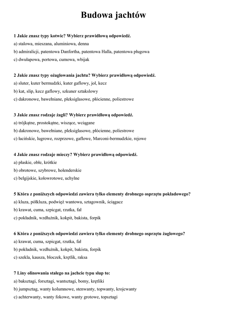 Budowa jachtów 1 Jakie znasz typy kotwic? Wybierz prawidłową odpowiedź. a) stalowa, mieszana, aluminiowa, denna b) admiralicji, patentowa Danfortha, patentowa Halla, patentowa pługowa c) dwułapowa, portowa, cumowa, wbijak 2 Jakie znasz typy ożaglowania jachtu? Wybierz prawidłową odpowiedź. a) sluter, kuter bermudzki, kuter gaflowy, jol, kecz b) kat, slip, kecz gaflowy, szkuner sztakslowy c) dakronowe, bawełniane, pleksiglasowe, płócienne, poliestrowe 3 Jakie znasz rodzaje żagli? Wybierz prawidłową odpowiedź. a) trójkątne, prostokątne, wiszące, wciągane b) dakronowe, bawełniane, pleksiglasowe, płócienne, poliestrowe c) łacińskie, lugrowe, rozprzowe, gaflowe, Marconi-bermudzkie, rejowe 4 Jakie znasz rodzaje mieczy? Wybierz prawidłową odpowiedź. a) płaskie, obłe, krótkie b) obrotowe, szybrowe, holenderskie c) belgijskie, kołowrotowe, uchylne 5 Która z poniższych odpowiedzi zawiera tylko elementy drobnego osprzętu pokładowego? a) kluza, półkluza, podwięź wantowa, sztagownik, ściągacz b) krawat, cuma, szpicgat, rzutka, fał c) pokładnik, wzdłużnik, kokpit, bakista, forpik 6 Która z poniższych odpowiedzi zawiera tylko elementy drobnego osprzętu żaglowego? a) krawat, cuma, szpicgat, rzutka, fał b) pokładnik, wzdłużnik, kokpit, bakista, forpik c) szekla, kausza, bloczek, krętlik, raksa 7 Liny olinowania stałego na jachcie typu slup to: a) baksztagi, forsztagi, wantsztagi, bomy, krętliki b) jumpsztag, wanty kolumnowe, stenwanty, topwanty, krojcwanty c) achterwanty, wanty fokowe, wanty grotowe, topsztagi 8 Jakie znasz rodzaje ruf? Wybierz prawidłową odpowiedź. a) szpicgat, kanugat, konchowa b) obła, zamknięta, flagsztokowa c) achterpikowa, baksztagowa, szturwałowa 9 Jakie znasz rodzaje dziobów? Wybierz prawidłową odpowiedź. a) ostry, tępy, podniesiony b) skośny, łyżkowy, kliprowy c) kegowy, kliprowy, keczowy 10 Jakie znasz kształty przekrojów poprzecznych kadłuba? Wybierz prawidłową odpowiedź. a) obły, klepkowy, łamany b) skośnodenny, okrągłodenny, płaskodenny c) uniwersalny, półokrągły, morski 11 Jakie są 3 sposoby mocowania żagli do drzewca? Wybierz prawidłową odpowiedź. a) sargasy, merlinka, wężyk b) żmijka, pełzacze (ślizgacze), liklina c) ciasny, na wcisk, dolny 12 Wskaż elementy żagla gaflowego: a) bryg, sakwa, pik przedni, remiza, refbanda b) róg pikowy, lik wolny, lik górny, róg gaflowy c) ucho rufowe, sejzing, róg wiatrowy, lik poziomy, róg linowy 13 Wskaż elementy budowy steru z podnoszoną płetwą: a) rogatnica, przedłużacz, rumpel, fał płetwy sterowej, jarzmo, płetwa sterowa b) koło sterowe, bloczki, fały sterowe, śruby c) stenga, kolumna, cęgi, ściągacz 14 Wskaż elementy budowy masztu: a) szczyt, wstęga, noga, sailor, monument b) chomąto masztu, palce, gruszka, studnia fałowa, szot c) top, stenga, jumpsaling, saling, kolumna 15 Jaką funkcję pełnią wanty? a) podtrzymują maszt w płaszczyźnie wzdłużnej jachtu b) podtrzymują maszt w płaszczyźnie poprzecznej jachtu c) podtrzymują maszt w płaszczyźnie pionowej jachtu 16 Jak nazywają się liny służące do ustawiania żagli względem wiatru? a) szoty b) fały c) wanty 17 Który zawór zakręcamy najpierw – przy kuchence czy przy butli gazowej? a) oba naraz b) przy kuchence gazowej c) przy butli gazowej 18 Wimpel to: a) chorągiewka na topie masztu wskazująca kierunek wiatru b) specjalna mocna nić używana do szycia i cerowania żagli c) nitka przyczepiona do want wskazująca wilgotność powietrza 19 Kilwater to: a) wieloosobowe pomieszczenie mieszkalne b) podłoga na jachcie umożliwiająca swobodne przepływanie wody w zęzach c) ślad pozostawiony na wodzie za jachtem 20 Jak poprawnie wyłączyć silnik zaburtowy? a) zamknąć dopływ paliwa b) wcisnąć przycisk przerywacza zapłonu lub zerwać zrywkę c) wyjąć silnik z wody 21 Jeżeli silnik przestał działać, należy po pierwsze: a) mocno szarpać za szarpankę silnika b) schłodzić silnik zimną wodą c) upewnić się, czy jest paliwo i czy dopływa do silnika 22 Forpik znajduje się: a) w przedniej części kadłuba b) w tylnej części kadłuba c) w centralnej części kadłuba 23 Achterpik znajduje się: a) w przedniej części kadłuba b) w tylnej części kadłuba c) w centralnej części kadłuba 24 Kambuz to: a) przedział dziobowy b) przedział kuchenny c) magazynek żagli 25 Kingston to: a) sejf na jachcie b) ubikacja jachtowa c) magazynek żagli 26 Kokpit to: a) rodzaj żagla przedniego b) zagłębienie w pokładzie, w którym przebywa załoga podczas żeglugi c) najniżej położona część jachtu 27 Zęza to: a) rodzaj żagla przedniego b) zagłębienie w pokładzie, w którym przebywa załoga podczas żeglugi c) najniżej położona część wnętrza jachtu 28 Jak inaczej nazywany jest właz dziobowy? a) achterluk b) forluk c) forpik 29 Knaga to: a) drobny element do łączenia lin ze sobą b) otwór, przez który prowadzone są cumy c) element służący do mocowania (obkładania) lin 30 Do czego służy obciągacz bomu? a) zapobiega nadmiernemu unoszeniu się bomu pod wpływem parcia wiatru na żagiel b) zabezpiecza przed wypadnięciem bomu z refpatentu c) łączy maszt z nokiem bomu 31 Likszpara to: a) szpara w maszcie, w którą wkłada się lik żagla b) podłużny otwór, którym odpływa woda c) okno na jachcie 32 Jak nazywa się okucie na pokładzie, do którego mocujemy wanty? a) podwięź b) sztagownik c) kipa 33 Który z niżej wymienionych elementów wchodzi w skład urządzenia sterowego? a) podwięź b) rumpel c) pokładnik 34 Lina olinowania stałego, która biegnie od topu masztu do dziobu, to? a) wanta b) achtersztag c) sztag 35 Lina olinowania stałego, która biegnie od topu masztu do rufy, to? a) wanta b) achtersztag c) sztag 36 Wanta, która biegnie od topu do burty, to: a) wanta kolumnowa b) topwanta c) stenwanta 37 Wanta, która zamocowana jest pod salingiem i biegnie do burty, to: a) wanta kolumnowa b)