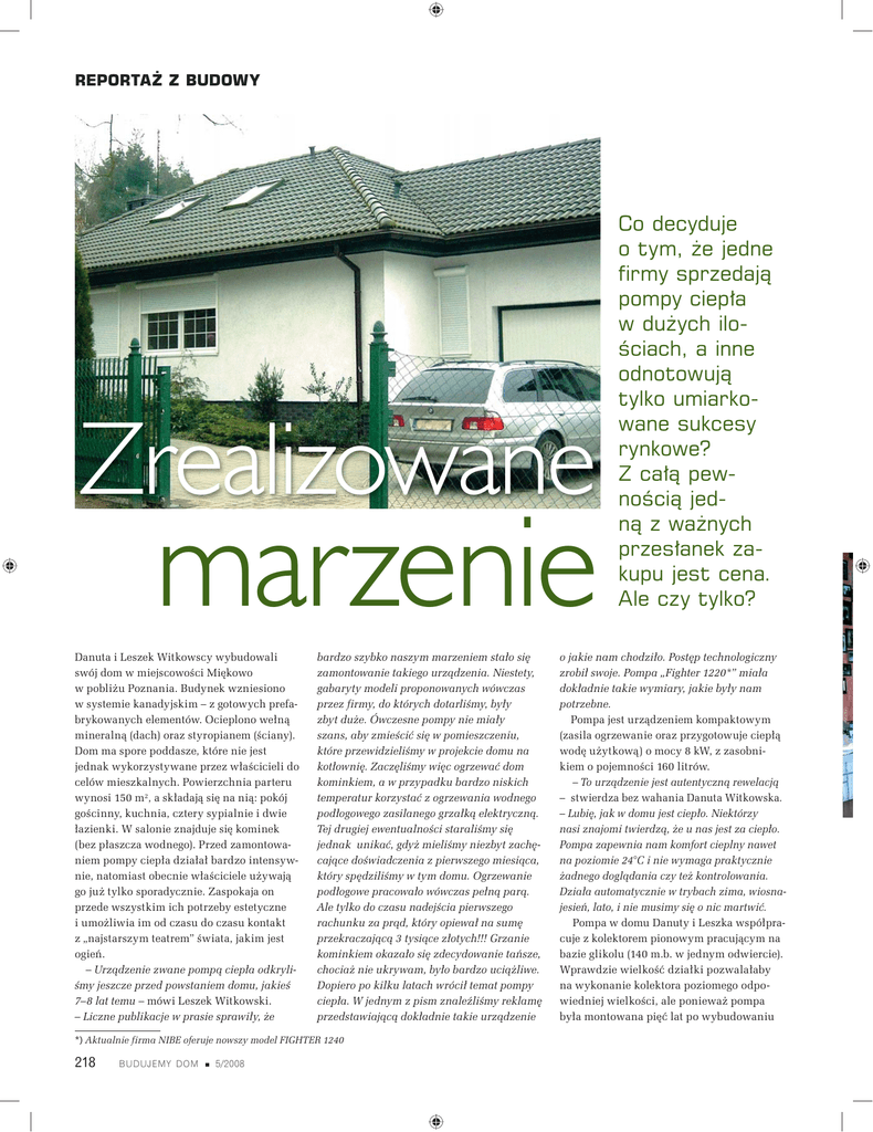 REPORTA¿ Z BUDOWY Zrealizowane marzenie Danuta i Leszek Witkowscy wybudowali swój dom w miejscowoĂci MiÚkowo w pobliĝu Poznania. Budynek wzniesiono w systemie kanadyjskim – z gotowych prefabrykowanych elementów. Ocieplono weïnÈ mineralnÈ (dach) oraz styropianem (Ăciany). Dom ma spore poddasze, które nie jest jednak wykorzystywane przez wïaĂcicieli do celów mieszkalnych. Powierzchnia parteru wynosi 150 m2, a skïadajÈ siÚ na niÈ: pokój goĂcinny, kuchnia, cztery sypialnie i dwie ïazienki. W salonie znajduje siÚ kominek (bez pïaszcza wodnego). Przed zamontowaniem pompy ciepïa dziaïaï bardzo intensywnie, natomiast obecnie wïaĂciciele uĝywajÈ go juĝ tylko sporadycznie. Zaspokaja on przede wszystkim ich potrzeby estetyczne i umoĝliwia im od czasu do czasu kontakt z „najstarszym teatrem” Ăwiata, jakim jest ogieñ. – UrzÈdzenie zwane pompÈ ciepïa odkryliĂmy jeszcze przed powstaniem domu, jakieĂ 7–8 lat temu – mówi Leszek Witkowski. – Liczne publikacje w prasie sprawiïy, ĝe bardzo szybko naszym marzeniem staïo siÚ zamontowanie takiego urzÈdzenia. Niestety, gabaryty modeli proponowanych wówczas przez firmy, do których dotarliĂmy, byïy zbyt duĝe. Ówczesne pompy nie miaïy szans, aby zmieĂciÊ siÚ w pomieszczeniu, które przewidzieliĂmy w projekcie domu na kotïowniÚ. ZaczÚliĂmy wiÚc ogrzewaÊ dom kominkiem, a w przypadku bardzo niskich temperatur korzystaÊ z ogrzewania wodnego podïogowego zasilanego grzaïkÈ elektrycznÈ. Tej drugiej ewentualnoĂci staraliĂmy siÚ jednak unikaÊ, gdyĝ mieliĂmy niezbyt zachÚcajÈce doĂwiadczenia z pierwszego miesiÈca, który spÚdziliĂmy w tym domu. Ogrzewanie podïogowe pracowaïo wówczas peïnÈ parÈ. Ale tylko do czasu nadejĂcia pierwszego rachunku za prÈd, który opiewaï na sumÚ przekraczajÈcÈ 3 tysiÈce zïotych!!! Grzanie kominkiem okazaïo siÚ zdecydowanie tañsze, chociaĝ nie ukrywam, byïo bardzo uciÈĝliwe. Dopiero po kilku latach wróciï temat pompy ciepïa. W jednym z pism znaleěliĂmy reklamÚ przedstawiajÈcÈ dokïadnie takie urzÈdzenie *) Aktualnie firma NIBE oferuje nowszy model FIGHTER 1240 218 BUDUJEMY DOM 5/2008 Co decyduje o tym, ĝe jedne firmy sprzedajÈ pompy ciepïa w duĝych iloĂciach, a inne odnotowujÈ tylko umiarkowane sukcesy rynkowe? Z caïÈ pewnoĂciÈ jednÈ z waĝnych przesïanek zakupu jest cena. Ale czy tylko? o jakie nam chodziïo. PostÚp technologiczny zrobiï swoje. Pompa „Fighter 1220*” miaïa dokïadnie takie wymiary, jakie byïy nam potrzebne. Pompa jest urzÈdzeniem kompaktowym (zasila ogrzewanie oraz przygotowuje ciepïÈ wodÚ uĝytkowÈ) o mocy 8 kW, z zasobnikiem o pojemnoĂci 160 litrów. – To urzÈdzenie jest autentycznÈ rewelacjÈ – stwierdza bez wahania Danuta Witkowska. – LubiÚ, jak w domu jest ciepïo. Niektórzy nasi znajomi twierdzÈ, ĝe u nas jest za ciepïo. Pompa zapewnia nam komfort cieplny nawet na poziomie 24°C i nie wymaga praktycznie ĝadnego doglÈdania czy teĝ kontrolowania. Dziaïa automatycznie w trybach zima, wiosnajesieñ, lato, i nie musimy siÚ o nic martwiÊ. Pompa w domu Danuty i Leszka wspóïpracuje z kolektorem pionowym pracujÈcym na bazie glikolu (140 m.b. w jednym odwiercie). Wprawdzie wielkoĂÊ dziaïki pozwalaïaby na wykonanie kolektora poziomego odpowiedniej wielkoĂci, ale poniewaĝ pompa byïa montowana piÚÊ lat po wybudowaniu Pompy ciepïa domu, caïy teren byï juĝ zagospodarowany. WïaĂciciele nie chcieli niszczyÊ piÚknie urzÈdzonego ogrodu oraz zamontowanej tam instalacji automatycznego nawadniania. – Dlaczego wybraliĂmy akurat pompÚ ze Szwecji? Przede wszystkim dlatego, ĝe osoba reprezentujÈca tÚ firmÚ potraktowaïa nas nie jak klientów, którym trzeba za wszelkÈ cenÚ coĂ sprzedaÊ... ale jak partnerów – podkreĂla Leszek Witkowski. – UzyskaliĂmy szereg wskazówek i peïnÈ pomoc. Waĝne byïo teĝ to, ĝe wybór konkretnego urzÈdzenia byï poprzedzony szczegóïowÈ analizÈ. Wiedziaïem, ĝe pompa jest dobierana do naszych potrzeb. Przedstawiciela producenta interesowaïo na przykïad to jakie temperatury chcemy osiÈgaÊ w domu, jaka jest kubatura budynku, jak jest on skonstruowany i ocieplony, ile jest pomieszczeñ, czy korzystamy z prysznica, czy teĝ z wanny itd. Jakĝe inne byïo to podejĂcie od postawy przedstawiciela innej znanej firmy, który juĝ po krótkiej rozmowie telefonicznej „wiedziaï”, jakie urzÈdzenie mi sprzeda i na ile opiewaï bÚdzie rachunek. Pompa jest poïÈczona z kolektorem w sposób nietypowy, to znaczy przez ĂcianÚ, a nie przez podïogÚ. Podobnie jak decyzja o wykonaniu kolektora pionowego, równieĝ i to rozwiÈzanie byïo konsekwencjÈ montowania urzÈdzenia w domu od dawna zamieszkanym i urzÈdzonym. Aby nie niszczyÊ posadzki i uniknÈÊ uciÈĝliwego podkopywania fundamentów, wykonano poïÈczenie w taki sposób, ĝe „wchodzi” ono do budynku przez ĂcianÚ zewnÚtrznÈ. Wymagaïo to wprawdzie dodatkowego zabezpieczenia tej czÚĂci muru zewnÚtrznego warstwÈ styropianu, ale okazaïo siÚ ïatwiejsze w wykonaniu i mniej uciÈĝliwe dla domowników. – Poniewaĝ mam umysï analityczny, postanowiïem sprawdziÊ na liczbach, jak zachowuje siÚ nowe urzÈdzenie – mówi Leszek Witkowski. – ZaczÈïem notowaÊ jego parametry oraz zuĝycie prÈdu. OczywiĂcie orientacyjnie, bo nie mamy osobnego licznika prÈdu dla pompy ciepïa. Z rocznego zestawienia, które uwaĝam za najbardziej wiarygodne, wyszïo mi, ĝe za ogrzewanie domu oraz wytwarzanie ciepïej wody wydaliĂmy okoïo 2,5 tysiÈca zïotych. A wiÚc dokïadnie tyle, ile mówiï przedstawiciel producenta. – FascynujÈca jest prostota obsïugi pompy ciepïa – podkreĂla Danuta Witkowska – Tak skomplikowane technicznie urzÈdzenie obsïuguje siÚ bardzo prosto. ChcÚ na przykïad, aby ciepïa woda byïa produkowana bardziej intensywnie... Nie ma ĝadnego problemu. Wystarczy wcisnÈÊ jeden przycisk. Pompa zuĝywa maïo prÈdu. Dodatk