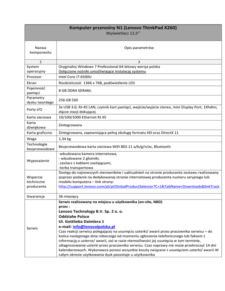 Komputer przenośny N1 (Lenovo ThinkPad X260) Wyświetlacz 12,5’’ Nazwa komponentu 1 System operacyjny Procesor Ekran Pojemność pamięci Parametry dysku twardego Porty I/O Karta sieciowa Karta dźwiękowa Karta graficzna Opis parametrów 2 Oryginalny Windows 7 Professional 64-bitowy wersja polska Dołączone nośniki umożliwiające instalację systemu Intel Core i7-6500U Rozdzielczość 1366 x 768, podświetlenie LED 8 GB DDR4 SDRAM, 256 GB SSD 3x USB 3.0, RJ-45 LAN, czytnik kart pamięci, wejście/wyjście stereo, mini Display Port, 1Xhdmi, złącze stacji dokującej 10/100/1000 Ethernet RJ 45 Zintegrowana Zintegrowana, zapewniająca pełną obsługę formatu HD oraz DirectX 11 Waga 1,34 kg Technologie Bezprzewodowa karta sieciowa WiFi 802.11 a/b/g/n/ac, Bluetooth bezprzewodowe -wbudowana kamera internetowa, - wbudowane 2 głośniki, Wyposażenie -zasilacz z kablami zasilającymi, -torba transportowa Dostęp do najnowszych sterowników i uaktualnień na stronie producenta zestawu realizowany Wsparcie poprzez podanie na dedykowanej stronie internetowej producenta numeru seryjnego lub techniczne modelu komputera – link strony: producenta http://support.lenovo.com/pl/pl/GlobalProductSelector?C=1&TabName=Downloads&linkTrack Gwarancja Serwis 36 miesięcy Serwis realizowany na miejscu u użytkownika (on-site, NBD) przez : Lenovo Technology B.V. Sp. Z o. o. Oddziałw Polsce Ul. Gottlieba Daimlera 1 e-mail: [email protected] Czas reakcji serwisu polegającej na usunięciu usterki/ awarii przez pracownika serwisu – do końca następnego dnia roboczego od momentu zgłoszenia telefonicznego lub faksem z informacją o usterce/ awarii, zaś w razie niemożliwości jej usunięcia w tym terminie, zdiagnozowanie usterki przez pracownika serwisu. Czas naprawy nie może przekroczyć 14 dni kalendarzowych. Wykonawca ponosi wszystkie koszty związane z usunięciem usterki/ awarii.W całym okresie użytkowania dysk pozostaje u użytkownika