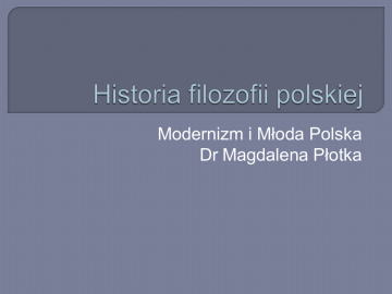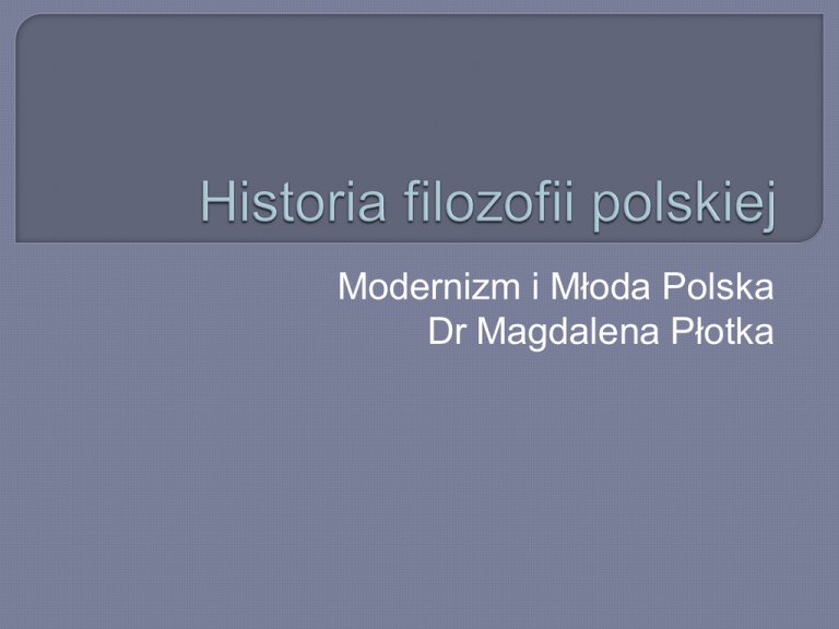 Modernizm i Młoda Polska Dr Magdalena Płotka 1. Ogólna nazwa tendencji artystycznych, jakie pojawiły się na przełomie XIX i XX wieku, a ich wspólną cechą było przeciwstawienie się historycznym stylom w sztuce 2. Nazwa ruchu filozoficzno-religijnego w łonie katolicyzmu, który przeciwstawiając się pierwiastkowi racjonalnemu, podnosił rolę czynnika emocjonalnego w wierze W Polsce na okres modernizmu mówi się „neoromantyzm” – powrót ku ideom Romantyzmu Dlaczego literatura? Ideolodzy nurtu artystycznego Młodej Polski uznawali bowiem literaturę za formę ekspresji wykraczającą poza kanony literackie w stronę: filozofii, religii, psychologii czy socjologii. Czołowi pisarze „ufilozoficznieni” MP: Ignacy Matuszewski, Antoni Lange, Stanisław Przybyszewski, Zenon Przesmycki, Artur Górski, Jerzy Żuławski, Bolesław Miciński, Karol Irzykowski, Wacław Berent. Najwybitniejsza postać drugiego pokolenia Młodej Polski Inspirował się Kantem, Fichtem, Nietzschem, Marksem. Wskazywał na irracjonalny wymiar życia, uważał, że dotychczasowe doktryny filozoficzne nie przystają do rzeczywistości, nie są w stanie jej „okiełznać”. Dzieje się tak dlatego, że „życie” (podstawowa kategoria filozofii Brzozowskiego) zawiera w sobie dynamizm, wolność, zmienność, otwartość na przyszłość i wolę twórczości, której owocem jest czyn. Życie jest rzeczywistością paradoksalną: skończoną i nieskończoną, powszechną i indywidualizującą – jako takiej nie da się jej poznać Skoro nie da się poznać – podstawowym zadanie filozofii życia to uzasadnienie czynu, czyli pracy, dzięki której przekraczamy granicę poznawalności świata. Zdaniem SB ontologie to koncepcje wytworzone przez człowieka, który nadaje sens swemu życiu i światu. Nie można więc żyć pod ciągłą presją zastanę rzeczywistości, tylko nieustannie ją kreować. Aktywistyczna ontologia łączy się z aktywistyczną epistemologią – poznajemy rzeczywistość w twórczym jej doświadczeniu w pracy Praca jest procesem, który poprzedza wszelkie systemy myślowe, od niej zależy ludzkie bytowanie Z pracą wiąże się też poczucie odpowiedzialności wobec świata Brzozowski w swych licznych pracach (zmarł w wieku lat 33 z niedożywienia) odniósł się krytycznie do dziedzictwa rzeczopospolitej szlacheckiej, tradycji romantycznej oraz poglądów własnego pokolenia Krytykę zawarł w tekście „Legenda Młodej Polski”. Neomesjanizm z przełomu XIX i XX wieku powstał : 1. jako sprzeciw wobec ideologii historycznej szkoły krakowskiej (stańczyków) 2. w nawiązaniu do kategorii pojęciowych wypracowanych przez mesjanizm romantyczny: „naród”, „dusza narodu”, „misja narodowa”. Do neomesjanistów należeli: Wojciech Dzieduszycki, Stanisław Szczepanowski Najwybitniejszy z nich to Wincenty Lutosławski – znawca Platona oraz wynalazca metody porządkującej chronologię jego dialogów. Był autorem o rozgłosie międzynarodowym: głosił wykłady w USA, Genewie, Lozannie i Paryżu. Poglądy jego to pluralistyczny spirytualizm – świat jest zbiorem bytów duchowych W konstruowaniu wiedzy metafizycznej Lutosławski pierwszoplanową rolę przyznał filozofom, a nie artystom, czym wyrażał swój dystans wobec programów modernistycznych. W pismach Lutosławskiego pojawiają się wątki wprowadzenia zasad chrześcijańskich do polityki oraz pierwszeństwo narodu przed państwem Neoscholastyka, która powstała jako sprzeciw wobec pozytywizmowi tym bardziej umocniła się w obliczu pojawienia się w filozofii modernistycznej wątków irracjonalnych w wierze. Zatem: nescholastyka jako droga pośrednia między Scyllą materializmu i empiriokrytycyzmu a Charybdą irracjonalizmu. Przedstawicielem modernizmu religijnego był Marian Zdziechowski –nawiązywał do ideałów romantycznych Korzeni modernizmu religijnego szukał Zdziechowski w subiektywizmie Kanta, irracjonalizmie Schellinga, pesymizmie Schopenhauera, spirytualistycznej metafizyce Bergsoba, w filozofii czynu Blondela, w pisarstwie Tołstoja i mistyce Sołowjowa. W czasie powstania styczniowego „sprawa polska” nabrała rozgłosu I Międzynarodówka udzieliła poparcia powstańcom (kwestia polska zyskał rozgłos międzynarodowy) Rozwój infrastruktury w zaborze rosyjskim spowodował, że zaczęły się pojawiać pierwsze polskie kółka socjalistyczne Ludwik Waryński zaczął organizować ruch socjalistyczny w Polsce Jednak Waryński i jego otoczenie marginalizowali kwestię narodową do tego stopnia, że przywódcy międzynarodowego ruchu robotniczego musieli przypominać Polakom, jaką rangę w walce o wyzwolenie społeczne miały ich wcześniejsze zrywy niepodległościowe. Umocnienie się socjalizmu zrodziło teoretyków socjalizmu. Krzywicki był socjologiem i etnologiem, ujmował marksizm jako teorię rozwoju społecznego. Był autorem teorii „podłoża historycznego”: o rozwoju społecznym decydują nie tylko warunki przyrodnicze, lecz również czynnik antropologiczny, zbiorowa psychika, rodzaj wykonywanych zajęć oraz wyznawane idee (wartości społeczne). Idee mają charakter wędrowny, potrafią zmieniać miejsce i czas, powodując zmianę formacji ekonomicznych i społecznych, posiadają rangę czynników historiotwórczych. Źródłem idei są społeczeństwa rozwinięte, z których idee wędrują do społeczeństw bardziej zacofanych. Czym jest utopia? – idee nie nadążają za biegiem wypadków. Inteligencja (warstwa) posiada znaczenie w rozwoju społecznym (nie tylko proletariat). Zainteresowanie marksizmem • Lata 1906-1909 • „Filozofia czynu” uzasadnienie postawy aktywistycznej Filozofia pracy • Wpływ lektur Marksa i marksistów rosyjskich: • SB dostrzegł praktyczny i zespołowy wymiar ludzkiego działania, w wyniku którego dokonuje się przemiana świata Przewartościowanie marksizmu Sorel • Przeciwstawił prometeizm Marksa naturalizmowi Engelsa, prze