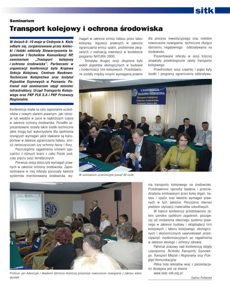 Seminarium Transport kolejowy i ochrona środowiska W dniach 8–10 maja w Cedzynie k. Kielc odbyło się, zorganizowane przez kielecki i łódzki oddziały Stowarzyszenia Inżynierów i Techników Komunikacji RP, seminarium „Transport kolejowy i ochrona środowiska”. Partnerami w organizacji konferencji była Krajowa Sekcja Kolejowa, Centrum NaukowoTechniczne Kolejnictwa oraz Instytut Pojazdów Szynowych w Poznaniu. Patronat nad seminarium objął minister infrastruktury, Urząd Transportu Kolejowego oraz PKP PLK S.A i PKP Przewozy Regionalne. Konferencja miała na celu zapoznanie uczestników z nowym stanem prawnym, jaki istnieje lub wejdzie w życie w najbliższym czasie w zakresie ochrony środowiska. Ponadto zaprezentowane zostały także środki techniczne jakie mogą być wykorzystane dla spełnienia rosnących wymagań jakie stawiane są transportowi w zakresie ograniczania hałasu, emisji zanieczyszczeń czy ochrony fauny i flory. Poszczególne zagadnienia omówili specjaliści z różnych branż z całej Polski podczas pięciu sesji tematycznych. Pierwsza sesja dotyczyła wymagań prawnych w zakresie ochrony środowiska. Zaprezentowane w niej referaty poruszały kwestie systemów monitorowania środowiska, wy- magań w zakresie emisji hałasu przez tabor kolejowy, regulacji prawnych w zakresie ograniczania emisji spalin, problemów związanych z realizacją inwestycji w kontekście programu NATURA 2000. Tematyka drugiej sesji skupiona była wokół aspektów ekologicznych w budowie i modernizacji linii kolejowych. Przedstawione zostały między innymi wymagania prawne dla procesu inwestycyjnego oraz niektóre nowoczesne rozwiązania techniczne służące obniżeniu negatywnego oddziaływania na środowisko. Prezentowane referaty w sesji trzeciej omawiały proekologiczne zalety transportu kolejowego. Przedmiotem sesji czwartej i piątej były środki i programy ograniczenia oddziaływa- W seminarium uczestniczyło ponad 80 osób Profesor Jan Adamczyk z Akademii Górniczo-Hutniczej prezentuje nowoczesne rozwiązania z zakresu wibroakustyki nia transportu kolejowego na środowisko. Przedstawiono sposoby badania i przeciwdziałania emitowanym przez kolej drgań, hałasu i spalin oraz kwestie wymagań prawnych w tym zakresie. Poruszono również problem utylizacji materiałów szkodliwych. W trakcie konferencji przedstawiono zatem szerokie spektrum zagadnień, począwszy od omówienia obecnego systemu prawnego w zakresie budowy i eksploatacji linii kolejowych i taboru kolejowego, ekologicznych i ekonomicznych uwarunkowań przedsięwzięć modernizacyjnych po zagadnienia w zakresie ekologii i ochrony zdrowia. Patronat prasowy nad konferencją objęły czasopisma: Technika Transportu Szynowego, Transport Miejski i Regionalny oraz Przegląd Komunikacyjny. Pełna lista referatów wraz z prezentacjami dostępna jest na stronie www.lodz-sitk.org.pl Sabina Puławska