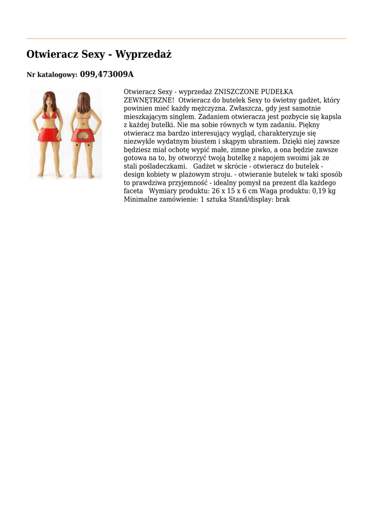 Otwieracz Sexy - Wyprzedaż Nr katalogowy: 099,473009A Otwieracz Sexy - wyprzedaż ZNISZCZONE PUDEŁKA ZEWNĘTRZNE! Otwieracz do butelek Sexy to świetny gadżet, który powinien mieć każdy mężczyzna. Zwłaszcza, gdy jest samotnie mieszkającym singlem. Zadaniem otwieracza jest pozbycie się kapsla z każdej butelki. Nie ma sobie równych w tym zadaniu. Piękny otwieracz ma bardzo interesujący wygląd, charakteryzuje się niezwykle wydatnym biustem i skąpym ubraniem. Dzięki niej zawsze będziesz miał ochotę wypić małe, zimne piwko, a ona będzie zawsze gotowa na to, by otworzyć twoją butelkę z napojem swoimi jak ze stali pośladeczkami. Gadżet w skrócie - otwieracz do butelek design kobiety w plażowym stroju. - otwieranie butelek w taki sposób to prawdziwa przyjemność - idealny pomysł na prezent dla każdego faceta Wymiary produktu: 26 x 15 x 6 cm Waga produktu: 0,19 kg Minimalne zamówienie: 1 sztuka Stand/display: brak