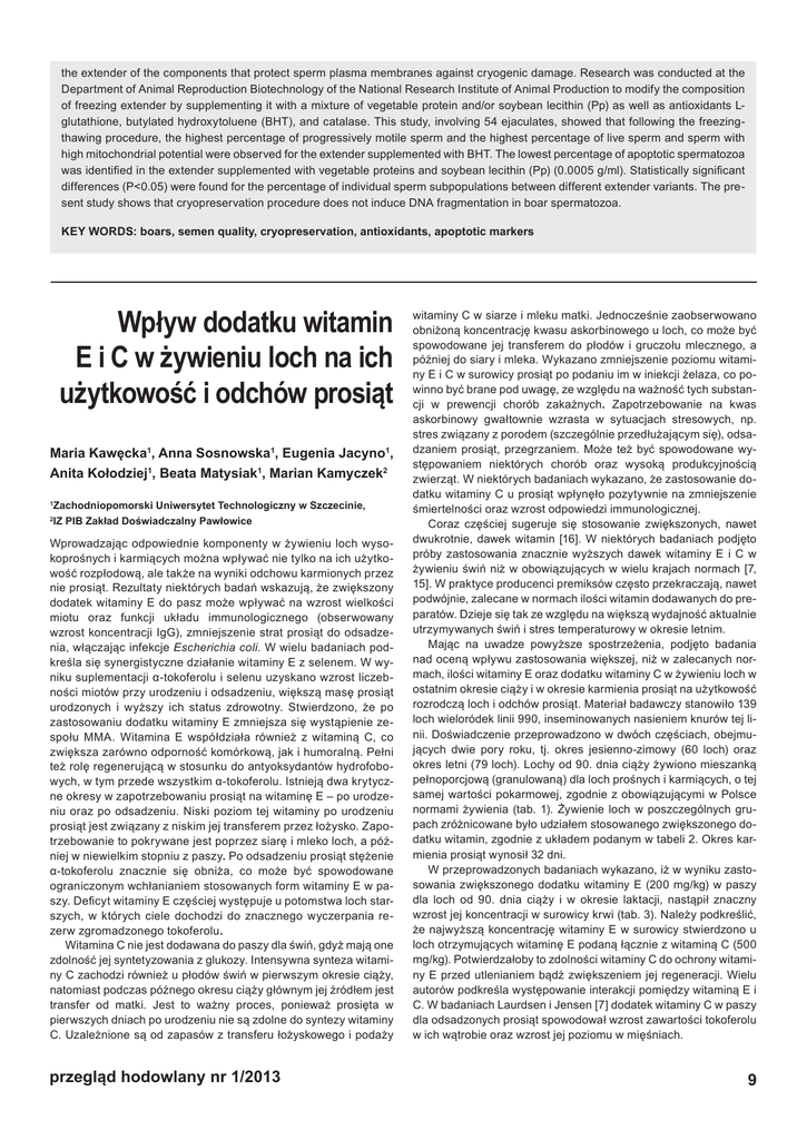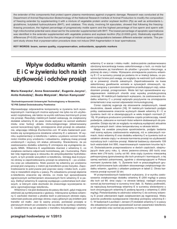 the extender of the components that protect sperm plasma membranes against cryogenic damage. Research was conducted at the Department of Animal Reproduction Biotechnology of the National Research Institute of Animal Production to modify the composition of freezing extender by supplementing it with a mixture of vegetable protein and/or soybean lecithin (Pp) as well as antioxidants Lglutathione, butylated hydroxytoluene (BHT), and catalase. This study, involving 54 ejaculates, showed that following the freezingthawing procedure, the highest percentage of progressively motile sperm and the highest percentage of live sperm and sperm with high mitochondrial potential were observed for the extender supplemented with BHT. The lowest percentage of apoptotic spermatozoa was identified in the extender supplemented with vegetable proteins and soybean lecithin (Pp) (0.0005 g/ml). Statistically significant differences (P<0.05) were found for the percentage of individual sperm subpopulations between different extender variants. The present study shows that cryopreservation procedure does not induce DNA fragmentation in boar spermatozoa. KEY WORDS: boars, semen quality, cryopreservation, antioxidants, apoptotic markers Wpływ dodatku witamin E i C w żywieniu loch na ich użytkowość i odchów prosiąt Maria Kawęcka1, Anna Sosnowska1, Eugenia Jacyno1, Anita Kołodziej1, Beata Matysiak1, Marian Kamyczek2 1 2 Zachodniopomorski Uniwersytet Technologiczny w Szczecinie, IZ PIB Zakład Doświadczalny Pawłowice Wprowadzając odpowiednie komponenty w żywieniu loch wysokoprośnych i karmiących można wpływać nie tylko na ich użytkowość rozpłodową, ale także na wyniki odchowu karmionych przez nie prosiąt. Rezultaty niektórych badań wskazują, że zwiększony dodatek witaminy E do pasz może wpływać na wzrost wielkości miotu oraz funkcji układu immunologicznego (obserwowany wzrost koncentracji IgG), zmniejszenie strat prosiąt do odsadzenia, włączając infekcje Escherichia coli. W wielu badaniach podkreśla się synergistyczne działanie witaminy E z selenem. W wyniku suplementacji α-tokoferolu i selenu uzyskano wzrost liczebności miotów przy urodzeniu i odsadzeniu, większą masę prosiąt urodzonych i wyższy ich status zdrowotny. Stwierdzono, że po zastosowaniu dodatku witaminy E zmniejsza się wystąpienie zespołu MMA. Witamina E współdziała również z witaminą C, co zwiększa zarówno odporność komórkową, jak i humoralną. Pełni też rolę regenerującą w stosunku do antyoksydantów hydrofobowych, w tym przede wszystkim α-tokoferolu. Istnieją dwa krytyczne okresy w zapotrzebowaniu prosiąt na witaminę E – po urodzeniu oraz po odsadzeniu. Niski poziom tej witaminy po urodzeniu prosiąt jest związany z niskim jej transferem przez łożysko. Zapotrzebowanie to pokrywane jest poprzez siarę i mleko loch, a później w niewielkim stopniu z paszy. Po odsadzeniu prosiąt stężenie α-tokoferolu znacznie się obniża, co może być spowodowane ograniczonym wchłanianiem stosowanych form witaminy E w paszy. Deficyt witaminy E częściej występuje u potomstwa loch starszych, w których ciele dochodzi do znacznego wyczerpania rezerw zgromadzonego tokoferolu. Witamina C nie jest dodawana do paszy dla świń, gdyż mają one zdolność jej syntetyzowania z glukozy. Intensywna synteza witaminy C zachodzi również u płodów świń w pierwszym okresie ciąży, natomiast podczas późnego okresu ciąży głównym jej źródłem jest transfer od matki. Jest to ważny proces, ponieważ prosięta w pierwszych dniach po urodzeniu nie są zdolne do syntezy witaminy C. Uzależnione są od zapasów z transferu łożyskowego i podaży przegląd hodowlany nr 1/2013 witaminy C w siarze i mleku matki. Jednocześnie zaobserwowano obniżoną koncentrację kwasu askorbinowego u loch, co może być spowodowane jej transferem do płodów i gruczołu mlecznego, a później do siary i mleka. Wykazano zmniejszenie poziomu witaminy E i C w surowicy prosiąt po podaniu im w iniekcji żelaza, co powinno być brane pod uwagę, ze względu na ważność tych substancji w prewencji chorób zakaźnych. Zapotrzebowanie na kwas askorbinowy gwałtownie wzrasta w sytuacjach stresowych, np. stres związany z porodem (szczególnie przedłużającym się), odsadzaniem prosiąt, przegrzaniem. Może też być spowodowane występowaniem niektórych chorób oraz wysoką produkcyjnością zwierząt. W niektórych badaniach wykazano, że zastosowanie dodatku witaminy C u prosiąt wpłynęło pozytywnie na zmniejszenie śmiertelności oraz wzrost odpowiedzi immunologicznej. Coraz częściej sugeruje się stosowanie zwiększonych, nawet dwukrotnie, dawek witamin [16]. W niektórych badaniach podjęto próby zastosowania znacznie wyższych dawek witaminy E i C w żywieniu świń niż w obowiązujących w wielu krajach normach [7, 15]. W praktyce producenci premiksów często przekraczają, nawet podwójnie, zalecane w normach ilości witamin dodawanych do preparatów. Dzieje się tak ze względu na większą wydajność aktualnie utrzymywanych świń i stres temperaturowy w okresie letnim. Mając na uwadze powyższe spostrzeżenia, podjęto badania nad oceną wpływu zastosowania większej, niż w zalecanych normach, ilości witaminy E oraz dodatku witaminy C w żywieniu loch w ostatnim okresie ciąży i w okresie karmienia prosiąt na użytkowość rozrodczą loch i odchów prosiąt. Materiał badawczy stanowiło 139 loch wieloródek linii 990, inseminowanych nasieniem knurów tej linii. Doświadczenie przeprowadzono w dwóch częściach, obejmujących dwie pory roku, tj. okres jesienno-zimowy (60 loch) oraz okres letni (79 loch). Lochy od 90. dnia ciąży żywiono mieszanką pełnoporcjową (granulowaną) dla loch prośnych i karmiących, o tej samej wartości pokarmowej, zgodnie z obowiązującymi w Polsce normami żywienia (tab. 1). Żywienie loch w poszczególnych grupach zróżnicowane było udziałem stosowanego