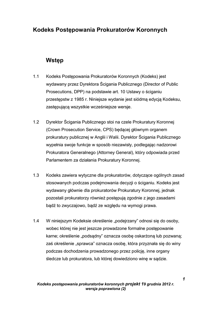 Kodeks Postępowania Prokuratorów Koronnych Wstęp 1.1 Kodeks Postępowania Prokuratorów Koronnych (Kodeks) jest wydawany przez Dyrektora Ścigania Publicznego (Director of Public Prosecutions, DPP) na podstawie art. 10 Ustawy o ściganiu przestępstw z 1985 r. Niniejsze wydanie jest siódmą edycją Kodeksu, zastępującą wszystkie wcześniejsze wersje. 1.2 Dyrektor Ścigania Publicznego stoi na czele Prokuratury Koronnej (Crown Prosecution Service, CPS) będącej głównym organem prokuratury publicznej w Anglii i Walii. Dyrektor Ścigania Publicznego wypełnia swoje funkcje w sposób niezawisły, podlegając nadzorowi Prokuratora Generalnego (Attorney General), który odpowiada przed Parlamentem za działania Prokuratury Koronnej. 1.3 Kodeks zawiera wytyczne dla prokuratorów, dotyczące ogólnych zasad stosowanych podczas podejmowania decyzji o ściganiu. Kodeks jest wydawany głównie dla prokuratorów Prokuratury Koronnej, jednak pozostali prokuratorzy również postępują zgodnie z jego zasadami bądź to zwyczajowo, bądź ze względu na wymogi prawa. 1.4 W niniejszym Kodeksie określenie „podejrzany” odnosi się do osoby, wobec której nie jest jeszcze prowadzone formalne postępowanie karne; określenie „podsądny” oznacza osobę oskarżoną lub pozwaną; zaś określenie „sprawca” oznacza osobę, która przyznała się do winy podczas dochodzenia prowadzonego przez policję, inne organy śledcze lub prokuratora, lub której dowiedziono winę w sądzie. 1 Kodeks postępowania prokuratorów koronnych projekt 19 grudnia 2012 r. wersja poprawiona (2) Zasady ogólne 2.1 Decyzja o podjęciu ścigania sądowego lub zastosowaniu alternatywnej formy postępowania ma istotny wpływ na podejrzanych, ofiary, świadków oraz ogół społeczeństwa i jest poważnym krokiem, który powinien być podejmowany z najwyższą ostrożnością. 2.2 Obowiązkiem prokuratorów jest upewnienie się, że postępowanie prowadzone jest wobec właściwej osoby, która ścigana jest za właściwe przestępstwo, a także wymierzenie sprawiedliwości wobec sprawców w każdym możliwym przypadku. Sprawiedliwe, bezstronne i uczciwe decyzje podejmowane w procesie analizy przypadków umożliwiają sprawiedliwe postępowanie wobec ofiar, świadków i podsądnych oraz leżą w interesie społecznym. Obowiązkiem prokuratorów jest zapewnienie właściwego stosowania prawa; przedstawienie sądowi stosownych dowodów; oraz zapewnienie dostosowania się do wszelkich wymogów związanych z ujawnianiem informacji. 2.3 Każda sprawa powinna być rozpatrzona indywidualnie na podstawie konkretnych faktów. Obowiązują jednak ogólne zasady w odniesieniu do sposobu podejścia prokuratorów do każdej z nich. 2.4 Prokuratorzy powinni postępować w sposób sprawiedliwy, niezawisły i obiektywny. Nie mogą oni pozwolić, aby na ich decyzje wpływały jakiekolwiek poglądy osobiste dotyczące pochodzenia etnicznego lub narodowościowego, płci, niepełnosprawności, wieku, religii lub wyznania, przekonań politycznych, orientacji seksualnej lub tożsamości płciowej podejrzanego, ofiary lub ewentualnych świadków. Prokuratorzy nie mogą również ulegać niewłaściwym lub sprzecznym z prawem naciskom z jakiegokolwiek źródła. Prokuratorzy powinni zawsze działać w imię sprawiedliwości, a nie jedynie w celu uzyskania wyroku skazującego. 2 Kodeks postępowania prokuratorów koronnych projekt 19 grudnia 2012 r. wersja poprawiona (2) 2.5 Prokuratura Koronna jest organem władzy publicznej dla zapewnienia powszechnego, właściwego i równego systemu prawnego. Prokuratorzy są zobowiązani do przestrzegania określonych w nim obowiązków. 2.6 Prokuratorzy muszą stosować zasady określone w Europejskiej Konwencji Praw Człowieka zgodnie z Ustawą o prawach człowieka z 1998 r. na każdym etapie postępowania w sprawie. Prokuratorzy muszą również postępować zgodnie z wytycznymi Prokuratora Generalnego oraz obowiązującymi Zasadami Postępowania Karnego, z uwzględnieniem zobowiązań wynikających z konwencji międzynarodowych. Muszą stosować się do zasad i wytycznych Prokuratury Koronnej wydawanych w imieniu Dyrektora Ścigania Publicznego i powszechnie dostępnych na witrynie internetowej Prokuratury Koronnej Decyzja o ściganiu sądowym 3.1 W poważnych lub skomplikowanych sprawach, prokuratorzy decydują o możliwości oskarżenia danej osoby o przestępstwo karne, określając rodzaj tego przestępstwa. Decyzje podejmowane są na podstawie niniejszego Kodeksu oraz Wytycznych Dyrektora Ścigania Publicznego dotyczących stawiania zarzutów. Takie same zasady stosowane są przez policję przy podejmowaniu decyzji o wszczęciu postępowania karnego w prowadzonych przez nią sprawach. 3.2 Policja oraz inne organy śledcze odpowiadają za prowadzenie dochodzenia w sprawie domniemanego przestępstwa i wykorzystywanie posiadanych zasobów, łącznie z decyzjami o podjęciu lub kontynuowaniu śledztwa oraz jego zakresu. Prokuratorzy często doradzają policji i innym 3 Kodeks postępowania prokuratorów koronnych projekt 19 grudnia 2012 r. wersja poprawiona (2) organom śledczym w kwestii kierunku prowadzenia dochodzenia, wymogów związanych z materiałami dowodowymi oraz udzielają pomocy w procedurach poprzedzających wniesienie oskarżenia. W dochodzeniach prowadzonych na szeroką skalę, prokurator może zostać poproszony o poradę w kwestii ogólnej strategii dochodzeniowej z uwzględnieniem decyzji dotyczących sprecyzowania lub zawężenia zakresu zachowań przestępczych oraz liczby podejrzanych objętych dochodzeniem, pomagając policji i innym organom śledczym w zakończeniu dochodzenia w stosownym terminie oraz przygotowaniu jak najskuteczniejszego aktu oskarżenia. Prokuratorzy nie powinni jednak kierować postępowaniem policji ani innych organów śledczych. 3.3 Prokuratorzy powinni identyfikować słabe punkty w materiałach dowodowych oraz starać się je w miarę możliwości k
