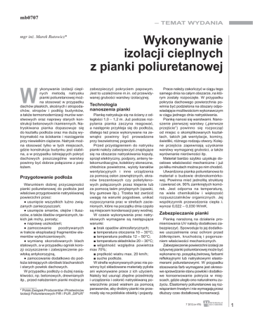 mb0707 – TEMAT WYDANIA mgr inż. Marek Rutowicz* Wykonywanie izolacji cieplnych z pianki poliuretanowej ykonywanie izolacji cieplnych metodą natrysku pianki poliuretanowej można stosować w przypadku dachów płaskich, skośnych i stropodachów, stropów i podłóg budynków, a także termomodernizacji murów warstwowych oraz naprawy starych konstrukcji betonowych i kamiennych. Natryskiwana pianka dopasowuje się do kształtu podłoża oraz ma dużą wytrzymałość na ściskanie i rozciąganie przy niewielkim ciężarze. Natrysk można stosować tylko w tych miejscach, gdzie konstrukcja budynku jest stabilna, a w przypadku istniejących pokryć dachowych poszczególne warstwy powinny być dobrze połączone z podłożem. zabezpieczyć pokryciem papowym. Jest to uzależnione m.in. od przewidywanej grubości warstwy izolacyjnej. W Przygotowanie podłoża Warunkiem dobrej przyczepności pianki poliuretanowej do podłoża jest właściwe przygotowanie natryskiwanej powierzchni przez: ● usunięcie wszystkich luźno związanych zanieczyszczeń; ● usunięcie smarów, olejów i tłuszczów, a także śladów organicznych, takich jak mchy, porosty; ● naprawę uszkodzeń; ● zamocowanie poodrywanych w trakcie eksploatacji fragmentów elementów wykończeniowych; ● wymianę skorodowanych blach stalowych, a w przypadku ognisk korozji oczyszczenie i zabezpieczenie powłoką antykorozyjną, ● zamocowanie dodatkowo do podłoża istniejących obróbek blacharskich i starych powłok dachowych. W przypadku podłoży o dużej nasiąkliwości, np. betonowych, drewnianych itp., przed nałożeniem pianki można je * Polski Związek Producentów i Przetwórców Izolacji Poliuretanowych PIR i PUR „SIPUR” Technologia nanoszenia pianki Piankę natryskuje się na ściany z odległości 1,0 – 1,2 m. Już podczas rozpylania pianka zaczyna reagować, a następnie przykleja się do podłoża, dlatego też prace wykonywane na zewnątrz powinny być prowadzone przy bezwietrznej pogodzie. Przed przystąpieniem do natrysku pianki należy zabezpieczyć znajdujące się na obszarze natryskiwania kopuły, sprzęt elektryczny, podpory, anteny telekomunikacyjne, kolektory słoneczne, chłodnice powietrzne, wyloty kanałów wentylacyjnych i inne urządzenia za pomocą osłon zewnętrznych, ekranów brezentowych czy polietylenowych połączonych przez klejenie lub za pomocą taśm przylepnych (opaski, liny gumowe itp.). Trzeba też zwrócić uwagę na warunki pogodowe, unikać rozpoczynania prac w strefach zacienionych, które na początku dnia często są miejscem kondensacji pary wodnej. W czasie wykonywania prac natryskowych wymagane są następujące warunki: ■ brak opadów atmosferycznych; ■ temperatura otoczenia 10 – 30°C; ■ temperatura podłoża 12 – 50°C; ■ temperatura składników 20 – 30°C; ■ wilgotność względna powietrza max 70%; ■ prędkość wiatru max. 20 km/h; ■ suche podłoże. W strefie wykonywanych prac nie powinny być składowane materiały pyliste ani wykonywane prace z ich użyciem. Należy też usunąć zbędne przedmioty i urządzenia i osłonić natryskiwaną powierzchnie przed wiatrem za pomocą parawanów, aby drobiny pianki nie przenosiły się na pobliskie obiekty i pojazdy. Prace należy zakończyć w ciągu tego samego dnia na całym obszarze, na którym zostały rozpoczęte. W przypadku pokrycia dachowego powierzchnia powinna być podzielona na obszary odpowiadające możliwościom wykonawczym w ciągu jednego dnia natryskiwania. Piankę nanosi się warstwami. Nanoszenie pierwszej warstwy („pierwsze przejście”) powinno się rozpocząć od miejsc o skomplikowanych kształtach, takich jak wentylacje, kominy, świetliki, różnego rodzaju otwory. Kolejne przejścia zapewniają uzyskanie warstwy wymaganej grubości, a także wyrównanie nierówności itp. Materiał bardzo szybko uzyskuje docelowe właściwości mechaniczne i już po kilku minutach można po nim chodzić. Utwardzona pianka poliuretanowa to materiał o budowie drobnokomórkowej. Powinna mieć jednolitą strukturę i zawierać ok. 90% zamkniętych komórek. Jest odporna na temperaturę, na wiele chemikaliów i większość rozpuszczalników organicznych. Jej współczynnik przewodzenia ciepła λ wynosi 0,022 – 0,030 W/mK. Zabezpieczanie pianki Piankę narażoną na działanie promieniowania UV należy dodatkowo zabezpieczyć. Spowoduje to jej dodatkowe uszczelnienie oraz ochroni przed żółknięciem, kruchością i pogorszeniem właściwości mechanicznych. Zabezpieczenie powierzchni izolacji ze sztywnej pianki poliuretanowej może być wykonane np. posypką żwirową, farbami refleksyjnymi lub natryskowymi elastomerami poliuretanowymi. W przypadku stosowania farb wymagane jest okresowe sprawdzanie stanu powłoki i dodatkowe konserwowanie pokrycia w miejscach, gdzie uległo ono naturalnemu zużyciu. Elastomery poliuretanowe są rozwiązaniem trwałym i nie wymagają przez dłuższy czas dodatkowej konserwacji. 7 ’2012 (nr 479) 1