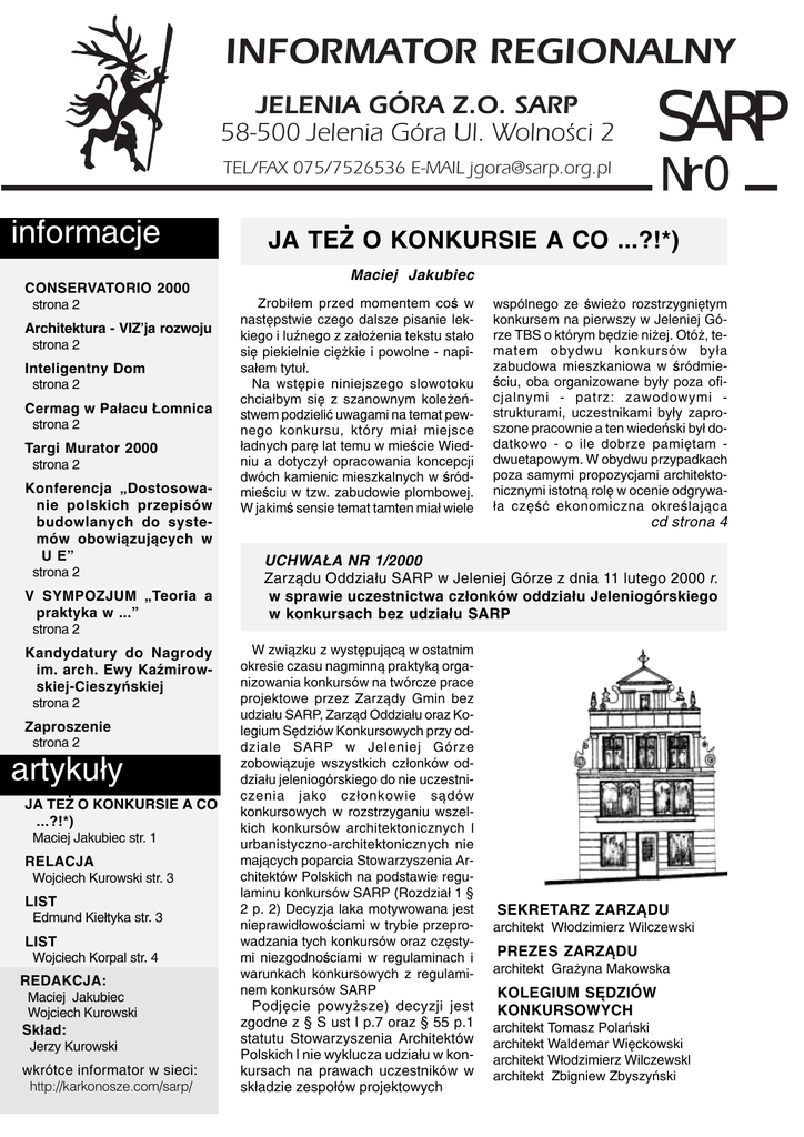 INFORMATOR REGIONALNY informacje CONSERVATORIO 2000 strona 2 Architektura - VIZ'ja rozwoju strona 2 Inteligentny Dom strona 2 Cermag w Pa³acu £omnica strona 2 Targi Murator 2000 strona 2 Konferencja Dostosowanie polskich przepisów budowlanych do systemów obowi¹zuj¹cych w U E strona 2 V SYMPOZJUM Teoria a praktyka w ... strona 2 Kandydatury do Nagrody im. arch. Ewy Kamirowskiej-Cieszyñskiej strona 2 Zaproszenie strona 2 artyku³y JA TE¯ O KONKURSIE A CO ...?!*) Maciej Jakubiec str. 1 RELACJA Wojciech Kurowski str. 3 LIST Edmund Kie³tyka str. 3 LIST Wojciech Korpal str. 4 REDAKCJA: Maciej Jakubiec Wojciech Kurowski Sk³ad: Jerzy Kurowski wkrótce informator w sieci: http://karkonosze.com/sarp/ JELENIA GÓRA Z.O. SARP 58-500 Jelenia Góra Ul. Wolnoœci 2 SARP TEL/FAX 075/7526536 E-MAIL [email protected] Nr 0 JA TE¯ O KONKURSIE A CO ...?!*) Maciej Jakubiec Zrobi³em przed momentem co w nastêpstwie czego dalsze pisanie lekkiego i lunego z za³o¿enia tekstu sta³o siê piekielnie ciê¿kie i powolne - napisa³em tytu³. Na wstêpie niniejszego slowotoku chcia³bym siê z szanownym kole¿eñstwem podzieliæ uwagami na temat pewnego konkursu, który mia³ miejsce ³adnych parê lat temu w miecie Wiedniu a dotyczy³ opracowania koncepcji dwóch kamienic mieszkalnych w ródmieciu w tzw. zabudowie plombowej. W jakim sensie temat tamten mia³ wiele wspólnego ze wie¿o rozstrzygniêtym konkursem na pierwszy w Jeleniej Górze TBS o którym bêdzie ni¿ej. Otó¿, tematem obydwu konkursów by³a zabudowa mieszkaniowa w ródmieciu, oba organizowane by³y poza oficjalnymi - patrz: zawodowymi strukturami, uczestnikami by³y zaproszone pracownie a ten wiedeñski by³ dodatkowo - o ile dobrze pamiêtam dwuetapowym. W obydwu przypadkach poza samymi propozycjami architektonicznymi istotn¹ rolê w ocenie odgrywa³a czêæ ekonomiczna okrelaj¹ca cd strona 4 UCHWA£A NR 1/2000 Zarz¹du Oddzia³u SARP w Jeleniej Górze z dnia 11 lutego 2000 r. w sprawie uczestnictwa cz³onków oddzia³u Jeleniogórskiego w konkursach bez udzia³u SARP W zwi¹zku z wystêpuj¹c¹ w ostatnim okresie czasu nagminn¹ praktyk¹ organizowania konkursów na twórcze prace projektowe przez Zarz¹dy Gmin bez udzia³u SARP, Zarz¹d Oddzia³u oraz Kolegium Sêdziów Konkursowych przy oddziale SARP w Jeleniej Górze zobowi¹zuje wszystkich cz³onków oddzia³u jeleniogórskiego do nie uczestniczenia jako cz³onkowie s¹dów konkursowych w rozstrzyganiu wszelkich konkursów architektonicznych l urbanistyczno-architektonicznych nie maj¹cych poparcia Stowarzyszenia Architektów Polskich na podstawie regulaminu konkursów SARP (Rozdzia³ 1 § 2 p. 2) Decyzja laka motywowana jest nieprawid³owociami w trybie przeprowadzania tych konkursów oraz czêstymi niezgodnociami w regulaminach i warunkach konkursowych z regulaminem konkursów SARP Podjêcie powy¿sze) decyzji jest zgodne z § S ust l p.7 oraz § 55 p.1 statutu Stowarzyszenia Architektów Polskich l nie wyklucza udzia³u w konkursach na prawach uczestników w sk³adzie zespo³ów projektowych SEKRETARZ ZARZ¥DU architekt W³odzimierz Wilczewski PREZES ZARZ¥DU architekt Gra¿yna Makowska KOLEGIUM SÊDZIÓW KONKURSOWYCH architekt Tomasz Polañski architekt Waldemar Wiêckowski architekt W³odzimierz Wilczewskl architekt Zbigniew Zbyszyñski INFORMACJE INFORMATOR Z.O. SARP JELENIA GÓRA CONSERVATORIO 2000 W dniach 24-26 lutego br. w Toruniu odby³y siê VI Targi Konserwacji Zabytków I Renowacji Miast, I Targi Muzealnictwa a tak¿e V Gie³da Zabytków. Imprezê pod nazw¹ CONSERVATORIO 2000 zorganizowan¹ przy wspó³udziale Miêdzynarodowych Targów Pomorza i Kujaw oraz Uniwersytetu Miko³aja Kopernika w Toru- niu patronatem objêli m.in. Minister Kultury i Sztuki, Minister Gospodarki oraz Generalny Konserwator Zabytków. Mo¿e kto z szanownego kole¿eñstwa zechcia³by podzieliæ siê wra¿eniami z imprezy? Tylko nie mówcie, ¿e nikogo z naszych tam nie by³o... seminarium "Architektura - VIZ'ja rozwoju" Na prze³omie kwietnia i maja br. we Wroc³awiu SARP, Autodesk Gmgh oraz Ster Projekt Sp. z o.o. planuj¹ zorganizowanie seminarium "Architektura - VIZ'ja rozwoju". Podczas imprezy prezentowane bêd¹ progra- my komputerowe 3D Studio VIZ, Architectural Deskop oraz Autocad 2000. Bli¿szych informacji na temat imprezy udzielaj¹: Katarzyna Faciszewska lub Edyta Wtorkiewicz (tel. 071 343 96 15, 0605 135 613). Inteligentny Dom W dniach 10-11 maja b.r. dwumiesiêcznik "Inteligentny Budynek" wraz ze Szko³¹ Inteligentnego Budownictwa pod patronatem CABA oraz IBG Europe organizuj¹ I Miêdzynarodow¹ Konferencjê "Inteligentny Dom" oraz V Miêdzynarodow¹ Konferencjê i wystawê "Inteligentny Budynek". Koszt imprezy obejmuj¹cy wy¿ywienie, materia³y konferencyjne, roczn¹ prenumeratê czasopisma "Inteligentny Budynek" oraz udzia³ w bankiecie oszacowano na 990 PZ/osobê (netto). Bli¿sze informacje udzielane s¹ pod tel. 071 341 93 27 lub w siedzibie oddzia³u. Cermag w Pa³acu £omnica W dniu 24 marca b.r. o godz. 15:00 SARP JG, JPBM Grupa 1 Wr-w, oraz Cermag Wr-w o/JG zapraszaj¹ na spotkanie w Pa³acu £omnica na prezentacje firm. Firma JPBM pragnie zaprezentowaæ sam¹ siebie ze szczególnym uwzglêdnieniem total quality managment, natomiast firma Cermag poza sob¹ przedstawi tak¿e rolê architekta w dzisiejszym handlu, oraz wyjani znaczenie stosowania nowych materia³ów wykoñczeniowych oraz technologii w projektach. Targi Murator 2000 W dniach 25-28 maja b.r. w Warszawie na terenie toru wycigów konnych wydawnictwo Murator organizuje targi Murator 2000 - Targi Budowlano-Instalacyj- ne. Zainteresowanych imprez¹ kierujemy pod telefon: 022 870 55 96, 870 56 47. Dostosowanie polskich przepisów budowlanych do systemów obowi¹zuj¹cych w Unii Europejskiej W dniach 24-26 maja w hotelu "Mr¹govia" w Mr¹gowie ITB pod patronatem MSWiA, Komitetu Integracji Europejskiej oraz Sejmowej Komisji Polityki Przestrzennej, Budowlanej i Mieszkaniowej organizuje konferencjê DOSTOSOWANIE