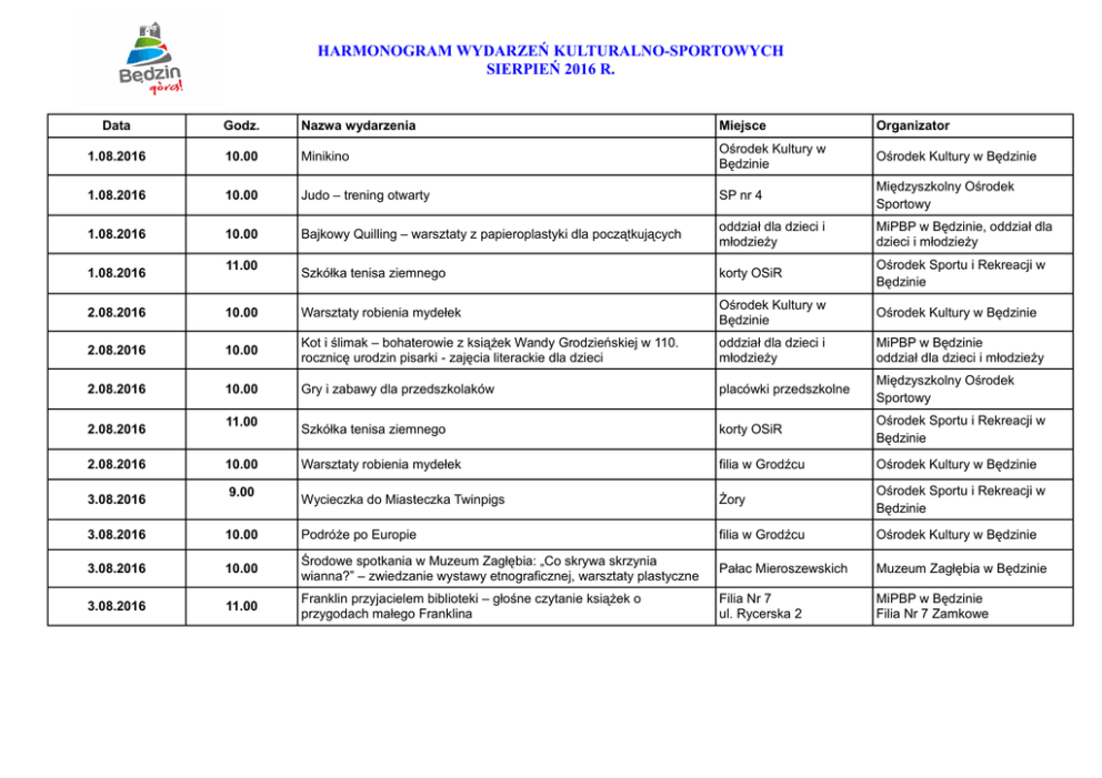 HARMONOGRAM WYDARZEŃ KULTURALNO-SPORTOWYCH SIERPIEŃ 2016 R. Data Godz. Nazwa wydarzenia Miejsce Organizator 1.08.2016 10.00 Minikino Ośrodek Kultury w Będzinie Ośrodek Kultury w Będzinie 1.08.2016 10.00 Judo – trening otwarty SP nr 4 Międzyszkolny Ośrodek Sportowy 1.08.2016 10.00 Bajkowy Quilling – warsztaty z papieroplastyki dla początkujących oddział dla dzieci i młodzieży MiPBP w Będzinie, oddział dla dzieci i młodzieży Szkółka tenisa ziemnego korty OSiR Ośrodek Sportu i Rekreacji w Będzinie 1.08.2016 11.00 2.08.2016 10.00 Warsztaty robienia mydełek Ośrodek Kultury w Będzinie Ośrodek Kultury w Będzinie 2.08.2016 10.00 Kot i ślimak – bohaterowie z książek Wandy Grodzieńskiej w 110. rocznicę urodzin pisarki - zajęcia literackie dla dzieci oddział dla dzieci i młodzieży MiPBP w Będzinie oddział dla dzieci i młodzieży 2.08.2016 10.00 Gry i zabawy dla przedszkolaków placówki przedszkolne Międzyszkolny Ośrodek Sportowy Szkółka tenisa ziemnego korty OSiR Ośrodek Sportu i Rekreacji w Będzinie Warsztaty robienia mydełek filia w Grodźcu Ośrodek Kultury w Będzinie Wycieczka do Miasteczka Twinpigs Żory Ośrodek Sportu i Rekreacji w Będzinie 2.08.2016 2.08.2016 3.08.2016 11.00 10.00 9.00 3.08.2016 10.00 Podróże po Europie filia w Grodźcu Ośrodek Kultury w Będzinie 3.08.2016 10.00 Środowe spotkania w Muzeum Zagłębia: „Co skrywa skrzynia wianna?” – zwiedzanie wystawy etnograficznej, warsztaty plastyczne Pałac Mieroszewskich Muzeum Zagłębia w Będzinie 3.08.2016 11.00 Franklin przyjacielem biblioteki – głośne czytanie książek o przygodach małego Franklina Filia Nr 7 ul. Rycerska 2 MiPBP w Będzinie Filia Nr 7 Zamkowe 3.08.2016 3.08.2016 11.00 11.00 Piłka nożna z Football Academy boiska OSiR Ośrodek Sportu i Rekreacji w Będzinie Szkółka tenisa ziemnego korty OSiR Ośrodek Sportu i Rekreacji w Będzinie 3.08.2016 11.30 Środowe spotkania w Muzeum Zagłębia: warsztaty wykonywania biżuterii na wzór ozdób z epoki brązu: zapinki, opaski oficyna przy Pałacu Mieroszewskich Muzeum Zagłębia w Będzinie 3.08.2016 12.00 Malarstwo sztalugowe Ośrodek Kultury w Będzinie Ośrodek Kultury w Będzinie 3.08.2016 12.00 Letnia łąka – zajęcia plastyczne inspirowane krajobrazami lata Filia Nr 4 ul. Pokoju 44 MiPBP w Będzinie Filia Nr 4 Łagisza 3.08.2016 15.00 Festyn na osiedlu Warpie Strefa Aktywności Rodzinnej Ośrodek Kultury w Będzinie Extreme City skatepark Ośrodek Sportu i Rekreacji w Będzinie 3.08.2016 19.00 4.08.2016 10.00 Warsztaty Lego filia w Grodźcu Ośrodek Kultury w Będzinie 4.08.2016 10.00 Turniej piłki nożnej plażowej –kat. SP boiska OSiR Międzyszkolny Ośrodek Sportowy Szkółka tenisa ziemnego korty OSiR Ośrodek Sportu i Rekreacji w Będzinie 4.08.2016 11.00 4.08.2016 13.00 Warsztaty Lego Ośrodek Kultury w Będzinie Ośrodek Kultury w Będzinie 4.08.2016 18.00 Joga wellness wzgórze zamkowe Ośrodek Sportu i Rekreacji w Będzinie 5.08.2016 10.00 Podróże po Europie Ośrodek Kultury w Będzinie Ośrodek Kultury w Będzinie 5.08.2016 10.00 Minikino filia w Grodźcu Ośrodek Kultury w Będzinie 5.08.2016 11.00 Spotkania i wędrówki z małym Albertem, bohaterem książek Gunilli Bergstrom Filia Nr 1 ul. Stalickiego 2 MiPBP w Będzinie Filia Nr 1 Ksawera 5.08.2016 11.00 Szkółka tenisa ziemnego korty OSiR Ośrodek Sportu i Rekreacji w Będzinie 8.08.2016 10.00 Konwent starych książek – zajęcia z edukacji czytelniczej dla dzieci oddział dla dzieci i młodzieży MiPBP w Będzinie oddział dla dzieci i młodzieży 9.08.2016 10.00 Gry i zabawy dla przedszkolaków placówki przedszkolne Międzyszkolny Ośrodek Sportowy 9.08.2016 10.00 Spektakl Teatru Trip filia w Grodźcu Ośrodek Kultury w Będzinie 9.08.2016 10.00 W zależności od pogody dla rozgrzania lub ochłody będzie bajka, wierszyk, rymy…, a co będzie – zobaczymy! – zajęcia literackie dla dzieci inspirowane piątą edycją akcji „Lato z książką” oddział dla dzieci i młodzieży MiPBP w Będzinie oddział dla dzieci i młodzieży 9.08.2016 12.00 Kto zagadkę zgadnie, tego nuda nie dopadnie: rebusy, łamigłówki i zagadki dla dzieci Filia Nr 4 ul. Pokoju 44 MiPBP w Będzinie Filia Nr 4 Łagisza 10.08.2016 10.00 Środowe spotkania w Muzeum Zagłębia: „Zamek warownią obronną” – zamek historyczny spacer wokół zamku, wejście na wieżę Muzeum Zagłębia w Będzinie Piłka nożna z Football Academy boiska OSiR Będzin Ośrodek Sportu i Rekreacji w Będzinie 10.08.2016 11.00 10.08.2016 11.30 Środowe spotkania w Muzeum Zagłębia: warsztaty plastyczne lepienie modeli zamku z gliny oficyna przy Pałacu Mieroszewskich Muzeum Zagłębia w Będzinie 10.08.2016 12.00 Malarstwo sztalugowe Ośrodek Kultury w Będzinie Ośrodek Kultury w Będzinie 10.08.2016 15.00 Festyn na placu 3 Maja Plac 3 Maja Ośrodek Kultury w Będzinie 11.08.2016 10.00 Warsztaty Lego Ośrodek Kultury w Będzinie Ośrodek Kultury w Będzinie 11.08.2016 10.00 Będzińskie podróże – podziemia będzińskie podziemia będzińskie MiPBP w Będzinie oddział dla dzieci i młodzieży 11.08.2016 10.00 Turniej piłki nożnej plażowej – kat. gimnazjum boiska OSiR Będzin Międzyszkolny Ośrodek Sportowy 11.08.2016 13.00 Warsztaty Lego filia w Grodźcu Ośrodek Kultury w Będzinie Joga wellness wzgórze zamkowe Ośrodek Sportu i Rekreacji w Będzinie 11.08.2016 18.00 12.08.2016 10.00 Minikino filia w Grodźcu Ośrodek Kultury w Będzinie 12.08.2016 10.00 Gry i zabawy dla przedszkolaków placówki przedszkolne Międzyszkolny Ośrodek Sportowy 12.08.2016 11.00 Franklin i jego przyjaciele nauczyć mogą Cię wiele- zajęcia literackie inspirowane opowieścią Paulette Bourgeois Filia Nr 1 ul. Stalickiego 2 MiPBP w Będzinie Filia Nr 1 Ksawera 12.08.2016 12.00 Balonowe stwory – sztuka modelowania balonowych stworków Filia Nr 4 ul. Pokoju 44 MiPBP w Będzinie Filia Nr 4 Łagisza 16.08.2016 10.00 W zależności od pogody dla rozgrzania lub ochłody b
