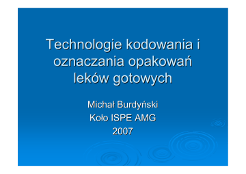 Technologie kodowania i oznaczania opakowań leków gotowych Michał Burdyński Koło ISPE AMG 2007 Na początek trochę faktów… Roczny wzrost przemysłu opakowań farmaceutycznych szacuje się na poziomie 5,3 % Wartość całego przemysłu opakowań farmaceutycznych wzrośnie do poziomu 24,3 miliardów dolarów w 2009 roku Ponad 80% zysków osiągniętych przez przemysł opakowań farmaceutycznych zostanie pochłonięte przez 10 największych krajów produkujących leki Powody wzrostu przemysłu opakowań farmaceutycznych Globalny wzrost konsumpcji leków Starzejące się społeczeństwa Odkrywanie nowych schorzeń i chorób PodwyŜszanie standardów i przyjmowanie nowych regulacji dotyczących opakowań leków, ich oznaczania, przechowywania i trwałości leków Wymagania dotyczące opakowań leków historyczne: dąŜenie do utrzymania odpowiedniej jakości leku dąŜenie do uzyskania jak najdłuŜszej daty waŜności leku obecne: ochrona przed zamianą i sfałszowaniem leku w opakowaniu ochrona przed dziećmi promowanie przestrzegania dziennego dawkowania leku ocena dokładności wydania leku Problemy wynikające z nieprzestrzegania wymagań dotyczących opakowań leków Śmierć 125000 Amerykanów rocznie Koszty na poziomie 100 miliardów dolarów rocznie 10% wszystkich hospitalizacji i 23% wizyt pielęgniarek domowych spowodowanych jest przez niezdolność pacjenta do przyjęcia takiej dawki leku jak przepisał lekarz Wybór technologii wykonania kodu paskowego na leku Producenci leków wybierają sposób umieszczenia kodu paskowego na opakowaniach produkowanych przez siebie leków, na podstawie trzech głównych kryteriów: rodzaj danych, które pojawią się w kodzie paskowym (cyfry, litery, specjalne symbole), wielkość dostępnej powierzchni na opakowaniu leku dla kodu paskowego, miejsce, gdzie zostanie umieszczony kod paskowy, Wymagania dodatkowe, które musi spełnić technologia, aby mogła zostać uŜyta do oznaczania opakowań leków Czytelność wydruków Niskie koszty DuŜa szybkość drukowania Łatwość uŜycia Niskoodpadowa Bezpieczeństwo pracowników Technologie stosowanie przy oznaczaniu opakowań leków Druk termiczny Druk atramentowy Druk igłowy Druk laserowy Laserowe oznaczanie w procesie ablacji Druk fleksograficzny Druk stosujący technikę zmiany koloru Druk termiczny Zalety: Najbardziej odpowiedni do nanoszenia kodów paskowych Uzyskiwane kody paskowe są wysokiej jakości, czytelne i czyste Z powodu braku uŜycia tuszu, nie ma spadku jakości kodu w trakcie procesu Sam druk nie generuje kosztów, jedynymi kosztami są koszty przeglądów urządzeń Urządzenia drukujące moŜna podłączyć do sieci monitorującej, ułatwiającej walidację metody oznaczania opakowań Szybkość wprowadzenia urządzeń do taśmy produkcyjnej Wady: Niska prędkość nanoszenia kodów paskowych na opakowania Druk termiczny Druk atramentowy Zalety: Najszybsza i najtańsza metoda do nanoszenia oznaczeń na opakowaniach leków Wady: Ograniczenia dotyczące materiałów, na których ta technologia moŜe zostać zastosowana Wymagane częste przeglądy urządzeń drukujących Produkcja duŜej ilości odpadów Wodne tusze mogą się rozmywać i tworzyć pasma Atramenty oparte na niewodnych rozpuszczalnikach powodują powstanie odblasku, który wpływa na to jak kod zostanie odczytany przez czytnik kodów Druk atramentowy Druk igłowy Wady: Wydrukowane kody są niskiej jakości Mały kontrast kodów zaleŜący od uŜytej taśmy barwiącej Druk laserowy Wady: Urządzenia drukujące znajdują się poza linią produkcyjną Wymagany osobny aplikator nalepek przy linii produkcyjnej MoŜliwość łuszczenia się tonera z nalepki NiemoŜność uŜycia tej metody do oznaczania leków o długich terminach waŜności Druk laserowy Laserowe oznaczanie w procesie ablacji W tej technologii uŜywa się promienia lasera o duŜej mocy do usunięcia warstwy czarnego tuszu z nalepki w procesie ablacji. Ostatecznie uzyskujemy białe napisy lub kod paskowy na czarnym tle. Wady: Wysoka emisja zanieczyszczeń powstających przy odparowywaniu tuszu Problemy z uzyskaniem wyŜszych poziomów rozdzielczości powstałych kodów paskowych. Laserowe oznaczanie w procesie ablacji Druk fleksograficzny Zalety: Wysoka jakość druku MoŜliwość druku małych znaków Wady: Kosztowny w uŜyciu i utrzymaniu Potrzebna nowa matryca przy kaŜdej zmianie w drukowanym oznaczeniu Druk fleksograficzny Technologia zmiany koloru Zmiana koloru barwnika uŜytego do produkcji nalepki powodowana jest światłem laserowym o małej mocy Zalety metody: Brak kontaktu urządzenia z opakowaniem leku Wysoka rozdzielczość tekstu, kodów paskowych i obrazków Nieograniczona ilość materiałów, na których moŜna uŜyć tej metody Niska emisja zanieczyszczeń, nietoksyczność i przyjazność środowisku Tania w utrzymaniu DuŜa stabilność i trwałość produkowanych oznaczeń Wysoka szybkość druku Technologia zmiany koloru Porównanie technologii Druk termiczny Druk atramento wy Druk igł igłowy Druk laserowy Laserowe oznaczanie w procesie ablacji Druk fleksofleksograficz ny Druk wykorzystują wykorzystujący technologię technologię zmianę zmianę koloró kolorów + + + ++ ++ + -+ + + + + -- + + + + -+ - + + + + PrzyjaPrzyjazność zność środowisku + -- - - - - + BezpieBezpieczeń czeństwo pracopracownikó wników + + + + + + + Jakość Jakość Koszt Szybkość Szybkość Łatwość atwość uŜycia Podsumowanie Najlepszą metodą nanoszenia oznaczeń na opakowaniach leków jest metoda wykorzystująca zmianę koloru barwnika pod wpływem promieniowania laserowego