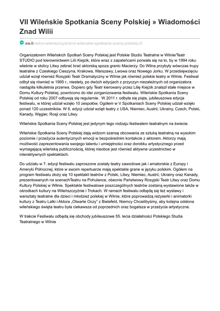 VII Wileńskie Spotkania Sceny Polskiej » Wiadomości Znad Wilii zw.lt /wilno-wilenszczyzna/vii-wilenskie-spotkania-sceny-polskiej-2/ Organizatorem Wileńskich Spotkań Sceny Polskiej jest Polskie Studio Teatralne w Wilnie/Teatr STUDIO pod kierownictwem Lilii Kiejzik, która wraz z zapaleńcami porwała się na to, by w 1994 roku właśnie w stolicy Litwy zebrać brać aktorską spoza granic Macierzy. Do Wilna przybyły wówczas trupy teatralne z Czeskiego Cieszyna, Krakowa, Warszawy, Lwowa oraz Nowego Jorku. W przedsięwzięciu udział wziął również Rosyjski Teatr Dramatyczny w Wilnie jak również polskie teatry w Wilnie. Festiwal odbył się również w 1995 r., niestety, po dwóch edycjach z przyczyn niezależnych od organizatora nastąpiła kilkuletnia przerwa. Dopiero gdy Teatr kierowany przez Lilię Kiejzik znalazł stałe miejsce w Domu Kultury Polskiej, powrócono do idei zorganizowania festiwalu. Wileńskie Spotkania Sceny Polskiej od roku 2007 odbywją się regularnie. W 2011 r. odbyła się piąta, jubileuszowa edycja festiwalu, w której udział wzięło 10 zespołów. Ogółem w V Spotkaniach Sceny Polskiej udział wzięło ponad 120 uczestników. W 6. edycji udział wzięli teatry z USA, Niemiec, Austrii, Ukrainy, Czech, Polski, Kanady, Węgier, Rosji oraz Litwy. Wileńskie Spotkania Sceny Polskiej jest jedynym tego rodzaju festiwalem teatralnym na świecie. Wileńskie Spotkania Sceny Polskiej dają widzom szansę obcowania ze sztuką teatralną na wysokim poziomie i przeżycia autentycznych emocji w bezpośrednim kontakcie z aktorem. Aktorzy mają możliwość zaprezentowania swojego talentu i umiejętności oraz dorobku artystycznego przed wymagającą wileńską publicznością, której nieobce jest również aktywne uczestnictwo w interaktywnych spektaklach. Do udziału w 7. edycji festiwalu zaproszone zostały teatry zawodowe jak i amatorskie z Europy i Ameryki Północnej, które w swoim repertuarze mają spektakle grane w języku polskim. Ogółem na program festiwalu złoży się 10 spektakli teatrów z Polski, Litwy, Niemiec, Austrii, Ukrainy oraz Kanady, prezentowanych na scenachTeatru na Pohulance, obecnie Państwowy Rosyjski Teatr Litwy oraz Domu Kultury Polskiej w Wilnie. Spektakle festiwalowe poszczególnych teatrów zostaną wystawione także w ośrodkach kultury na Wileńszczyźnie i Trokach. W ramach festiwalu odbędą się też wystawy i warsztaty teatralne dla dzieci i młodzież polskiej w Wilnie, które poprowadzą reżyserki i animatorki kultury z Teatru Lalki i Aktora „Otwarte Oczy” z Bielefeld, Niemcy Chcielibyśmy, aby kolejna odsłona wileńskiego święta teatru była ciekawsza od poprzednich oraz bogatsza w przeżycia artystyczne. W trakcie Festiwalu odbędą się obchody jubileuszowe 55. lecia działalności Polskiego Studia Teatralnego w Wilnie