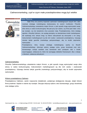 Calimeromarketing, czyli w czym małe przedsiębiorstwa mogą być wielkie Karen Romme MT Biznes, Warszawa, lipiec 2007 Calimeromarketing, czyli w czym małe przedsiębiorstwa mogą być wielkie Karen Romme Małe firmy nie powinny kopiować zachowań marketingowych dużych firm, tylko rozwinąć strategię marketingową dostosowaną do swoich możliwości. Filozofia Calimeromarketingu uświadamia małym firmom, w jaki sposób mogą wykorzystać swoje silne strony w walce konkurencyjnej. Nie jest przy tym ważne, czy firma jest mała i chce się rozwijać, czy też świadomie chce pozostać małą. Przedsiębiorstwa, które działają zgodnie z filozofią Calimero, nie wydają pieniędzy na standardowe środki marketingowe, ale wybierają inne, tańsze drogi, by klienci zdecydowali się skorzystać z ich usług. Instrumentami marketingowymi są dla nich osoba i osobowość przedsiębiorcy. Używają również taktyk guerrilla (marketingu partyzanckiego), aby te środki optymalnie wykorzystać. Przedsiębiorca, który buduje strategię marketingową opartą na filozofii Calimeromarketingu: dokonuje wyboru zasięgu rynku, grupy docelowej oraz celu biznesowego; buduje osobiste oraz biznesowe sieci powiązań; dba o środki wspomagające, zwłaszcza te, które nie wymagają nakładów finansowych; dba o relacje z klientami, zwłaszcza aktualnymi. Calimeromarketing Filozofia Calimeromarketingu uświadamia małym firmom, w jaki sposób mogą wykorzystać swoje silne strony w walce konkurencyjnej. Instrumentami marketingowymi są dla nich osoba i osobowość przedsiębiorcy. Używają również taktyk guerrilla (marketingu partyzanckiego), aby te środki optymalnie wykorzystać. Wybory przedsiębiorcy Calimero Przedsiębiorca Calimero, zanim rozpocznie działalność, podejmuje strategiczne decyzje, dzięki którym firma przetrwa i będzie w stanie się rozwijać. Decyzje dotyczą wyboru celu biznesowego, grupy docelowej oraz zasięgu rynku. 1 Questuspoint Sp. z o.o. ul. Dąbrowskiego 247/249 93-231 Łódź Tel. 48 42 675 99 83 [email protected] www.questuspoint.com Calimeromarketing, czyli w czym małe przedsiębiorstwa mogą być wielkie Karen Romme MT Biznes, Warszawa, lipiec 2007 Sieci powiązań Firma, która chce się rozwijać, powinna zgromadzić wokół siebie pewną liczbę relacji i powiązań. W związku z tym przedsiębiorcy Calimero poświęcają stosunkowo dużą część swojego czasu i energii na budowę i utrzymanie rozległej sieci powiązań i relacji. Środki wspomagające Do tego, by w optymalny sposób realizować zaplanowane zadania, przedsiębiorcy Calimero potrzebują materiałów pomocniczych, które wspierają osobisty kontakt. Konsumenci i firmy sami regularnie i aktywnie poszukują dostawcy. Przedsiębiorca Calimero wybiera media, które ułatwiają potencjalnym klientom znalezienie małego przedsiębiorstwa. Relacje z klientami Przedsiębiorcy Calimero skupiają się na budowie długotrwałych relacji z klientami, ponieważ, między innymi, nowi klienci to koszty związane z nawiązaniem kontaktu, których nie trzeba ponosić przy starych kontaktach. Jeśli przedsiębiorca Calimero pozyskuje nowych klientów, robi to za pomocą środków, które umożliwiają nawiązanie osobistego kontaktu. 2 Questuspoint Sp. z o.o. ul. Dąbrowskiego 247/249 93-231 Łódź Tel. 48 42 675 99 83 [email protected] www.questuspoint.com Calimeromarketing, czyli w czym małe przedsiębiorstwa mogą być wielkie Karen Romme MT Biznes, Warszawa, lipiec 2007 Calimeromarketing Na marketing składają się czynności, które razem przyczyniają się do tego, że firma wychodzi naprzeciw potrzebom klientów. Zaspokojenie potrzeb klientów jest głównym zadaniem firmy, wobec tego marketing jest istotną częścią działalności przedsiębiorcy. Marketing jest niezbędny, by firma przetrwała i rozwijała się. Samodzielni przedsiębiorcy oraz właściciele małych firm rezygnują z marketingu lub ograniczają go do minimum, ponieważ sądzą, że nie są w stanie konkurować o klienta z dużymi firmami. Tymczasem małe firmy, zamiast rezygnować z marketingu, powinny dostosować go do swoich potrzeb i możliwości. O tym, w jaki sposób to zrobić, mówi filozofia Calimeromarketingu. Calimero to uosobienie małej firmy, która czuje się nieporadna w walce rynkowej z dużymi przedsiębiorstwami. Calimeromarketing uświadamia przedsiębiorcom, że małe firmy nie powinny kopiować zachowań marketingowych dużych firm, ale powinny rozwinąć własną strategię. Strategia marketingowa firm Calimero wykorzystuje mocne strony małych przedsiębiorstw. Firmy Calimero przeznaczają na marketing niewielką część budżetu, ale to wystarczy, aby stworzyć własną strategię marketingową. Nie jest również ważne, czy firma jest mała i chce się rozwijać, czy też świadomie chce pozostać małą. Postępowanie zgodnie z filozofią Calimeromarketingu sprawia, że małe przedsiębiorstwo, które jest energiczne i kreatywne, może na rynku konkurować z dużymi firmami. Podczas porównania możliwości małych i dużych firm w dziedzinie marketingu, wydaje się, że duże firmy mają ku temu lepsze warunki i małe firmy nie mają szans z nimi konkurować. Nie jest to prawda. Małe firmy mają szereg zalet, dzięki którym są w stanie wygrać z dużymi konkurentami walkę o klienta: - przynoszą zysk przy stałej, ograniczonej liczbie klientów; - są w stanie zaoferować niższe ceny; - reagują na indywidualne potrzeby klientów; - są elastyczne; - dysponują specjalistyczną wiedzą; - utrzymują bliskie kontakty z klientami. 3 Questuspoint Sp. z o.o. ul. Dąbrowskiego 247/249 93-231 Łódź Tel. 48 42 675 99 83 [email protected] www.questuspoint.com Calimeromarketing, czyli w czym małe przedsiębiorstwa mogą być wielkie Karen Romme MT Biznes, Warszawa, lipiec 2007 „W 1999 roku ukazały się „Społeczeństwo marzeń” Rolfa Jensena i „Gospodarka przeżyć” Josepha Pine’a i Jam