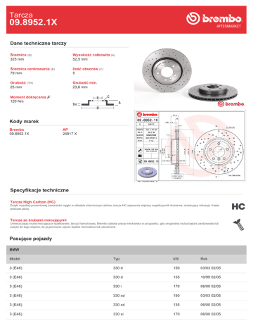 Tarcza 09.8952.1X Dane techniczne tarczy Średnica (Ø) 325 mm Wysokość całkowita (A) 52,5 mm Średnica centrowania (B) 79 mm Ilość otworów (C) 5 Grubość (TH) 25 mm Grubość min. 23,6 mm Moment dokręcania 120 Nm Kody marek Brembo 09.8952.1X AP 24817 X Specyfikacje techniczne Tarcza High Carbon (HC) Dzięki wysokiej procentowej zawartości węgla w składzie chemicznym żeliwa, tarcza HC zapewnia większy współczynnik tłumienia, redukujący wibracje i hałas podczas jazdy. Tarcza ze śrubami mocującymi Umieszczając śrubę mocującą w opakowaniu tarczy hamulcowej, Brembo ułatwia pracę mechanika w przypadku, gdy oryginalna śruba będzie zardzewiała lub zużyta do tego stopnia, że jej ponowne użycie będzie niemożliwe lub utrudnione. Pasujące pojazdy BMW Model Typ kW Rok 3 (E46) 330 d 150 03/03 02/05 3 (E46) 330 d 135 10/99 02/05 3 (E46) 330 i 170 06/00 02/05 3 (E46) 330 xd 150 03/03 02/05 3 (E46) 330 xd 135 06/00 02/05 3 (E46) 330 xi 170 06/00 02/05 3 Convertible (E46) 330 Cd 150 08/05 12/07 3 Convertible (E46) 330 Ci 170 06/00 12/07 3 Coupe (E46) 330 Cd 150 03/03 07/06 3 Coupe (E46) 330 Ci 170 06/00 07/06 3 Coupe (E46) 330 xi 170 06/00 07/06 3 Touring (E46) 330 d 150 03/03 02/05 3 Touring (E46) 330 d 135 10/99 02/05 3 Touring (E46) 330 i 170 06/00 02/05 3 Touring (E46) 330 xd 150 03/03 02/05 3 Touring (E46) 330 xd 135 06/00 02/05 3 Touring (E46) 330 xi 170 06/00 02/05 Z4 (E85) 3.0 si 195 01/06 12/08 Z4 Coupe (E86) 3.0 si 195 03/06 01/09 Numery OE Pasujące kody OE BMW 34101166071 BMW 34116769305 BMW 34116855156 BMW 34116864047