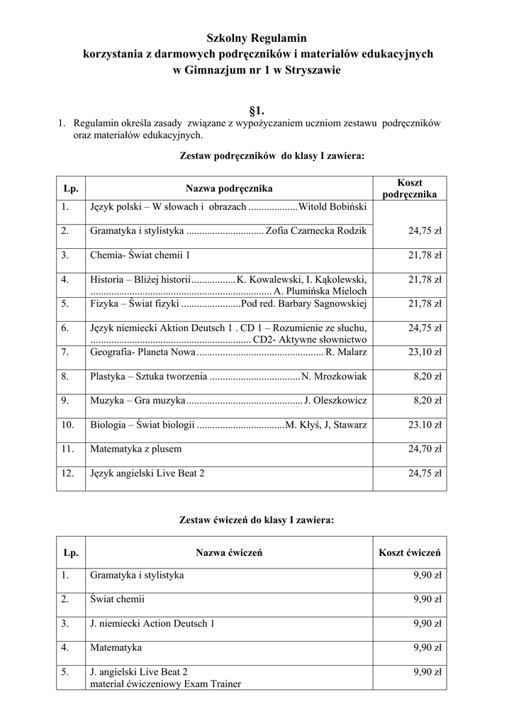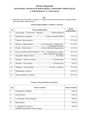 Szkolny Regulamin korzystania z darmowych podręczników i materiałów edukacyjnych w Gimnazjum nr 1 w Stryszawie §1. 1. Regulamin określa zasady związane z wypożyczaniem uczniom zestawu podręczników oraz materiałów edukacyjnych. Zestaw podręczników do klasy I zawiera: Nazwa podręcznika Lp. Koszt podręcznika 1. Język polski – W słowach i obrazach ................... Witold Bobiński 2. Gramatyka i stylistyka .............................. Zofia Czarnecka Rodzik 24,75 zł 3. Chemia- Świat chemii 1 21,78 zł 4. Historia – Bliżej historii ................. K. Kowalewski, I. Kąkolewski, ...................................................................... A. Plumińska Mieloch Fizyka – Świat fizyki .......................Pod red. Barbary Sagnowskiej 21,78 zł 24,75 zł 7. Język niemiecki Aktion Deutsch 1 . CD 1 – Rozumienie ze słuchu, .............................................................. CD2- Aktywne słownictwo Geografia- Planeta Nowa ................................................. R. Malarz 8. Plastyka – Sztuka tworzenia ................................... N. Mrozkowiak 8,20 zł 9. Muzyka – Gra muzyka ............................................. J. Oleszkowicz 8,20 zł 10. Biologia – Świat biologii .................................. M. Kłyś, J, Stawarz 23.10 zł 11. Matematyka z plusem 24,70 zł 12. Język angielski Live Beat 2 24,75 zł 5. 6. 21,78 zł 23,10 zł Zestaw ćwiczeń do klasy I zawiera: Nazwa ćwiczeń Lp. Koszt ćwiczeń 1. Gramatyka i stylistyka 9,90 zł 2. Świat chemii 9,90 zł 3. J. niemiecki Action Deutsch 1 9,90 zł 4. Matematyka 9,90 zł 5. J. angielski Live Beat 2 materiał ćwiczeniowy Exam Trainer 9,90 zł 2. Rodzice uczniów zostają zaznajomieni z treścią Regulaminu podczas pierwszego spotkania organizacyjnego w roku szkolnym. 3. Wypożyczanie podręczników do domu i jego zwrot jest odnotowywane przez bibliotekarza. 4. Wypożyczenie podręczników, materiałów edukacyjnych i ćwiczeniowych dla uczniów danej klasy odbywa się w bibliotece szkolnej z udziałem wychowawcy. 5. Podręczniki, materiały edukacyjne, materiały ćwiczeniowe stanowią własność szkoły. 6. Dołączona do podręcznika lub materiałów edukacyjnych płyta CD stanowi integralną część podręcznika lub materiałów edukacyjnych i należy ją zwrócić wraz z podręcznikiem lub materiałem edukacyjnym. 7. Podręczniki, materiały edukacyjne i materiały ćwiczeniowe powinny być używane przez okres minimum 3 lat. § 2. 1. Do wypożyczania podręczników lub materiałów edukacyjnych uprawnieni są wszyscy uczniowie szkoły, którzy rozpoczęli naukę w roku szkolnym 2015/2016 lub później. 2. Wypożyczenie podręczników następuje na początku każdego roku szkolnego najpóźniej 15 września. 3. Przekazując podręczniki i materiały edukacyjne uczniom, bibliotekarz ma obowiązek odebrania podpisanego przez rodzica oświadczenia, którego wzór stanowi Załącznik nr 1 do Regulaminu: 4. Bibliotekarz informuje uczniów/rodziców, aby przed wypożyczeniem obowiązkowo sprawdzili stan podręczników lub materiałów edukacyjnych. Ewentualne uszkodzenia należy natychmiast zgłosić bibliotekarzowi. 5. Zestawy podręczników i materiały edukacyjne wypożyczane są na okres 10 miesięcy (jednego roku szkolnego). 6. Termin zwrotu podręczników i materiałów edukacyjnych na tydzień przed zakończeniem roku szkolnego. § 3. 1. W przypadku gdy uczeń w trakcie roku rezygnuje z nauki w szkole, zobowiązany jest zwrócić otrzymany zestaw podręczników lub materiały edukacyjne. 2. Uczeń jest zobowiązany zwrócić szkole podręczniki w stanie nie pogorszonym, pomijając zużycie będące następstwem prawidłowego używania. 3. Zabrania się dokonywania jakichkolwiek wpisów i notatek w podręcznikach. 4. Zabrania się wyrywania kartek z podręcznika, sklejania kartek, przycinania itd. oraz innych czynności, które powodować mogą uszkodzenie lub zniszczenie podręcznika. 5. Przez zniszczenie podręcznika lub materiałów edukacyjnych rozumie się umyślne lub nieumyślne spowodowanie wady fizycznej, która pomniejsza wartość użytkową podręcznika lub materiałów edukacyjnych i uniemożliwia ich wykorzystanie. 6. W przypadku uszkodzenia, zniszczenia lub niezwrócenia podręcznika lub materiału edukacyjnego w terminie wskazanym w powyższym regulaminie Gimnazjum nr 1 może żądać od rodziców ucznia zwrotu: – kosztu zakupu podręcznika, materiału edukacyjnego i zeszytu ćwiczeń. Kwota ta stanowi dochód budżetu państwa. 7. Wartość uszkodzonych lub zniszczonych podręczników i materiałów edukacyjnych określa Dyrektor gimnazjum. 8. W celu uzyskania od Rodziców kosztu uszkodzonych lub zniszczonych podręczników / materiałów edukacyjnych Biblioteka, stosownie do treści Regulaminu korzystania z darmowych podręczników, wysyła do Rodzica wezwanie do zapłaty, którego treść stanowi Załącznik nr 2 do niniejszego Regulaminu. §4. 1. Organem uprawnionym do zmiany Regulaminu jest Dyrektor szkoły. 2. Regulamin wchodzi w życie 1 września 2015r.