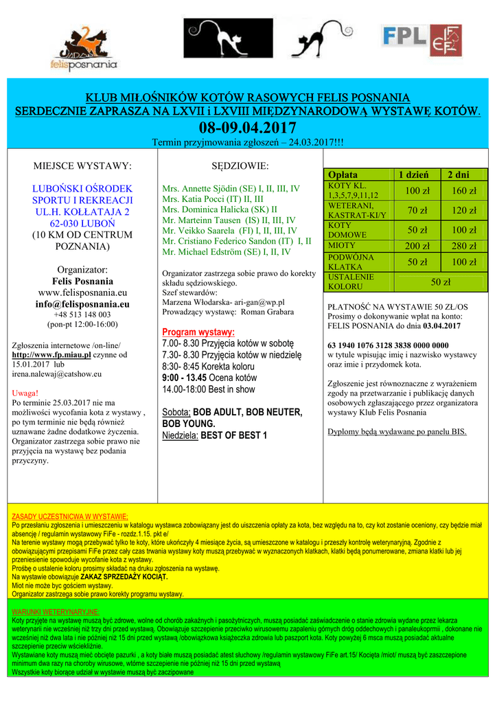 KLUB MIŁO NIKÓW KOTÓW RASOWYCH FELIS POSNANIA MI OŚNIKÓW SERDECZNIE ZAPRASZA NA LXVII i LXVIII MIĘDZYNARODOW MI DZYNARODOWĄ DZYNARODOW WYSTAWĘ WYSTAW KOTÓW. KOTÓW 08-09.04.2017 Termin przyjmowania zgłoszeń – 24.03.2017!!! MIEJSCE WYSTAWY: LUBOŃSKI OŚRODEK SPORTU I REKREACJI UL.H. KOŁŁATAJA 2 62-030 LUBOŃ (10 KM OD CENTRUM POZNANIA) Organizator: Felis Posnania www.felisposnania.eu [email protected] +48 513 148 003 (pon-pt 12:00-16:00) Zgłoszenia internetowe /on-line/ http://www.fp.miau.pl czynne od 15.01.2017 lub [email protected] Uwaga! Po terminie 25.03.2017 nie ma możliwości wycofania kota z wystawy , po tym terminie nie będą również uznawane żadne dodatkowe życzenia. Organizator zastrzega sobie prawo nie przyjęcia na wystawę bez podania przyczyny. SĘDZIOWIE: Mrs. Annette Sjödin (SE) I, II, III, IV Mrs. Katia Pocci (IT) II, III Mrs. Dominica Halicka (SK) II Mr. Marteinn Tausen (IS) II, III, IV Mr. Veikko Saarela (FI) I, II, III, IV Mr. Cristiano Federico Sandon (IT) I, II Mr. Michael Edström (SE) I, II, IV Organizator zastrzega sobie prawo do korekty składu sędziowskiego. Szef stewardów: Marzena Włodarska- [email protected] Prowadzący wystawę: Roman Grabara Program wystawy: 7.00- 8.30 Przyjęcia kotów w sobotę 7.30- 8.30 Przyjęcia kotów w niedzielę 8:30- 8:45 Korekta koloru 9:00 - 13.45 Ocena kotów 14.00-18:00 Best in show Sobota; BOB ADULT, BOB NEUTER, BOB YOUNG. Niedziela: BEST OF BEST 1 Opłata KOTY KL. 1,3,5,7,9,11,12 WETERANI, KASTRAT-KI/Y KOTY DOMOWE MIOTY PODWÓJNA KLATKA USTALENIE KOLORU 1 dzień 2 dni 100 zł 160 zł 70 zł 120 zł 50 zł 100 zł 200 zł 280 zł 50 zł 100 zł 50 zł PŁATNOŚĆ NA WYSTAWIE 50 ZŁ/OS Prosimy o dokonywanie wpłat na konto: FELIS POSNANIA do dnia 03.04.2017 63 1940 1076 3128 3838 0000 0000 w tytule wpisując imię i nazwisko wystawcy oraz imie i przydomek kota. Zgłoszenie jest równoznaczne z wyrażeniem zgody na przetwarzanie i publikację danych osobowych zgłaszającego przez organizatora wystawy Klub Felis Posnania Dyplomy będą wydawane po panelu BIS. ZASADY UCZESTNICWA W WYSTAWIE; Po przesłaniu zgłoszenia i umieszczeniu w katalogu wystawca zobowiązany jest do uiszczenia opłaty za kota, bez względu na to, czy kot zostanie oceniony, czy będzie miał absencję / regulamin wystawowy FiFe - rozdz.1.15. pkt e/ Na terenie wystawy mogą przebywać tylko te koty, które ukończyły 4 miesiące życia, są umieszczone w katalogu i przeszły kontrolę weterynaryjną. Zgodnie z obowiązującymi przepisami FiFe przez cały czas trwania wystawy koty muszą przebywać w wyznaczonych klatkach, klatki będą ponumerowane, zmiana klatki lub jej przeniesienie spowoduje wycofanie kota z wystawy. Prośbę o ustalenie koloru prosimy składać na druku zgłoszenia na wystawę. Na wystawie obowiązuje ZAKAZ SPRZEDAŻY KOCIĄT. Miot nie może byc gościem wystawy. Organizator zastrzega sobie prawo korekty programu wystawy. WARUNKI WETERYNARYJNE: Koty przyjęte na wystawę muszą być zdrowe, wolne od chorób zakaźnych i pasożytniczych, muszą posiadać zaświadczenie o stanie zdrowia wydane przez lekarza weterynarii nie wcześniej niż trzy dni przed wystawą. Obowiązuje szczepienie przeciwko wirusowemu zapaleniu górnych dróg oddechowych i panaleukoprmii , dokonane nie wcześniej niż dwa lata i nie później niż 15 dni przed wystawą /obowiązkowa książeczka zdrowia lub paszport kota. Koty powyżej 6 msca muszą posiadać aktualne szczepienie przeciw wściekliźnie. Wystawiane koty muszą mieć obcięte pazurki , a koty białe muszą posiadać atest słuchowy /regulamin wystawowy FiFe art.15/ Kocięta /miot/ muszą być zaszczepione minimum dwa razy na choroby wirusowe, wtórne szczepienie nie później niż 15 dni przed wystawą Wszystkie koty biorące udział w wystawie muszą być zaczipowane